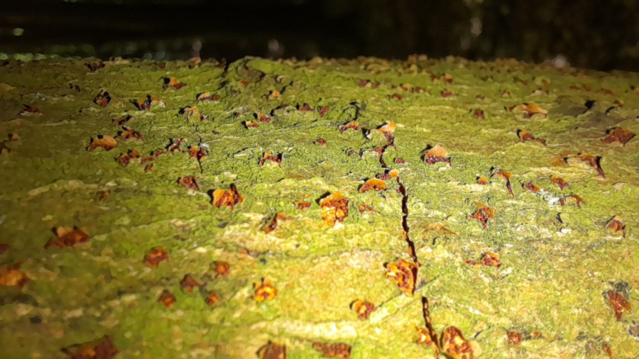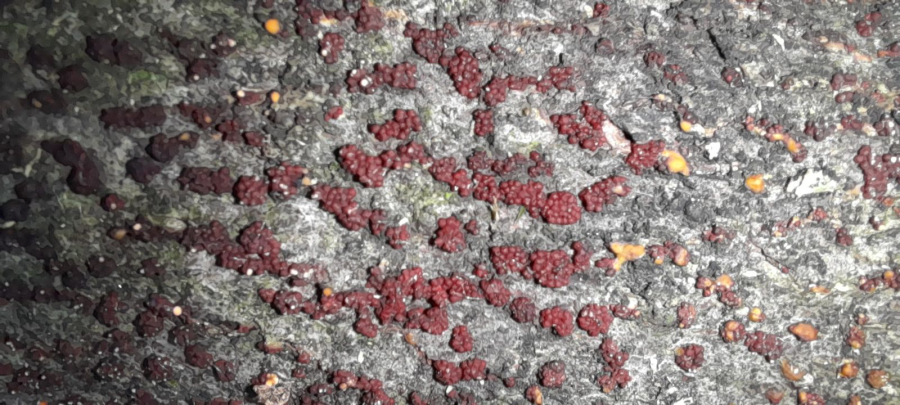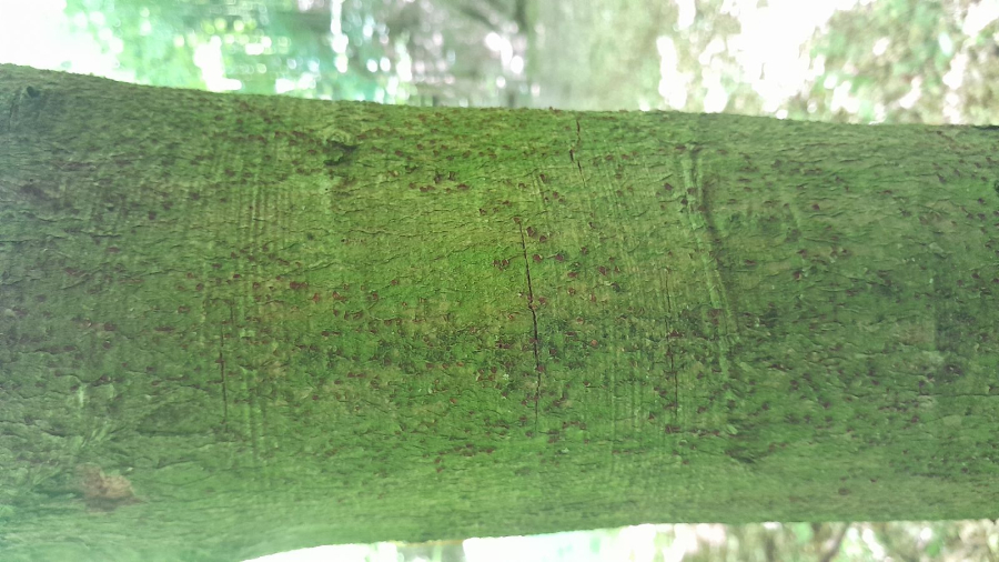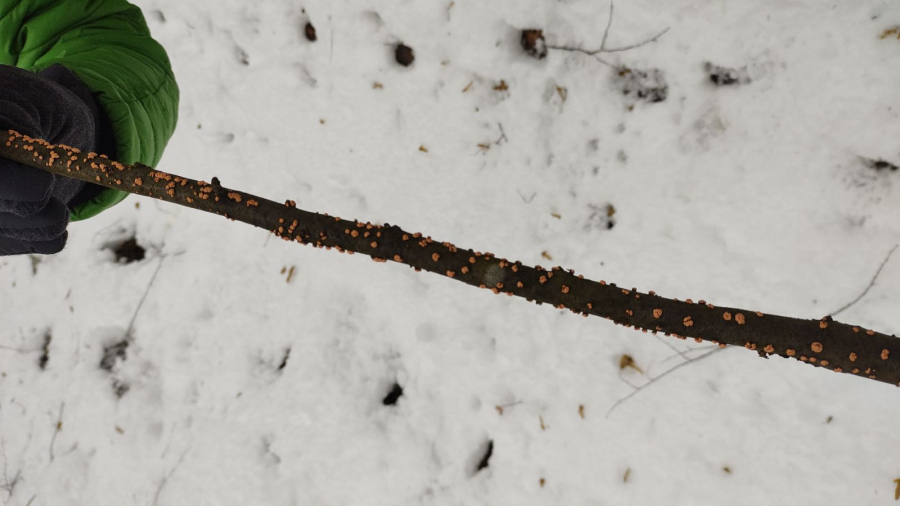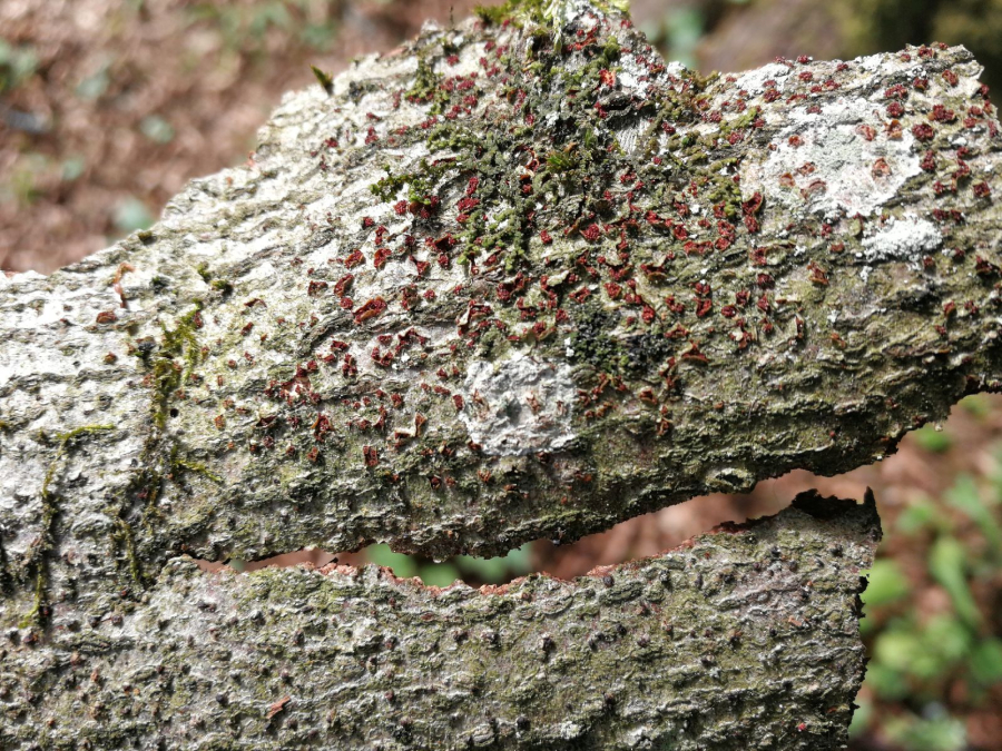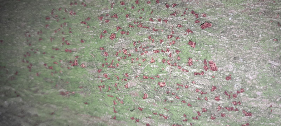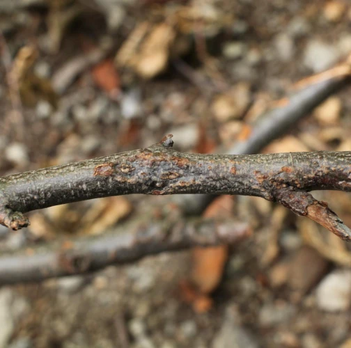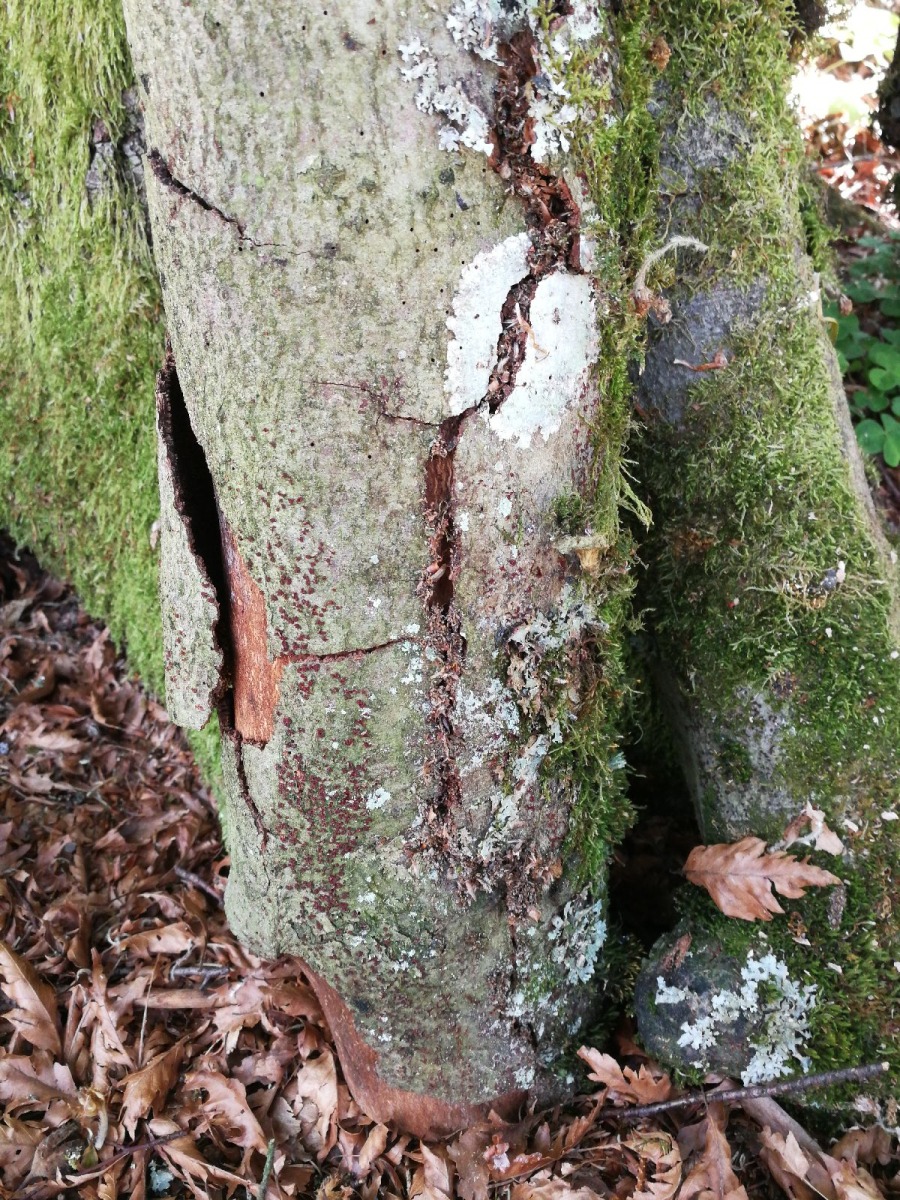 The bark is infected through wounds. Black tarry spots and orange-reddish fruiting bodies of the fungus are often found in the place of infection. The mycelium causes dying off of the bark and cambium cells. The tree defends itself by forming a callus, thus creating a canker tumor. Leaves above the place of infection are smaller and have symptoms of chlorosis. After girdling, the whole part above the infected place dies off. Attacked trees are necessary to be continuously removed from the stand.