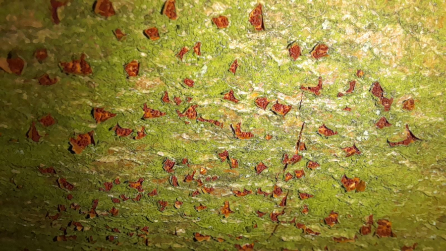 Black tarry spots and orange-reddish fruiting bodies of the fungus are often found in the place of infection. Leaves above the place of infection are smaller and have symptoms of chlorosis.