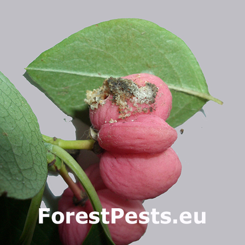 Affected Euonymus europaeus berries display internal feeding damage, hollowed interiors. Round holes are visible on the berries, and tiny larvae are often present.Frass may be present on the surface of the berries.