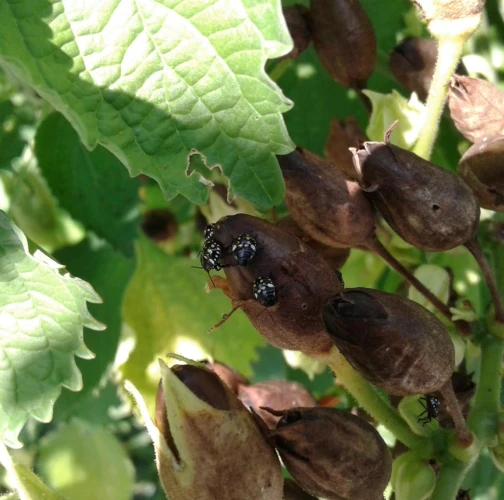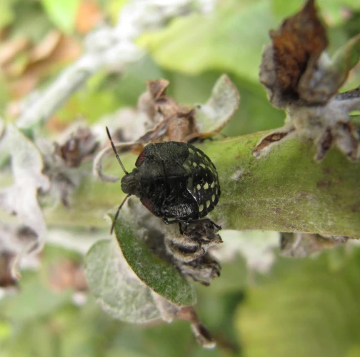The insect attacks over 150 host plant species, including fruit trees, vegetables (e.g., tomatoes, peppers), cereals, and fruits. Adults and nymphs pierce plant tissues with their piercing-sucking mouthparts, feeding on sap from stems, leaves, and fruits. This feeding causes deformation, discoloration, and premature fruit drop, significantly impacting the market value and yield of crops. In addition to direct feeding damage, N. viridula may act as a vector for fungal pathogens.