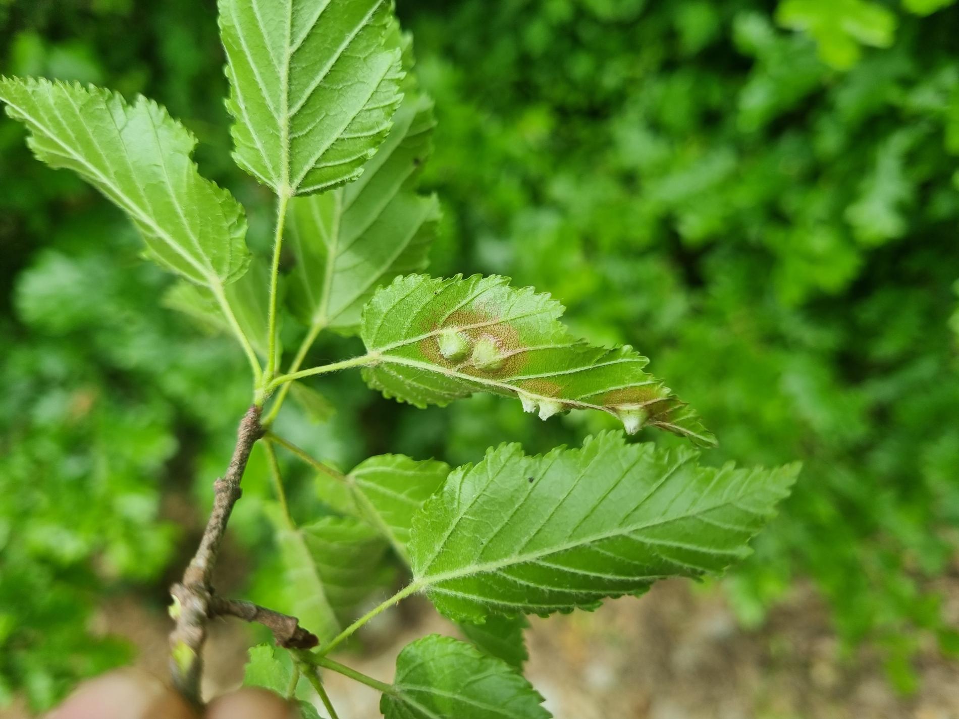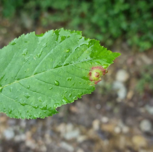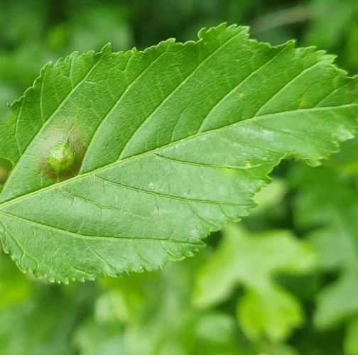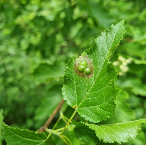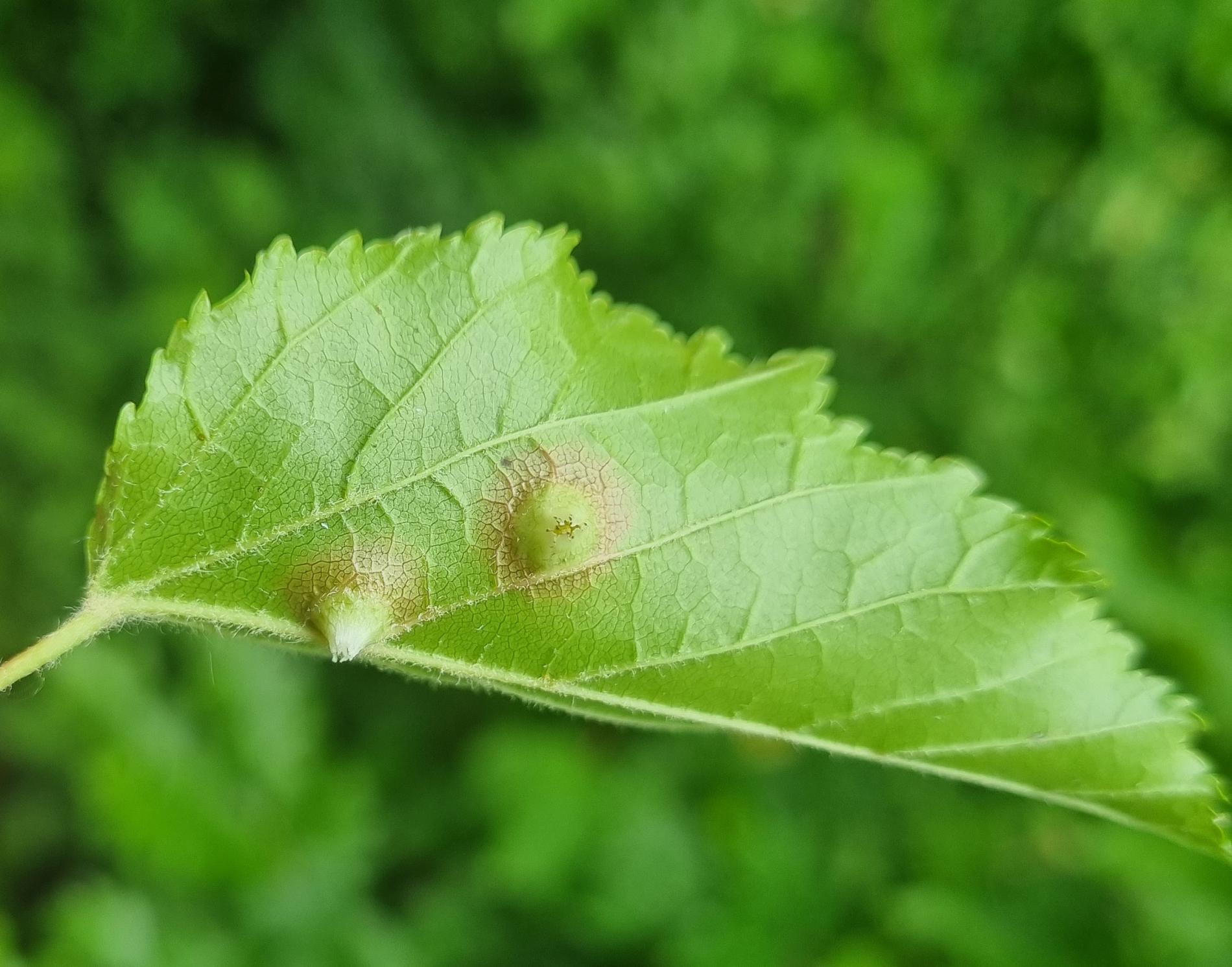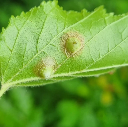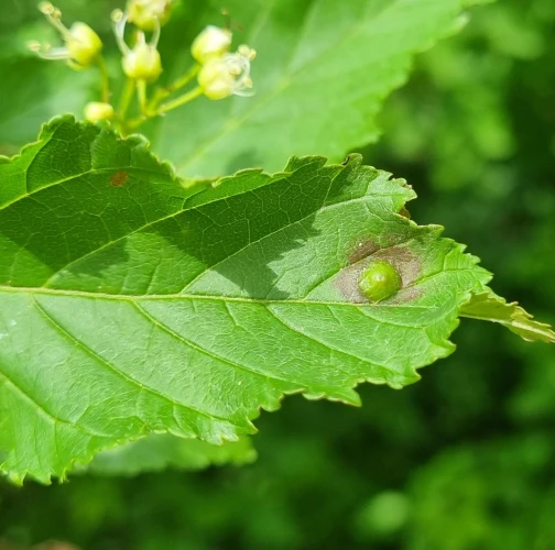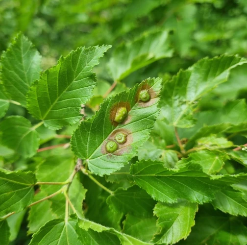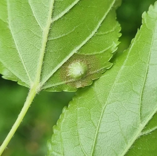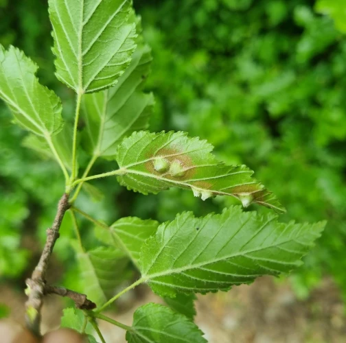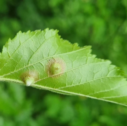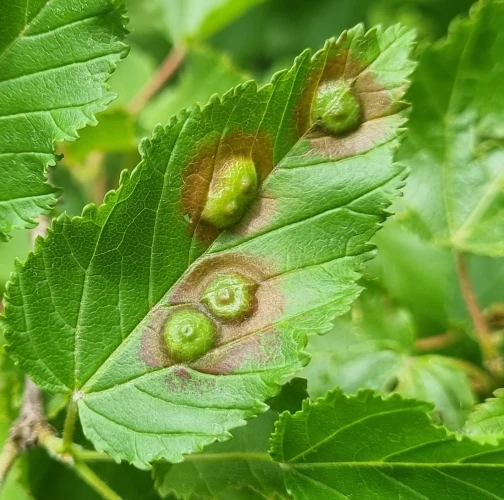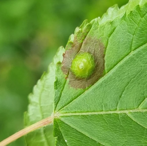 Galls appear on infected leaves and shoots as green to reddish swellings, often with a distorted or thickened surface. As the larvae develop, the galls harden and turn brown.