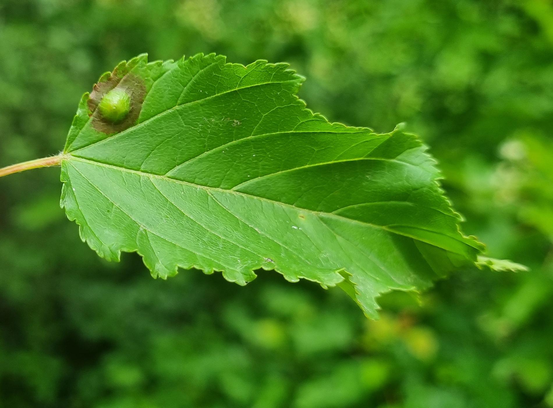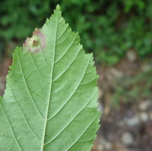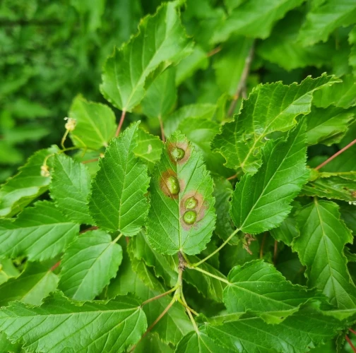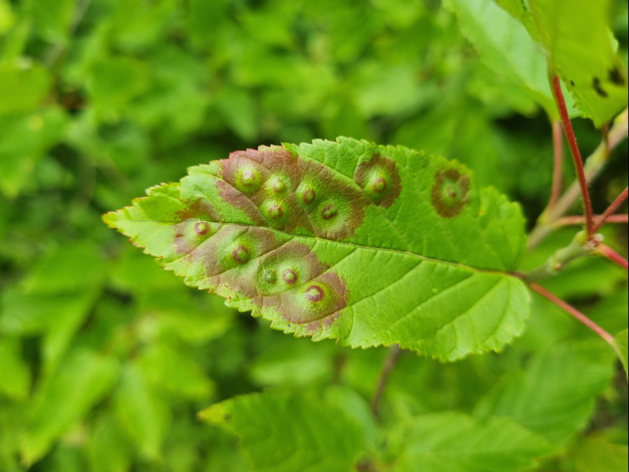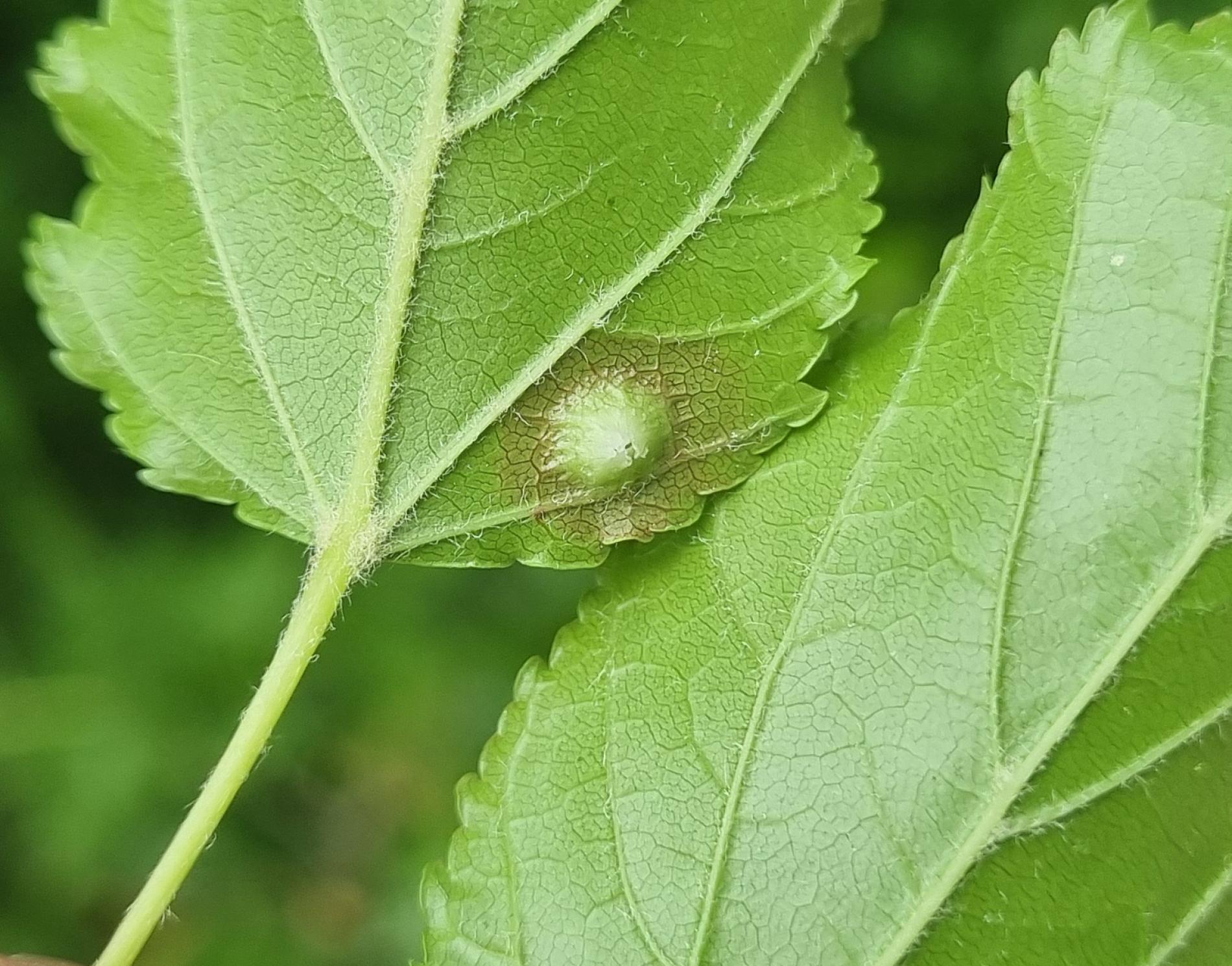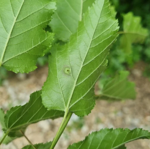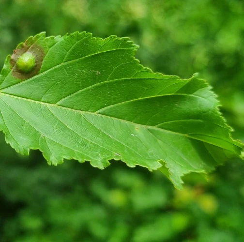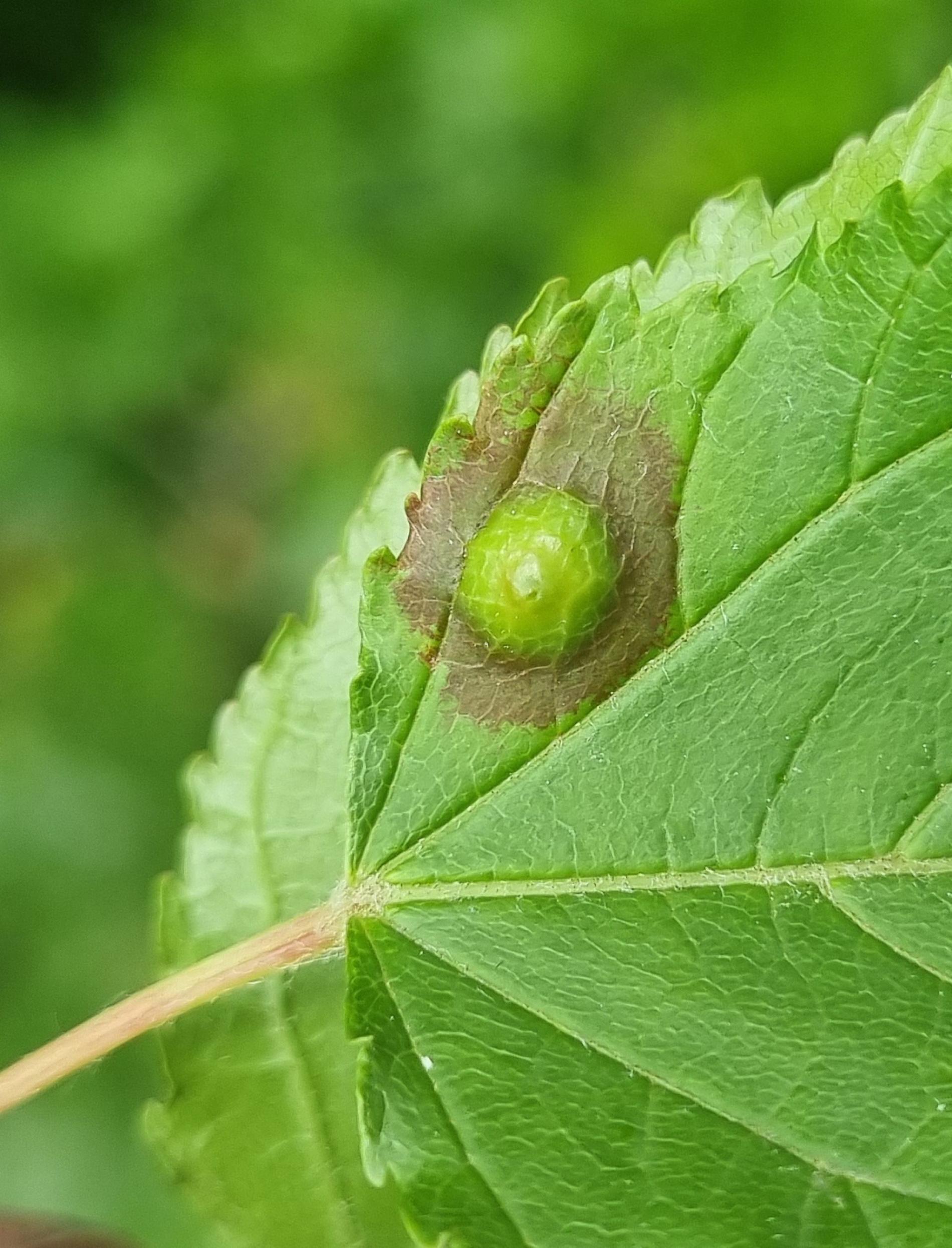 Galls appear on infected leaves and shoots as green to reddish swellings, often with a distorted or thickened surface. As the larvae develop, the galls harden and turn brown.