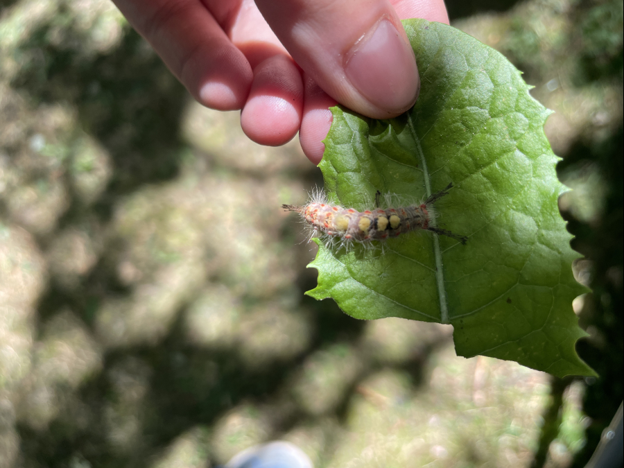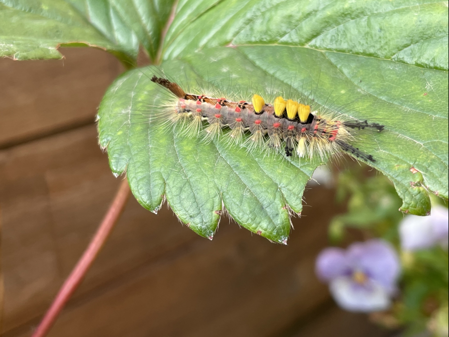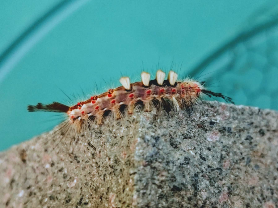 Colorful caterpillars with 4 groups of yellow bristles on the back and a pair of bristles running forward along the sides of the head.