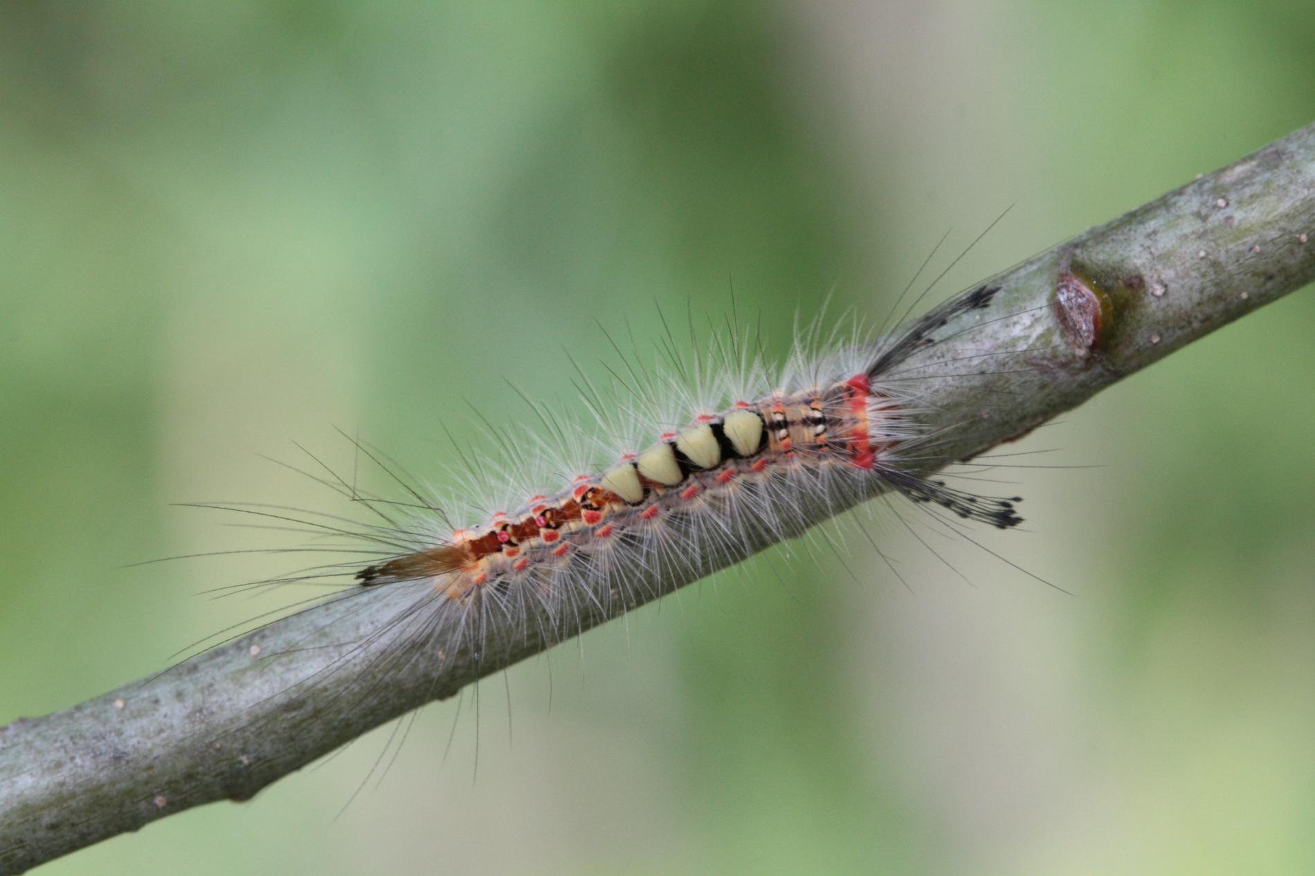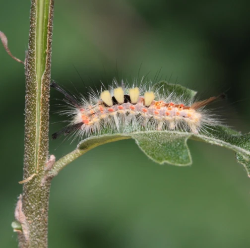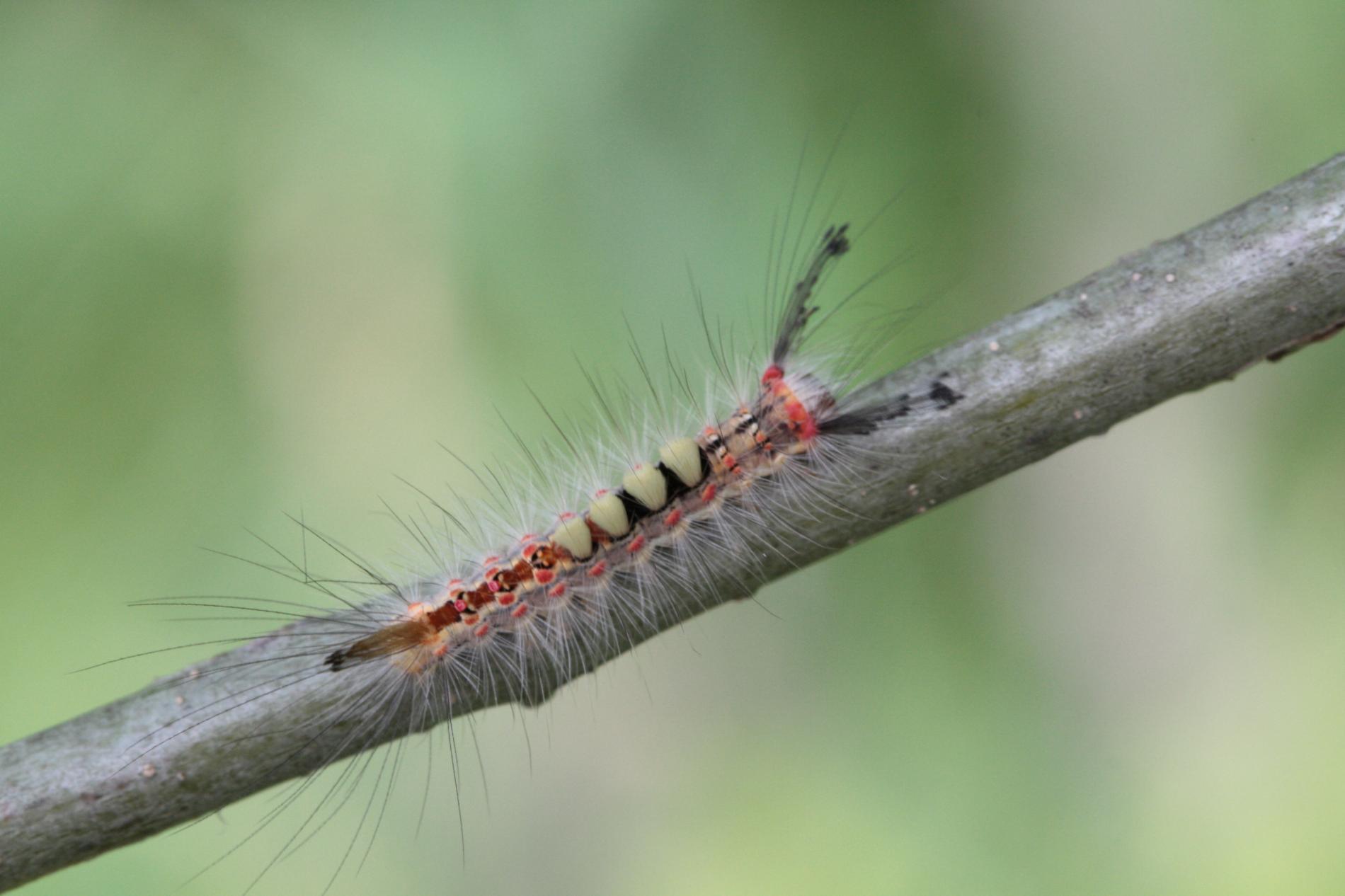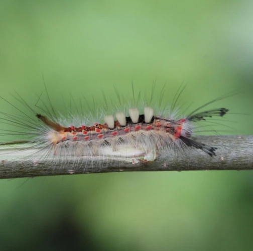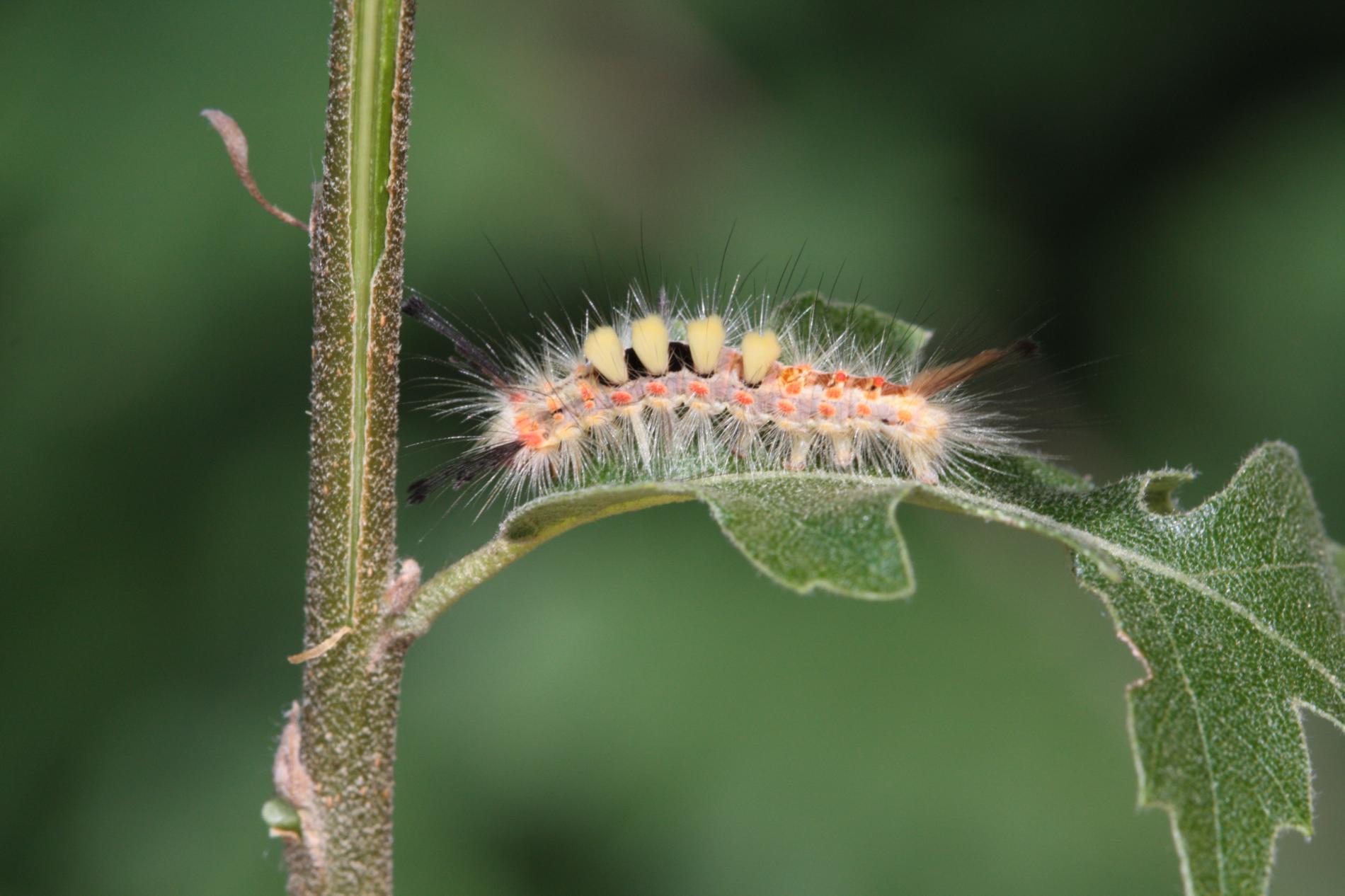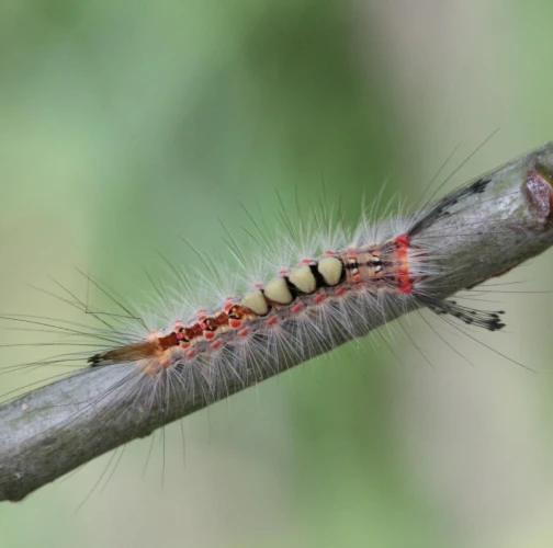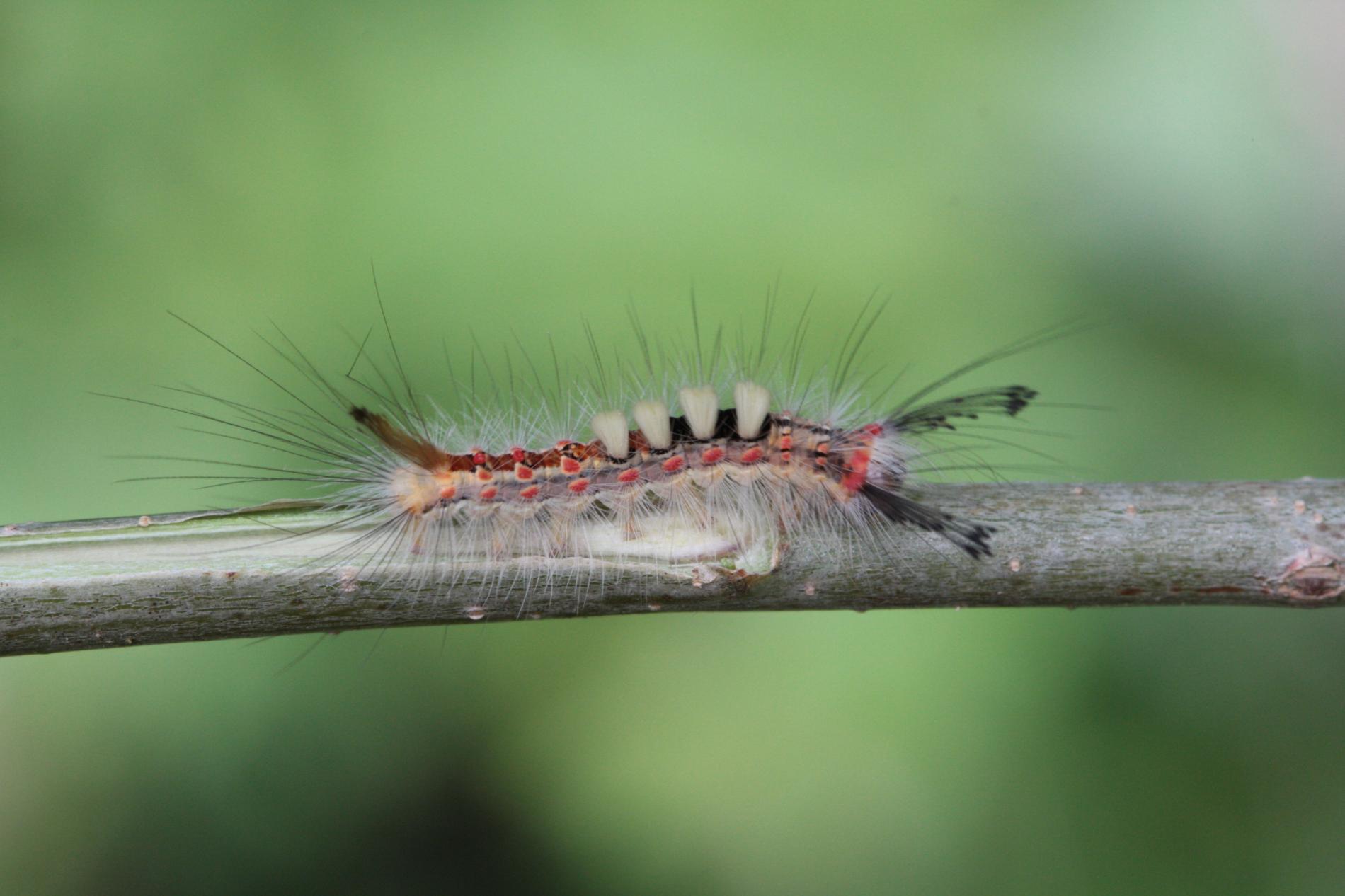 Orgyia antiqua, also known as the rusty tussock moth, is a species of moth with larvae that live on many species of trees and shrubs, feeding on leaves. The larvae are covered with long, rust-colored hairs and can be found between April and September, usually in two or three generations. The adults occur from June to October and are typically brown or gray with distinctive markings on their wings. The species is distributed in a variety of habitats, including forests, orchards, parks, and gardens, and is commonly found throughout Europe, Asia, and North America. Rusty tussock moth infestations can cause significant defoliation of host plants, which can lead to reduced growth and overall health. While outbreaks of this species can be damaging, they are often controlled naturally by parasites and predators. Additionally, the use of insecticides can help to manage populations of rusty tussock moths in areas where they pose a threat to valuable crops or landscapes.