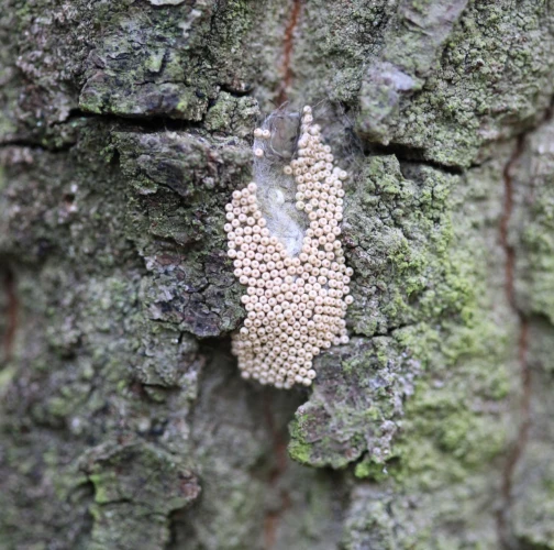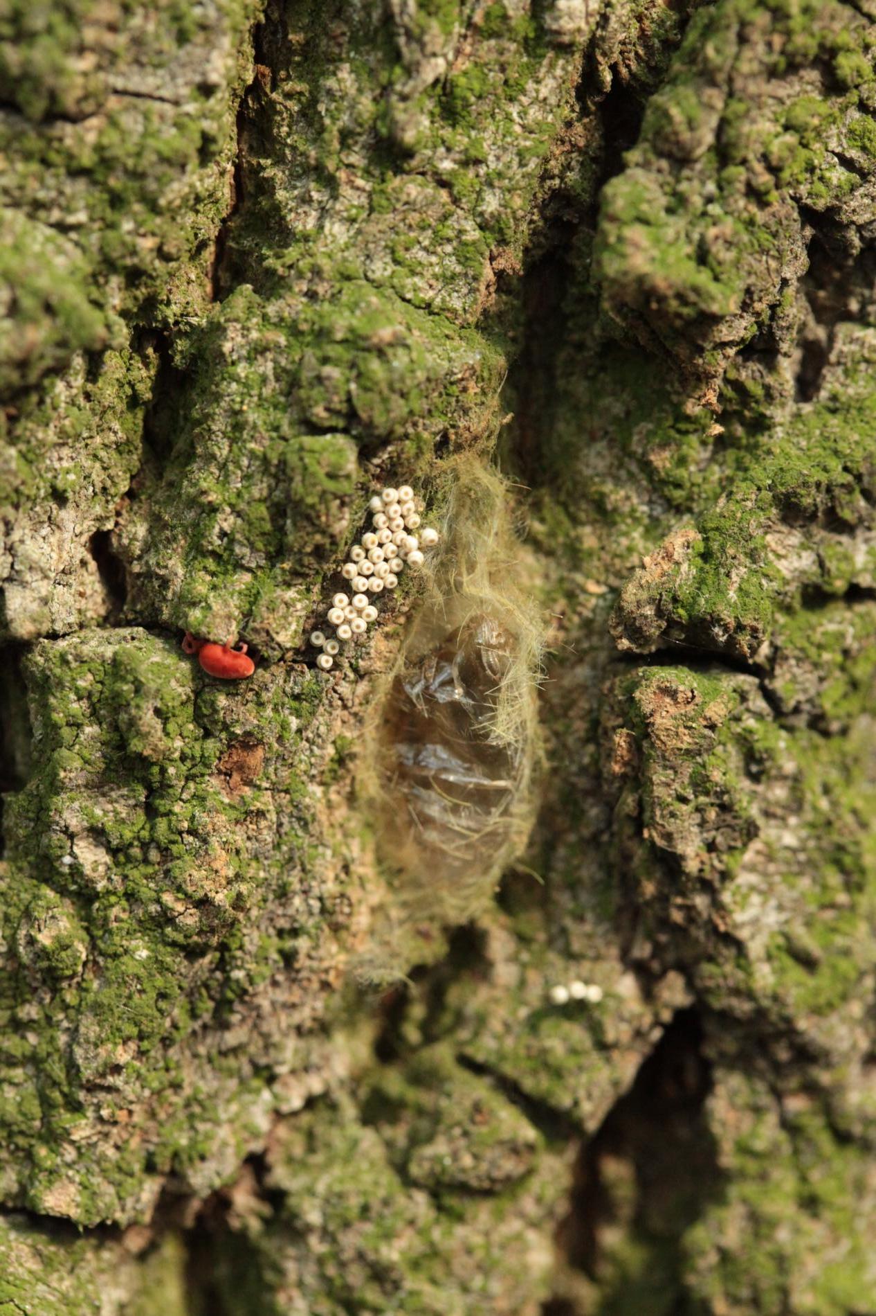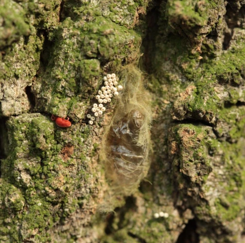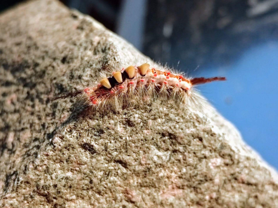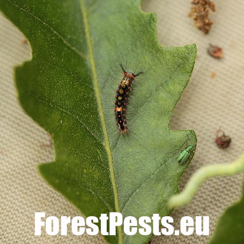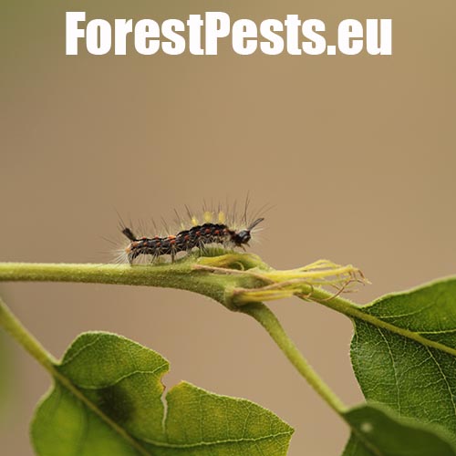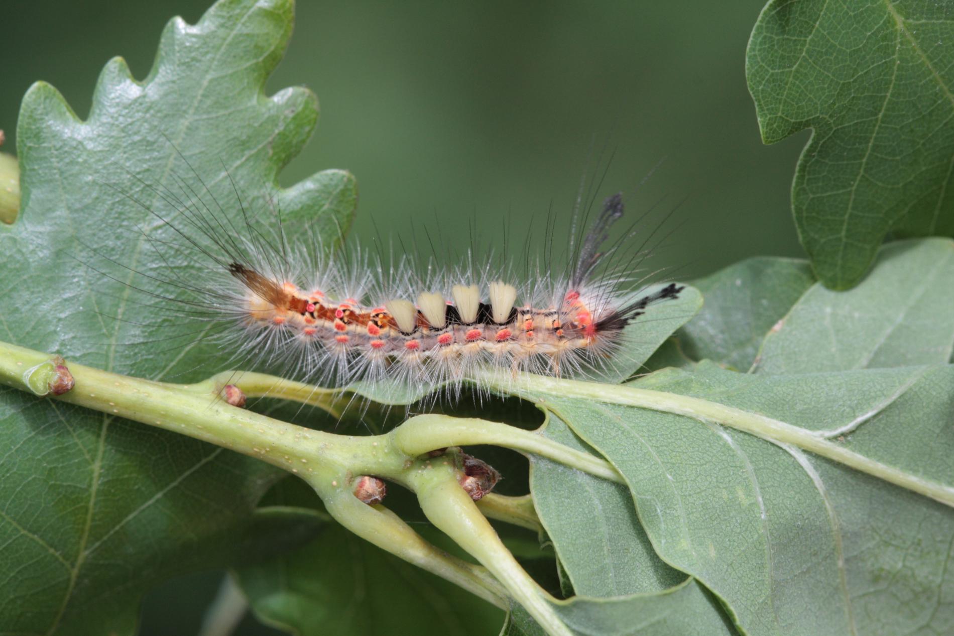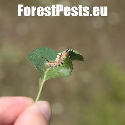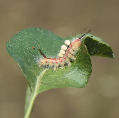 Orgyia antiqua, also known as the rusty tussock moth, is a species of moth with larvae that live on many species of trees and shrubs, feeding on leaves. The larvae are covered with long, rust-colored hairs and can be found between April and September, usually in two or three generations. The adults occur from June to October and are typically brown or gray with distinctive markings on their wings. The species is distributed in a variety of habitats, including forests, orchards, parks, and gardens, and is commonly found throughout Europe, Asia, and North America. Rusty tussock moth infestations can cause significant defoliation of host plants, which can lead to reduced growth and overall health. While outbreaks of this species can be damaging, they are often controlled naturally by parasites and predators. Additionally, the use of insecticides can help to manage populations of rusty tussock moths in areas where they pose a threat to valuable crops or landscapes.