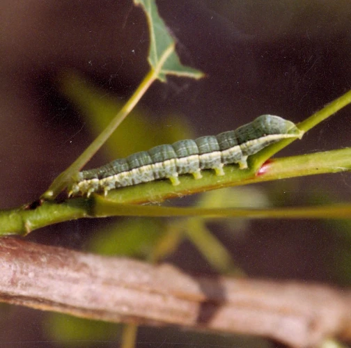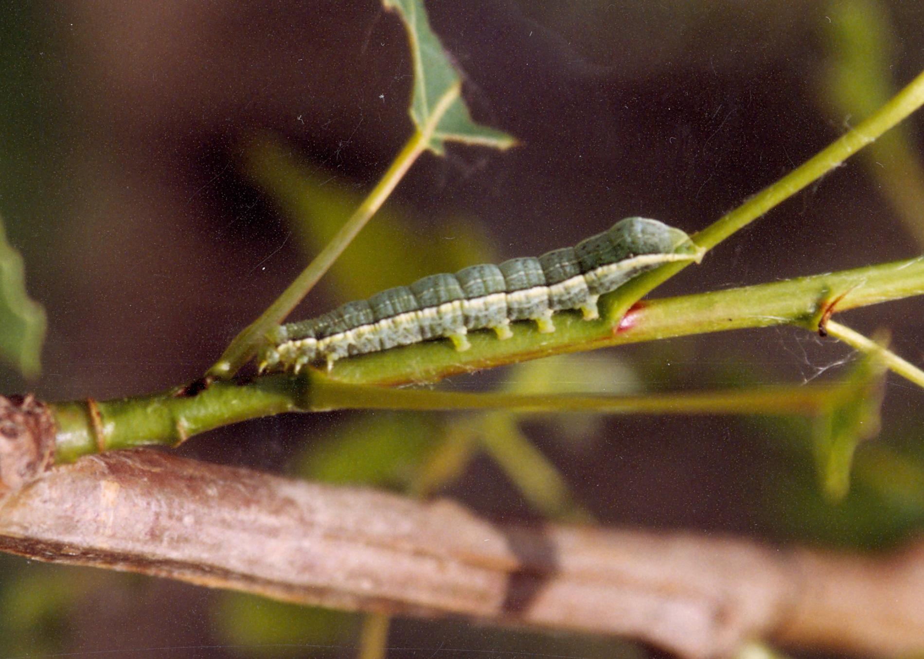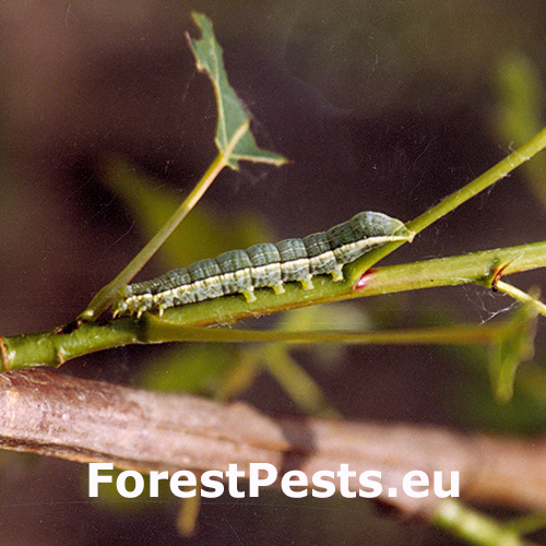 It cause damages mainly in warmer areas. It may consume whole leaves. Green larvae are present.