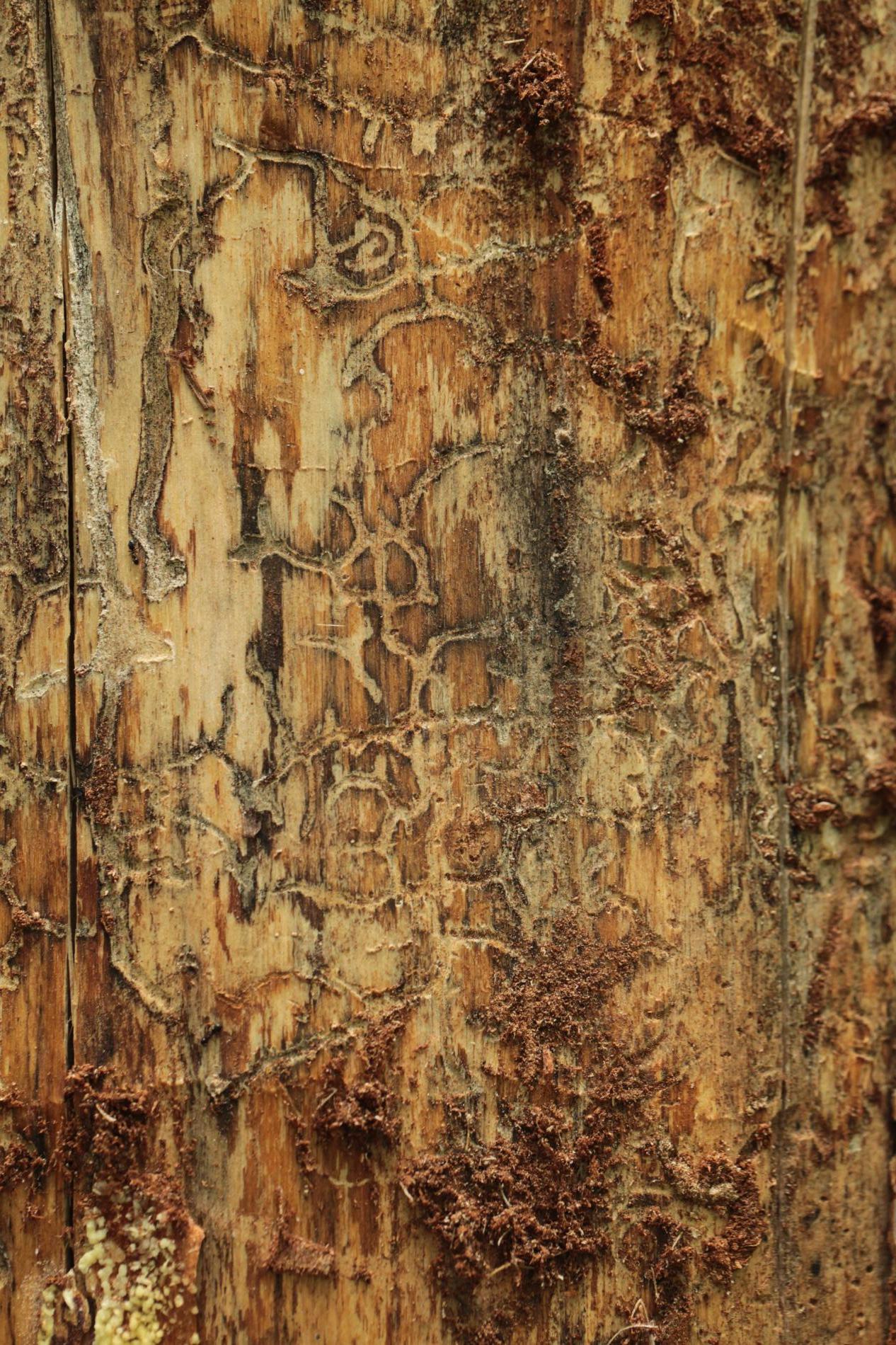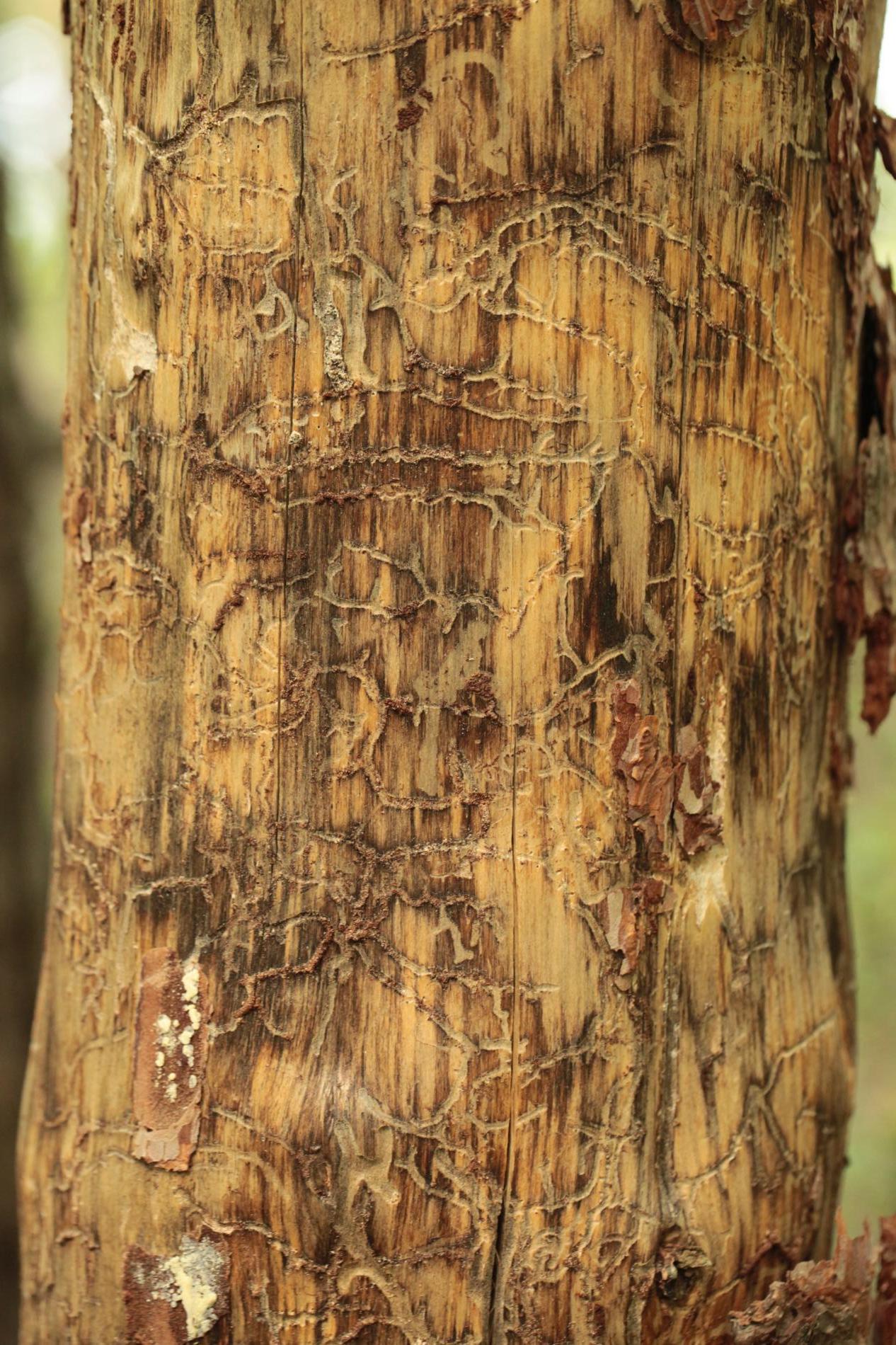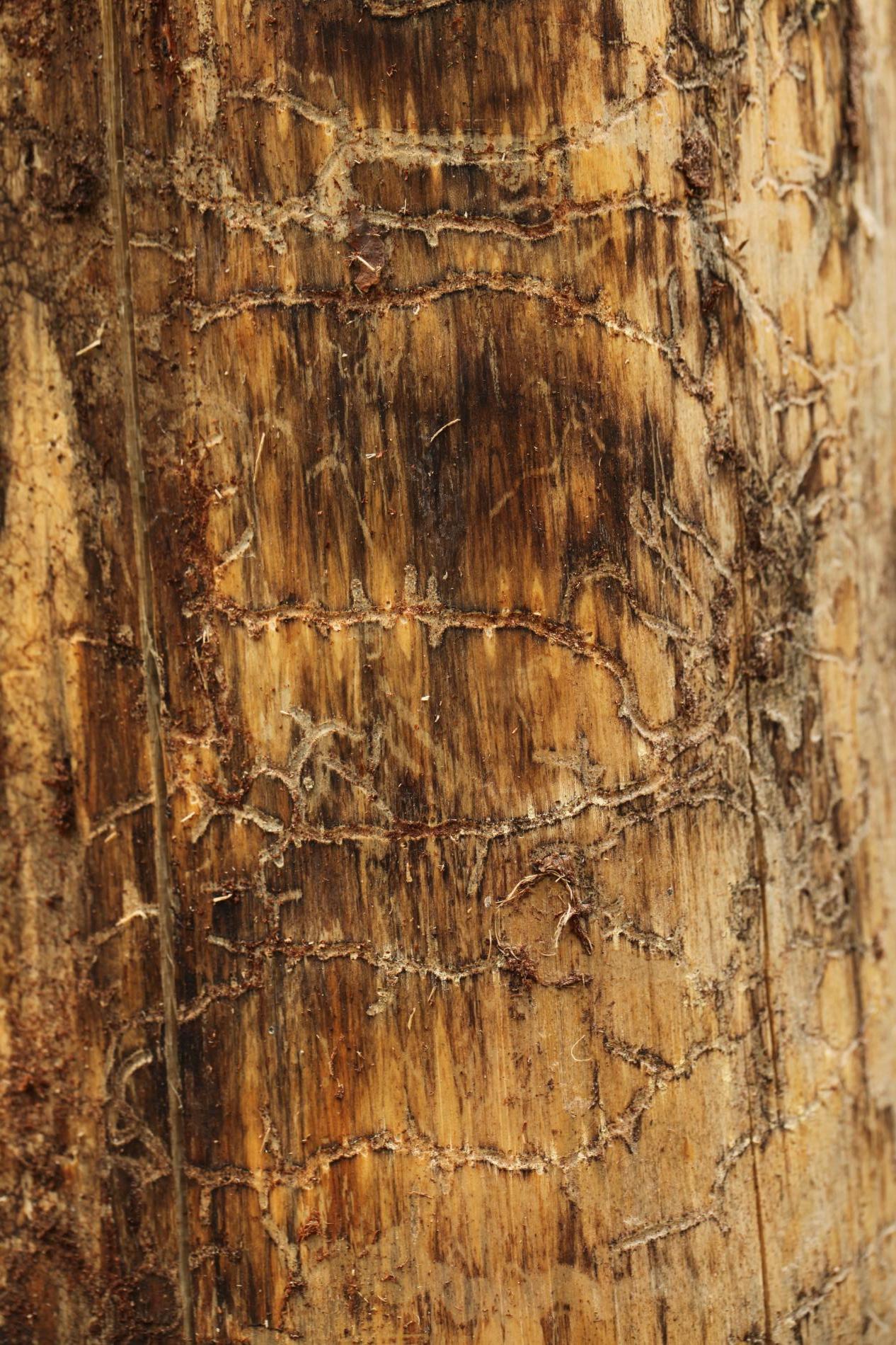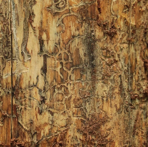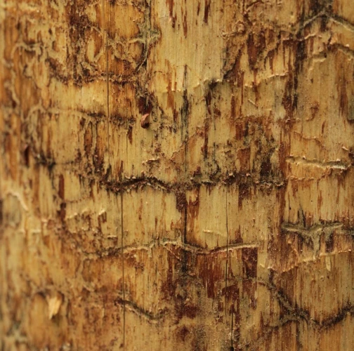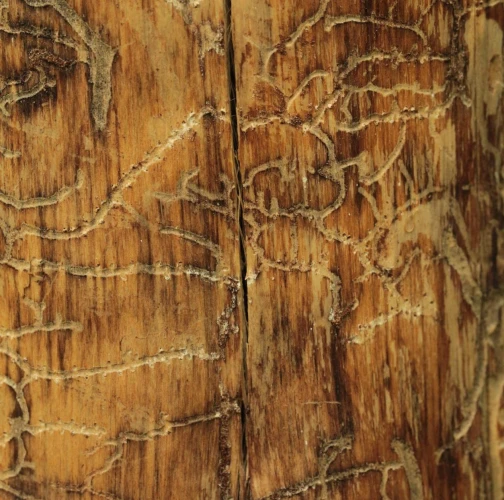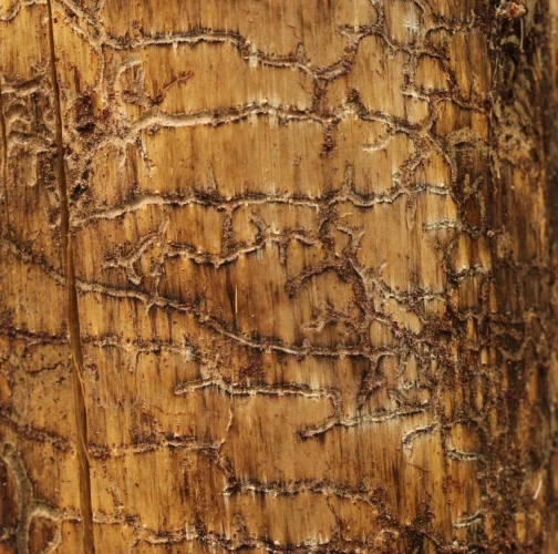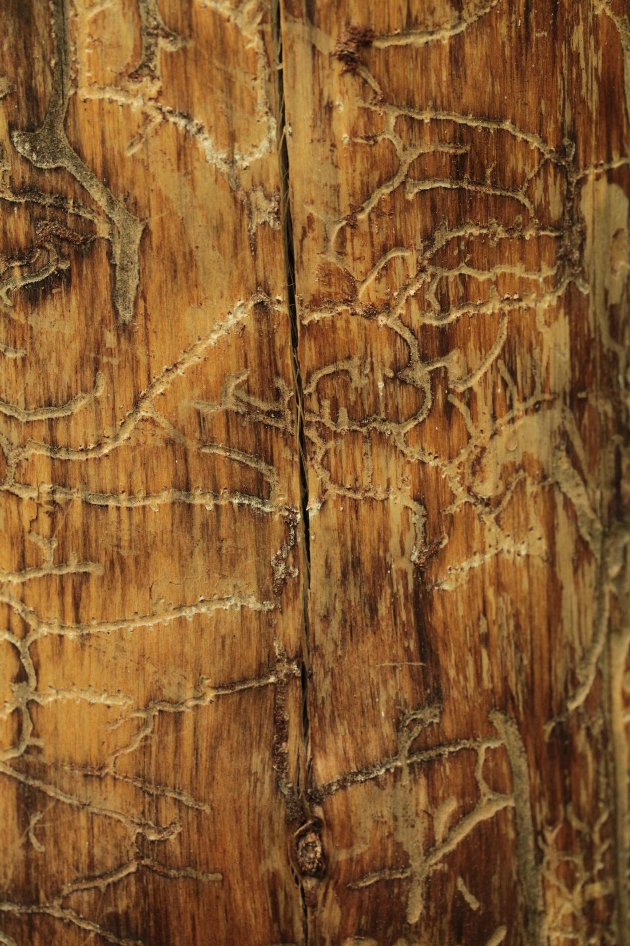 Starting from their large nuptial chamber, 2-4 females excavate irregular maternal galleries between the bark and the wood, often cutting across each other.