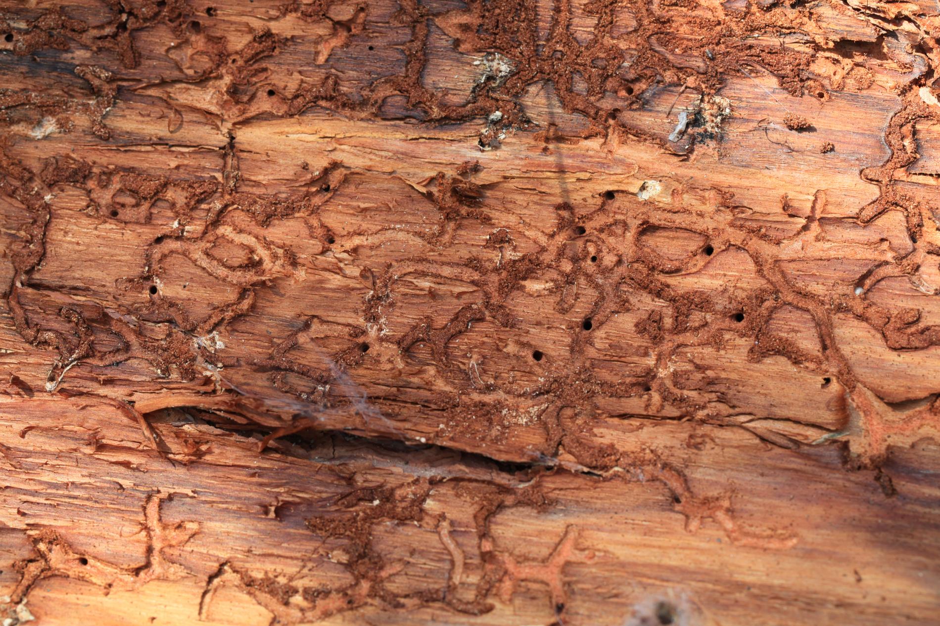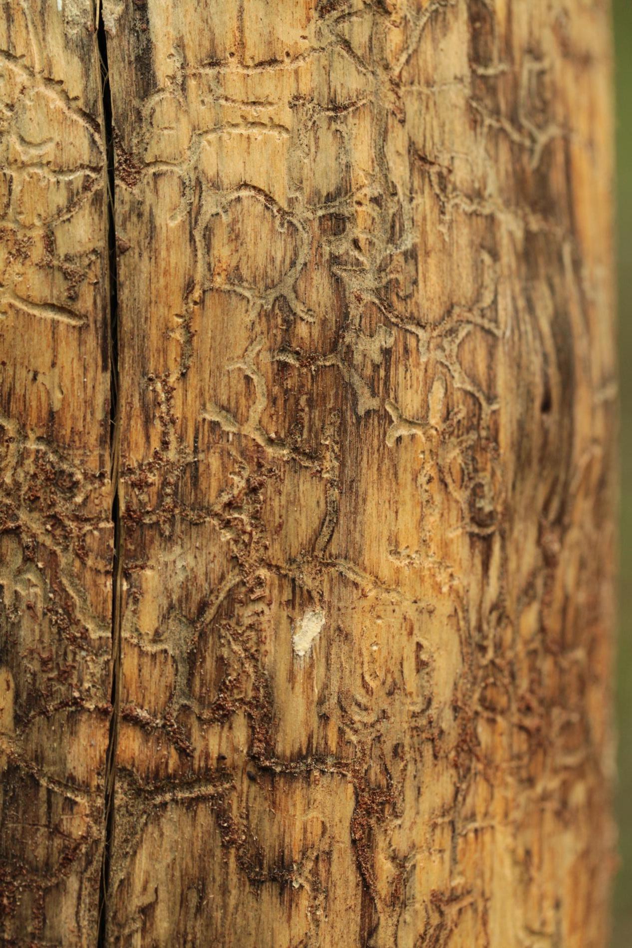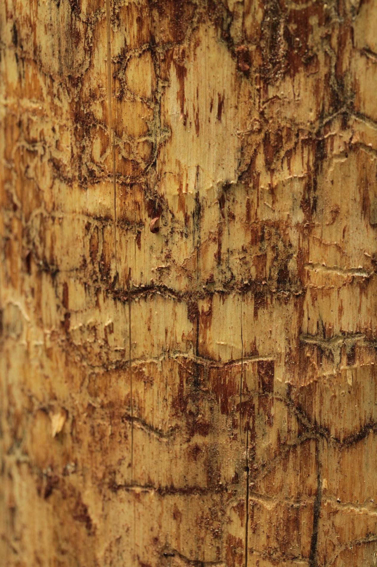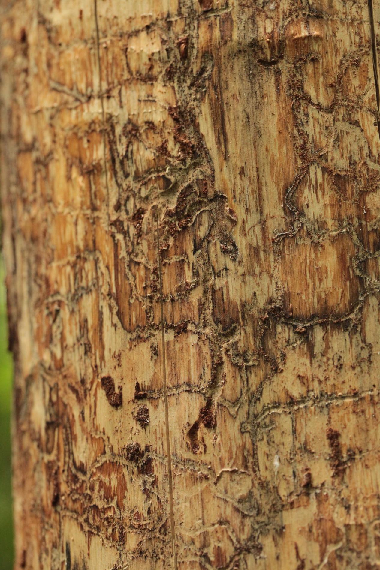 Starting from their large nuptial chamber, 2-4 females excavate irregular maternal galleries between the bark and the wood, often cutting across each other.