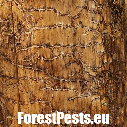 Starting from their large nuptial chamber, 2-4 females excavate irregular maternal galleries between the bark and the wood, often cutting across each other. The larvae feed in the bark without leaving gallery marks in the wood. The 3-4 mm long bark beetles usually colonise the stems of greatly weakened pines and are therefore of minor importance in most of Europe. It occurs mainly in pure pine forests.
