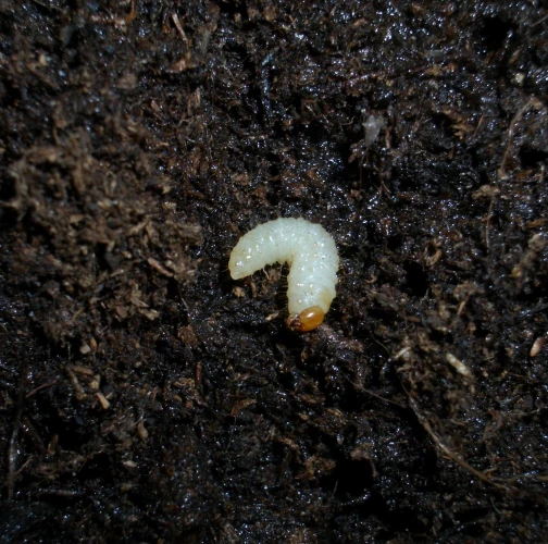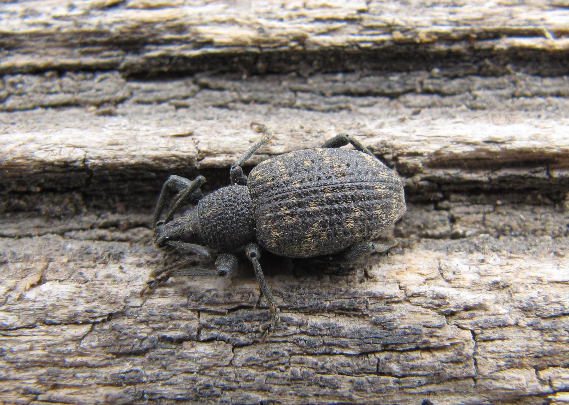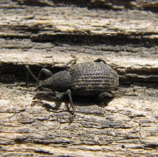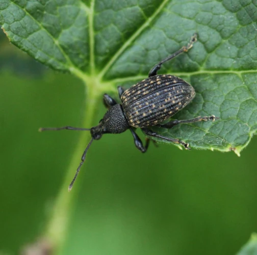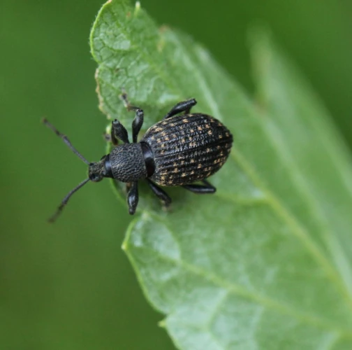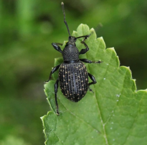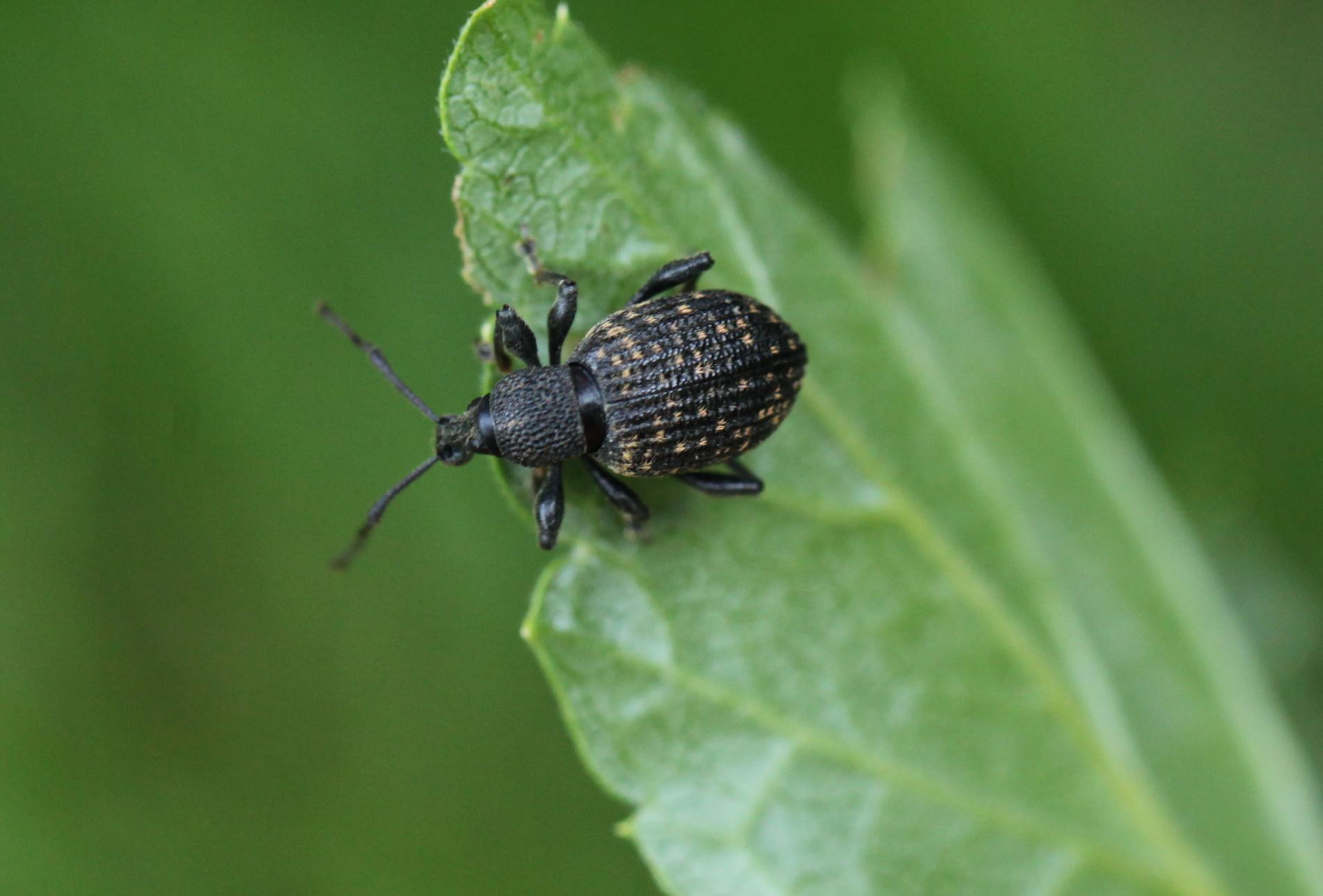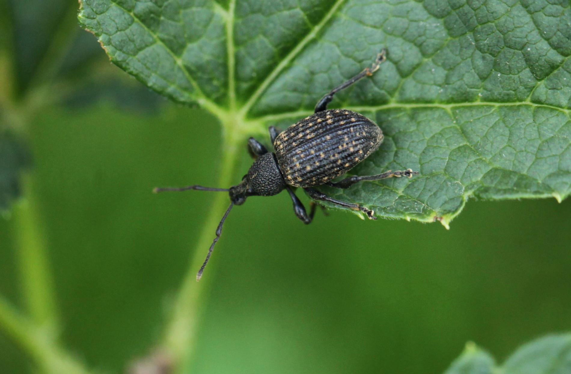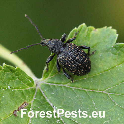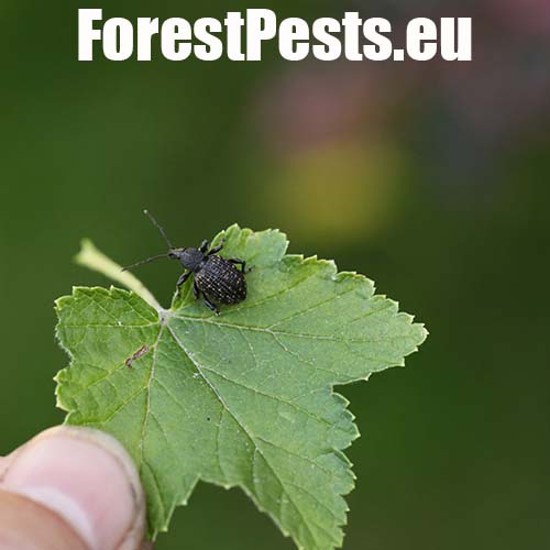 8.0-10 mm long, lowland beetle. It is a known pest of cultivated plants, especially grape-vines (Vitis vinifera) and garden and container potted plants in most temperate parts of the world.  Vine weevils are parthenogenetic (only females, reproduction without males) and only reproduce once a year. The female lays eggs on the plant or soil surface. Larvae hatch after several days and the larvae burrow into the soil.  The adults feed on leaves and cause a noticeable "C-shaped" leaf notching on rhododendron leaves, but the real damage is caused by its larvae which damage the roots. It decreases plant development and production. Many plant species die, when attacked by vine weevil larvae. Within the genus Otiorhynchus at least two other species are important pests of rhododendrons in Central Europe. They are the clay-coloured weevil (O. singularis) and the strawberry weevil (O. ovatus).