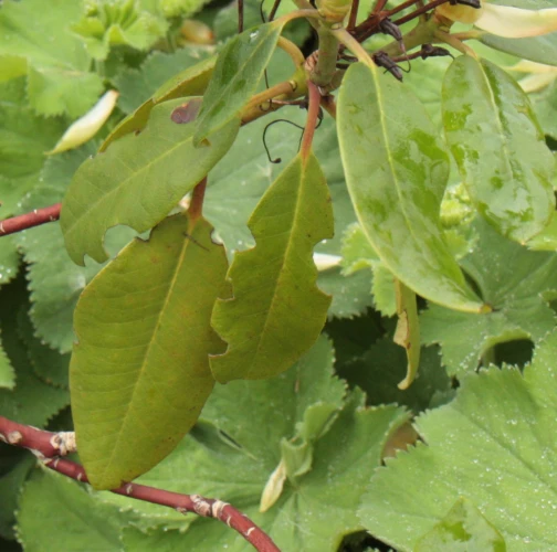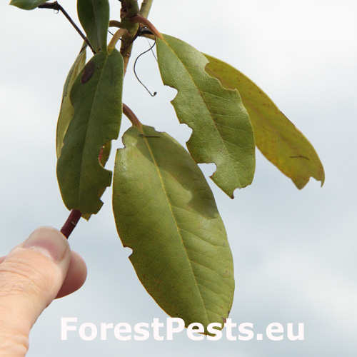 The adults feed on leaves and cause a noticeable C-shaped leaf notching on rhododendron leaves, but the real damage is caused by its larvae, which very seriously damage the roots.