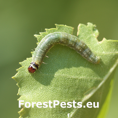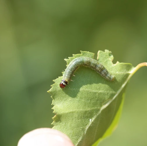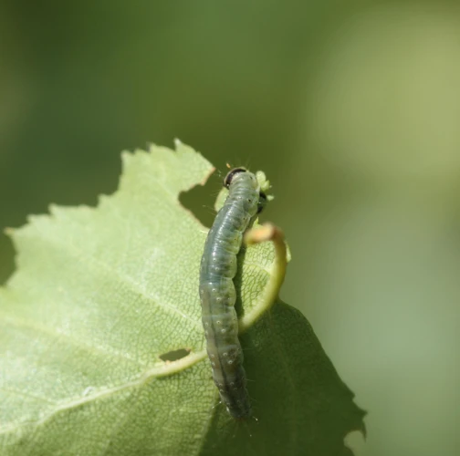 Larval feeding results in rolled or chewed leaves, and sometimes damaged fruit, leading to reduced crop quality and yield.