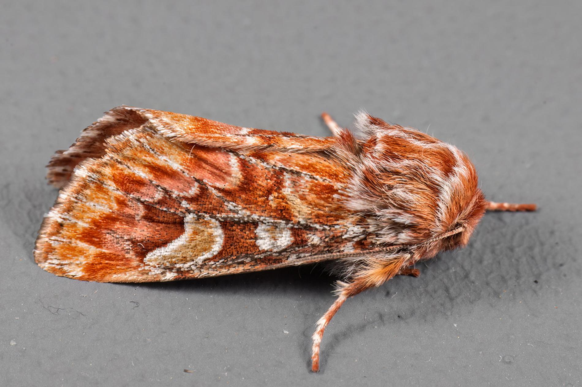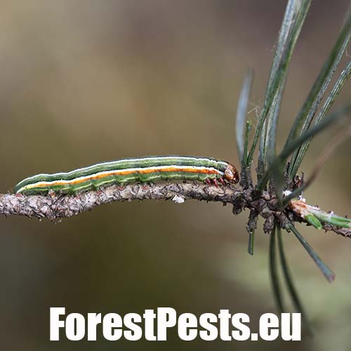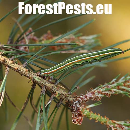 The adult moth has a hairy head and body. The wingspan is about 30–35 mm. Adults on wings from late March to May. It lays eggs on needles. Altogether, one female lays up to 130–180 eggs. Larvae hatch in 2–3 weeks. At first they feed on young needles and buds, later also on older needles. They feed off the older needles from the end and sides. They often bite off the damaged end part of the needle leaving only stubs. At the end of June the larvae mature, descend to the ground and pupate in the forest litter. It infests mostly 30–60 year-old pine stands. It can cause defoliation and serious damage of the trees.