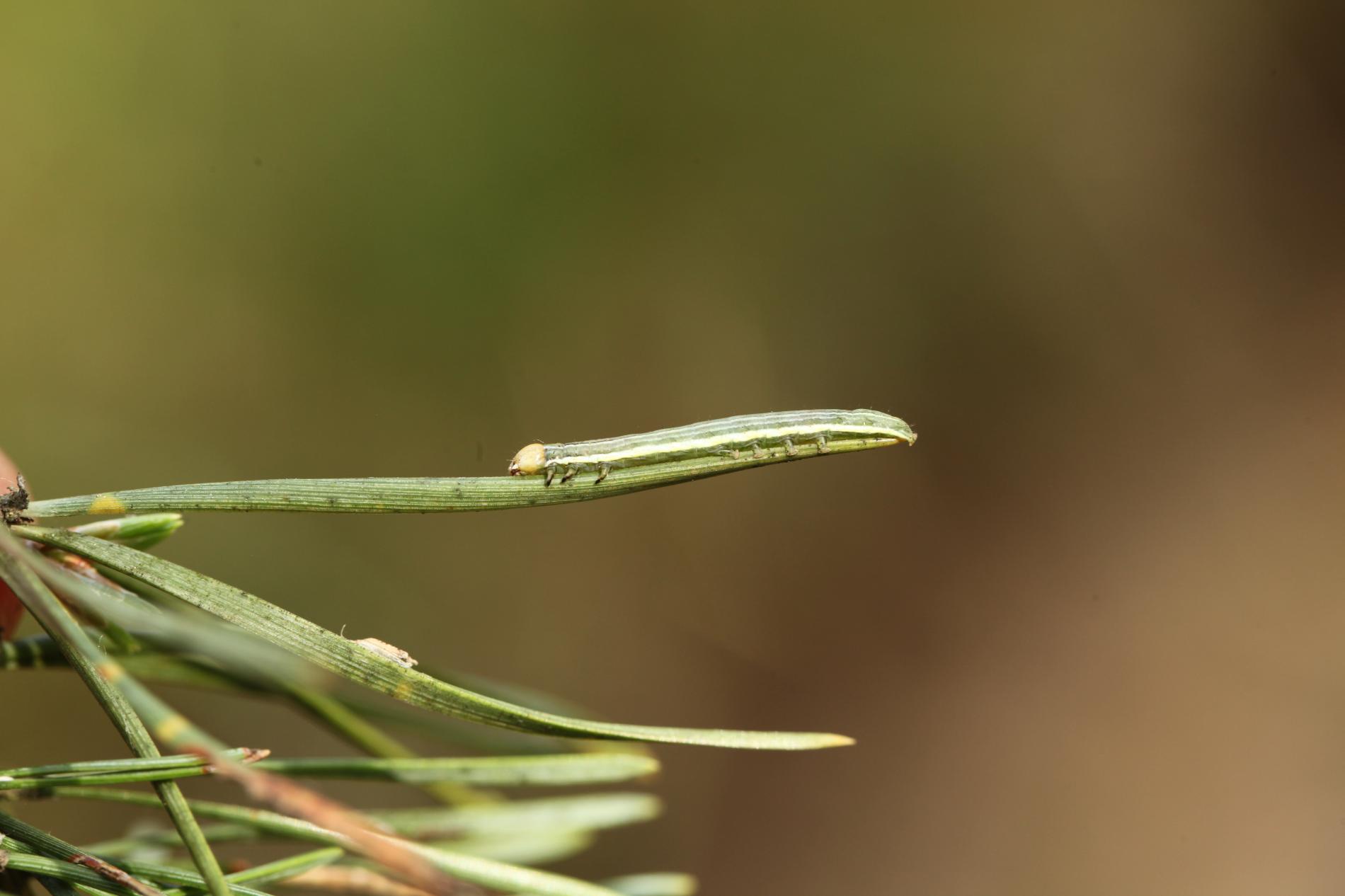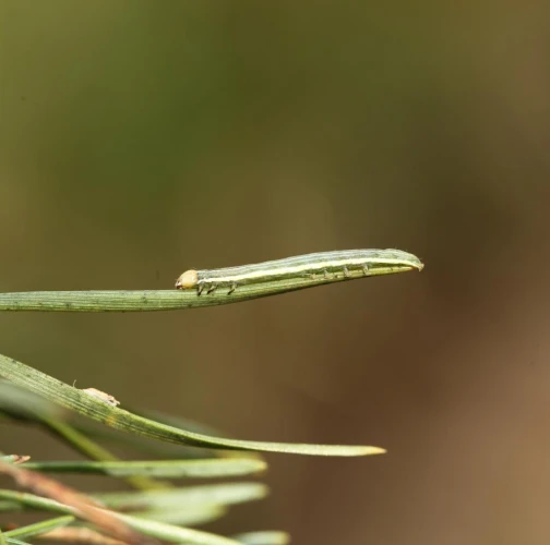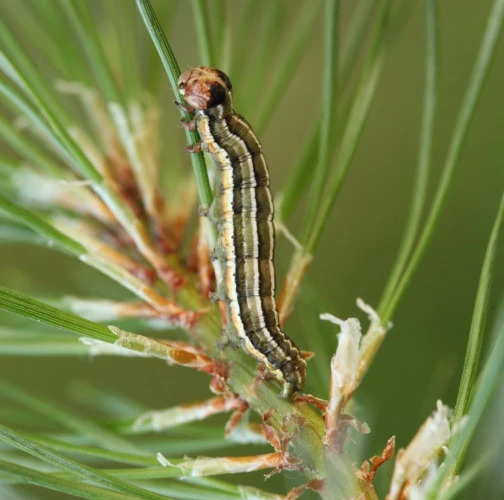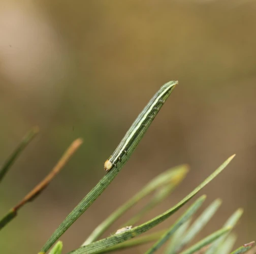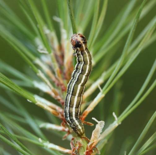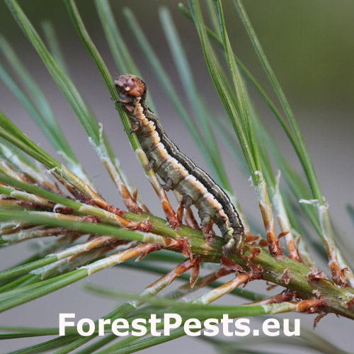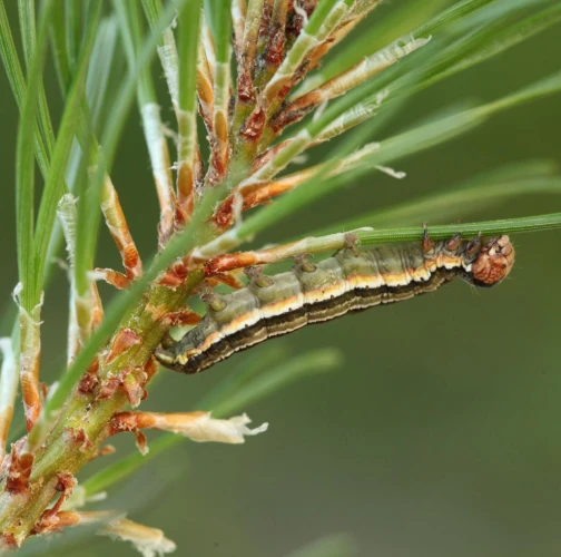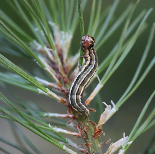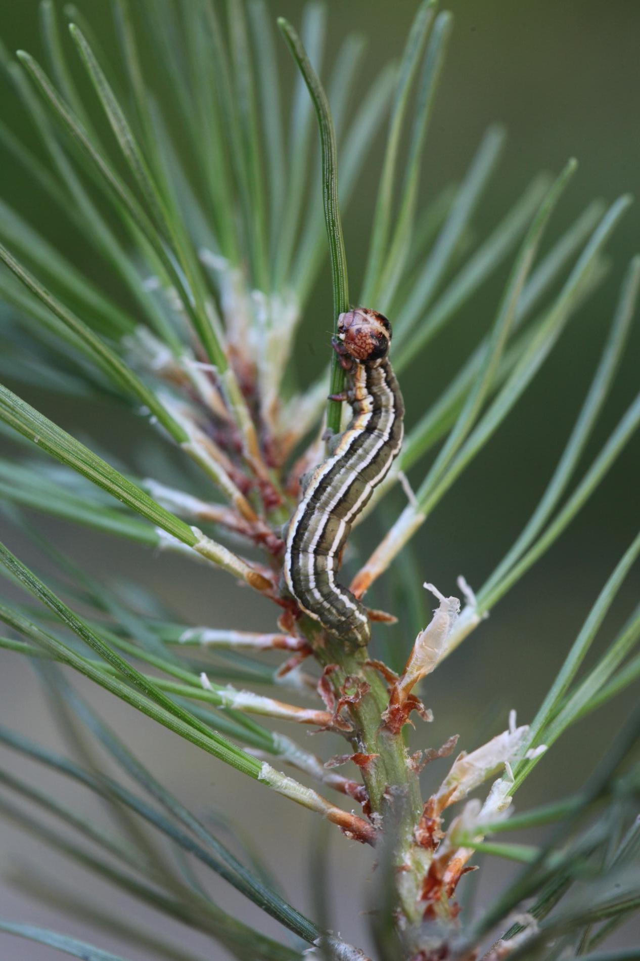 Larvae fconsume older needles from the end and sides. They often bite off the damaged end part of the needle leaving only stubs.
