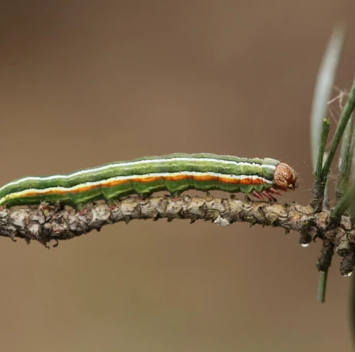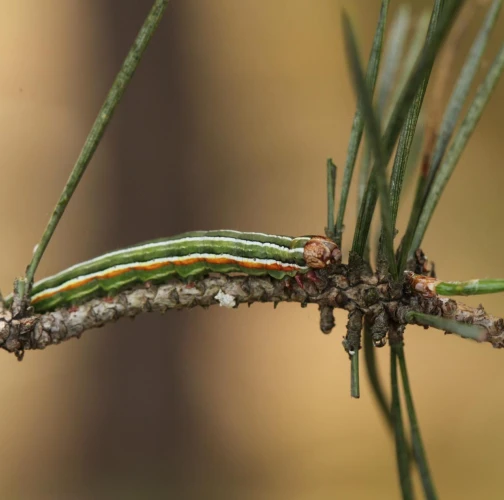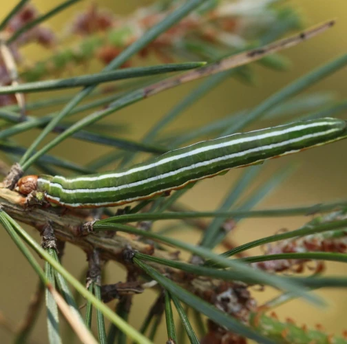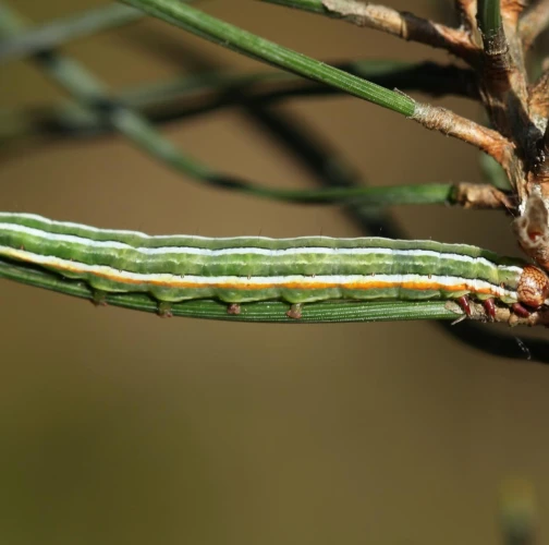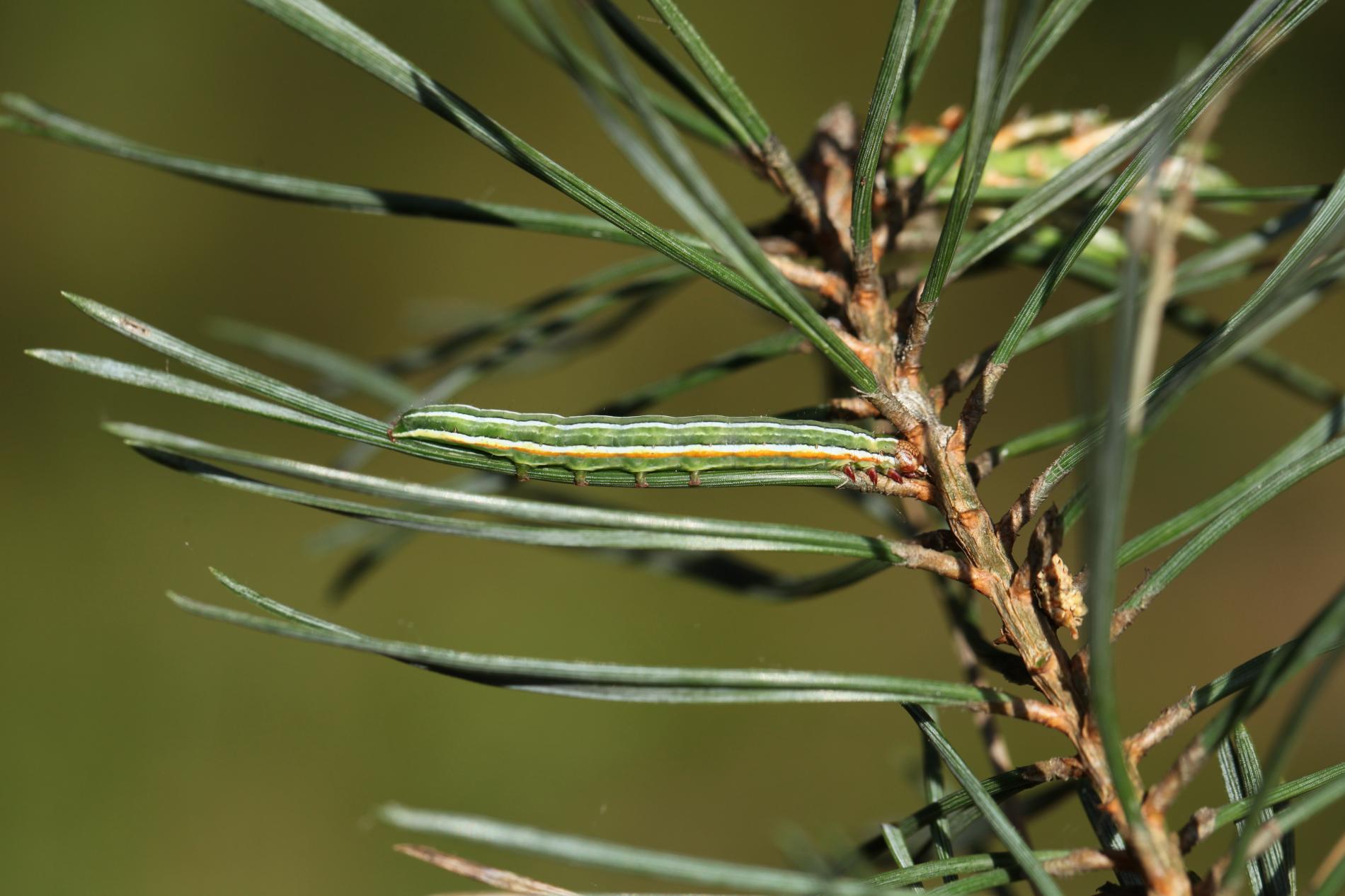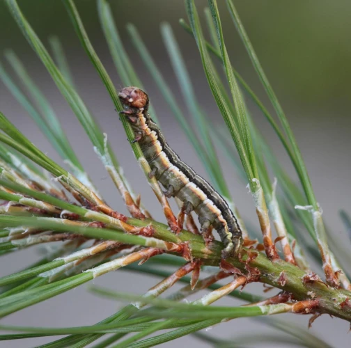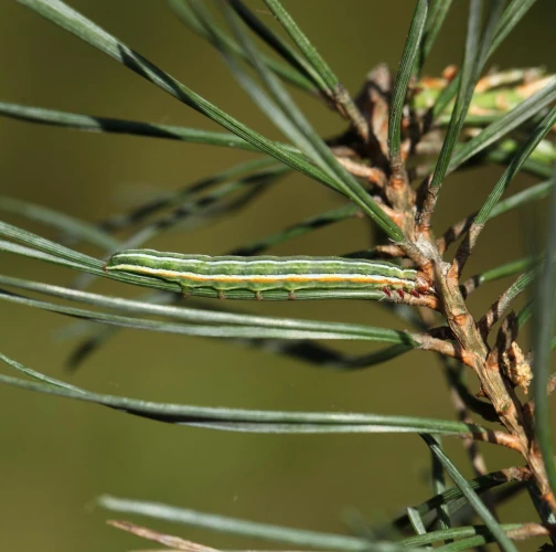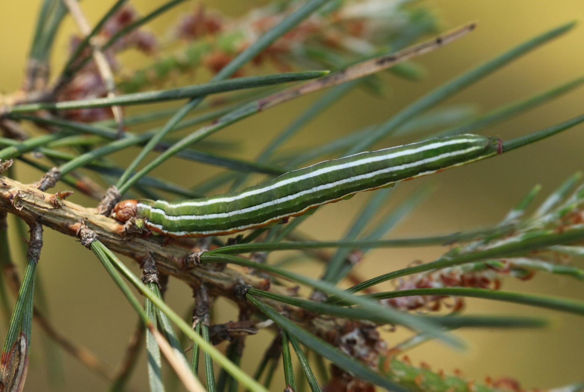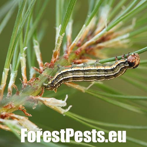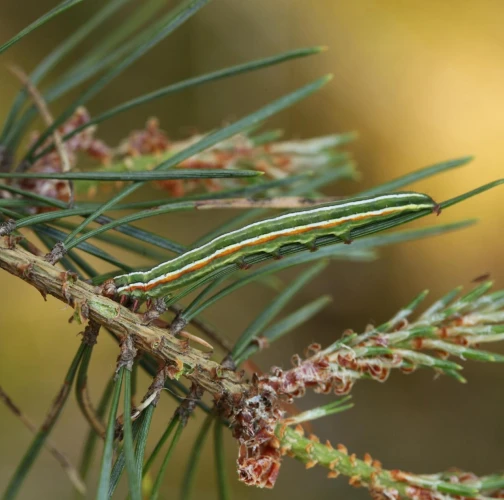 Larvae fconsume older needles from the end and sides. They often bite off the damaged end part of the needle leaving only stubs.