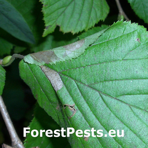 Early larval stages form small, triangular or rectangular mines, which later become transparent. The larvae eventually abandon the mine and create a folded leaf margin. Frass is accumulated in one corner of the mine.
