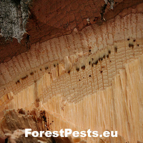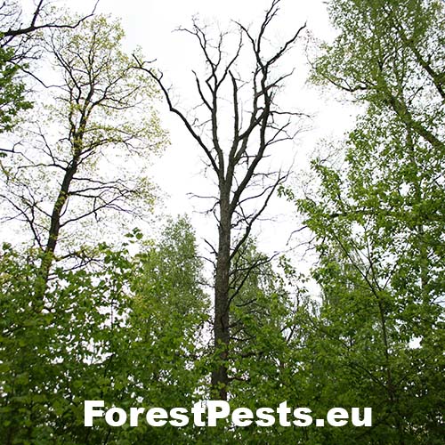 The mass die-back of oaks, also known as oak graphiosis, caused the death of oak stands throughout Europe from the mid-1970s to the end of the 1980s. The disease is caused by tracheomycosis fungi from the genera Ophiostoma spp. and Ceratocystis spp., the currently valid name of the fungus is Pesotum ssp. The main symptoms of infection include the death thin branches, later also side branches and all parts of the crown. Dark spots appear on the cross section of the trunk. The oak bark beetle Scolytus intricatus is probably involved in the transmission of spores. The fungus also infects acorns, which become a source of infection in new locations.