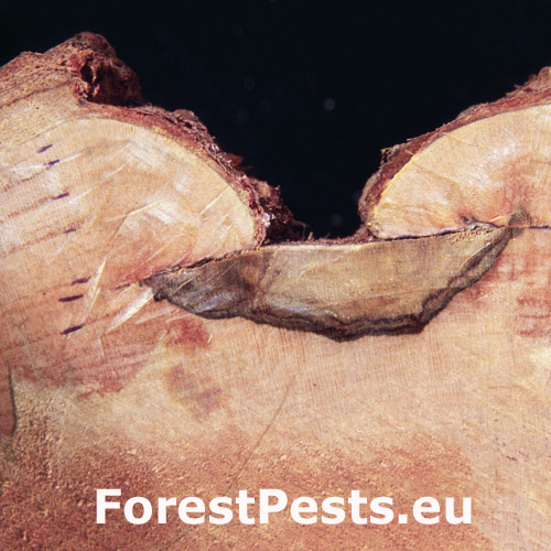 One of the main features of tree infection caused by the cankerous fungus is bottle-like coarsening of the trunk base and necrosis of large bark plates. The infected bark is necrotized, tongue-shaped and spreads up to 2 m in height above ground. The attacked bark is sunken, there are formed cracks in it and finally the bark falls off in scales. The fungus often cannot break tree defense mechanism and it does not attack cambium. In case of potential attack of cambium, the tree resists by intense making callus. The fruiting bodies are tiny, 1 mm disc-like cinnamon-coloured apothecia.