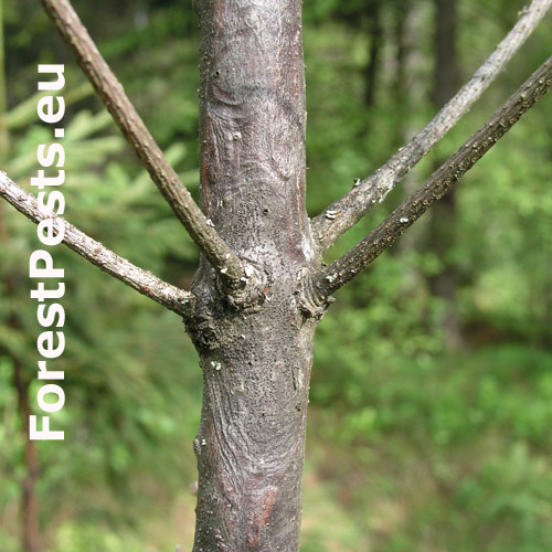 A sign of the pathogen are black spherical fruiting bodies - pycnids piercing the infested bark.