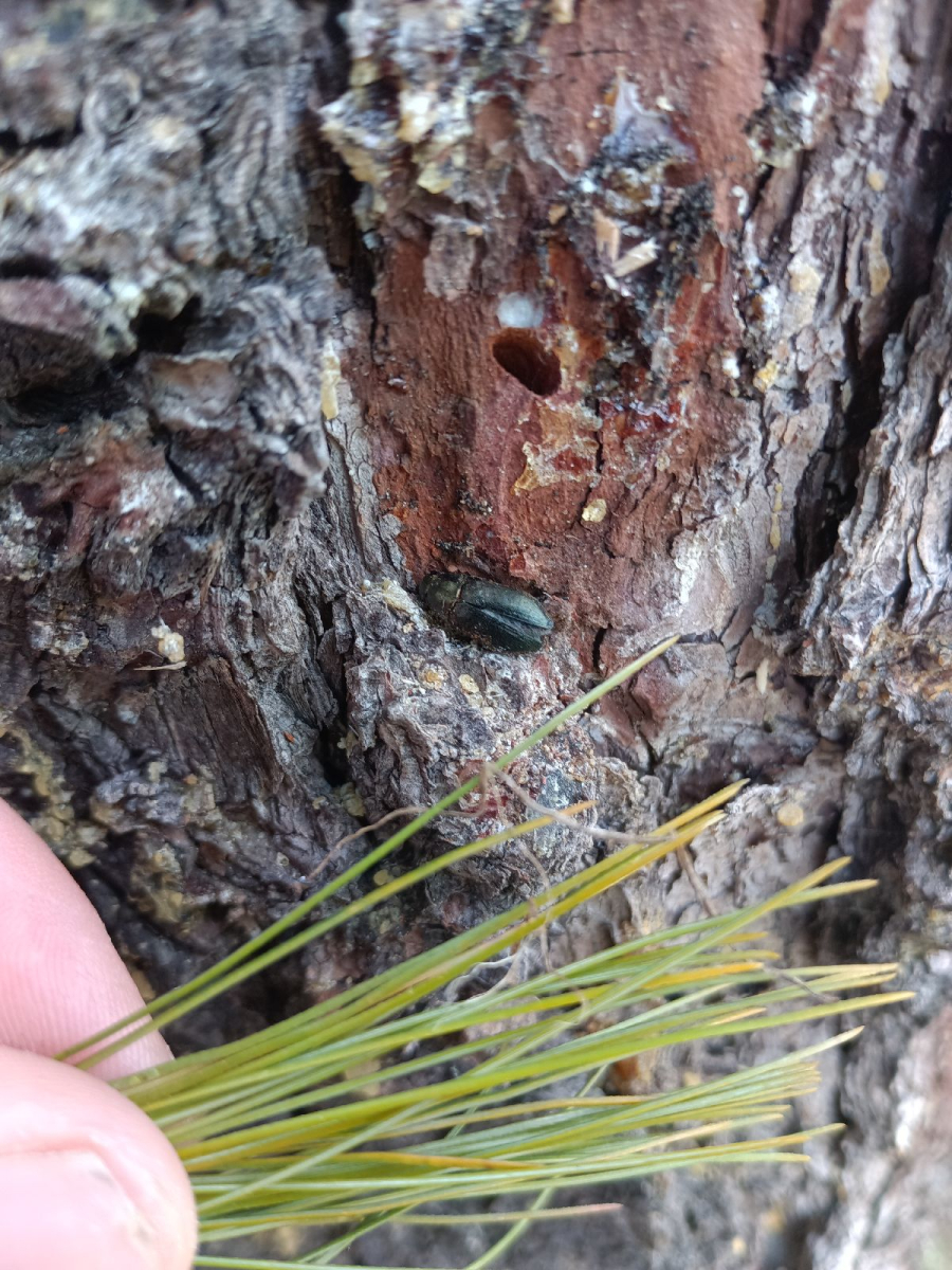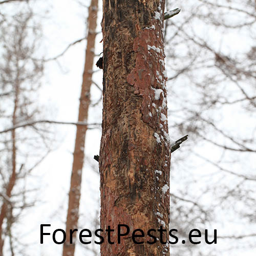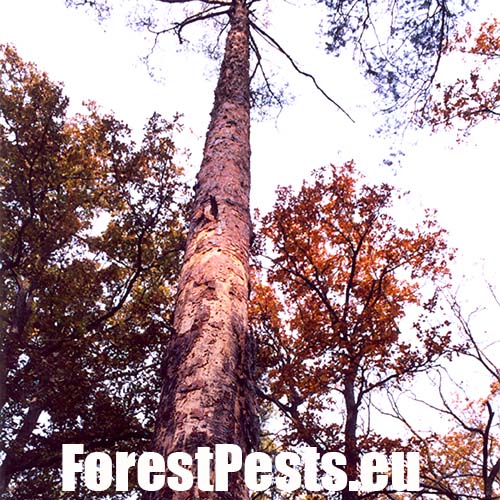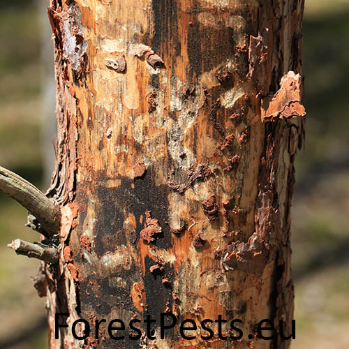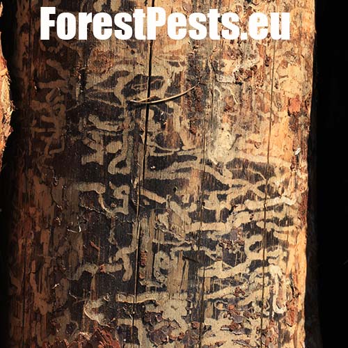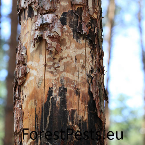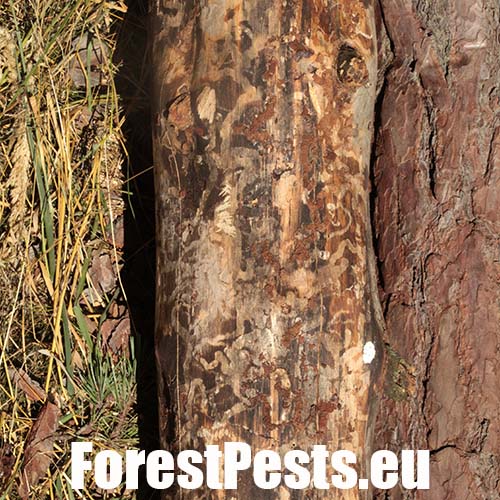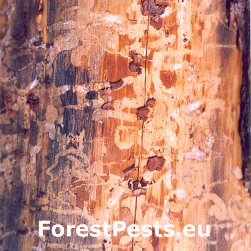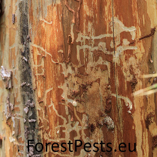 The adult is shiny blue, 8-11 mm in size. It swarms in July and August. The larvae overwinter in the bark. They continue in feeding in spring. They excavate characteristic galleries in phloem first, later also in sapwood. They pupate in rough bark (rhytidome). The exit holes are 6 x 3 in size. Feeding of metallic wood-boring beetle larvae on 40-60 year-old pine stands can result in sudden dieback of trees. The bark falls off the trunks, while the trees still have fully or at least partially green crowns. The dangerous species which can cause dieback of large groups of trees.
