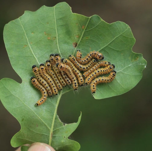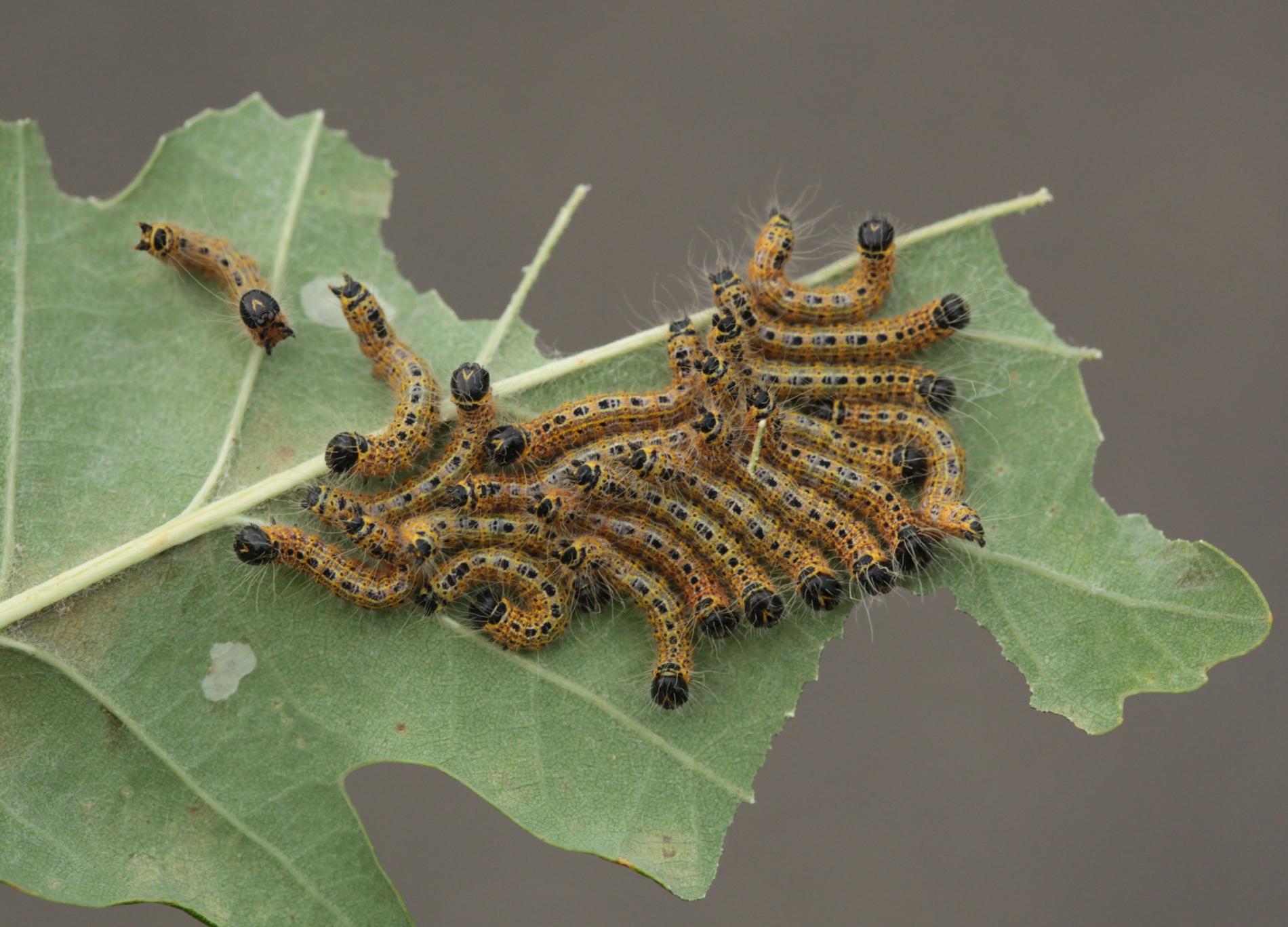 Colorful larvae on leaves.