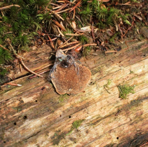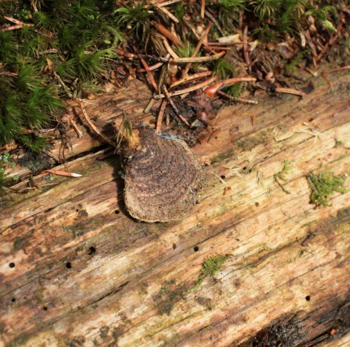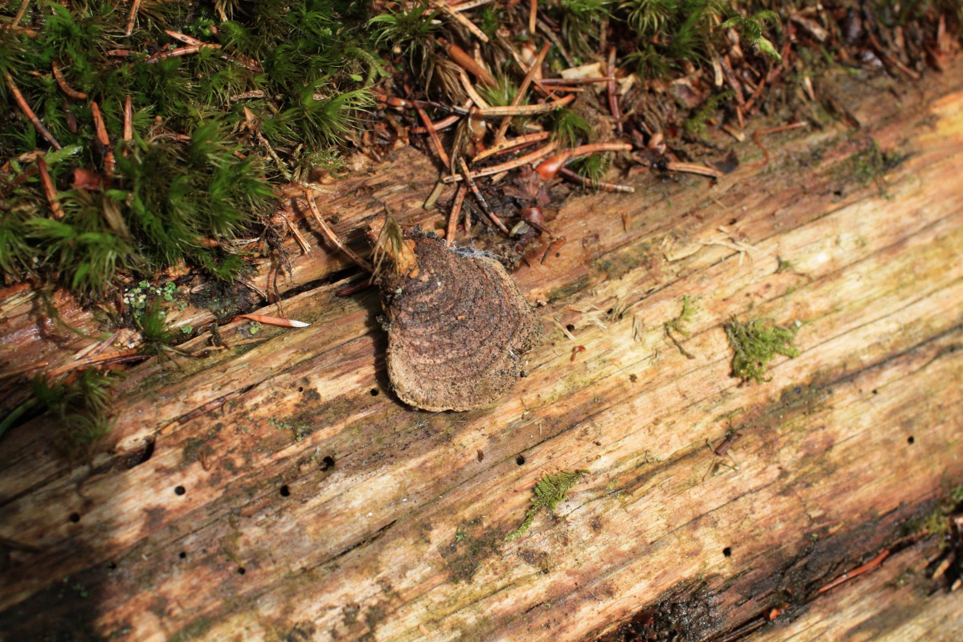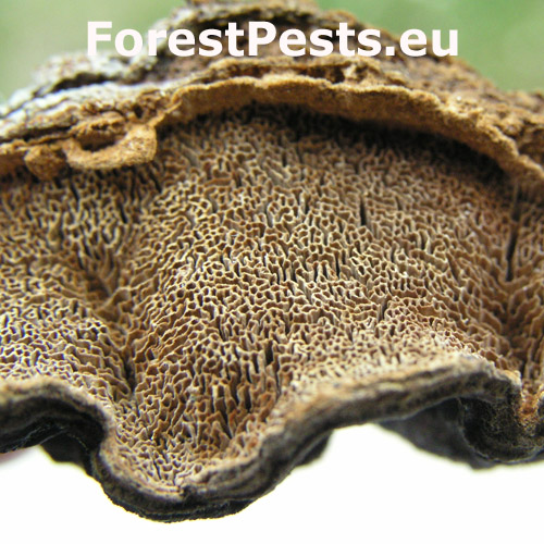 The only fungus habitat is natural spruce woodland in mountain areas. Its biology is both saprophytic and parasitic. Living trees are infected by spores released from sporocarps through trunk or branch injuries. The fruiting bodies are perennial, growing as brackets in a linear or tiered arrangement. They are thin, with felty upper side, of cinnamon colour, later brown to blackish grey, concentrically zoned. The underside is composed of tiny dense tubes of cinnamon brown colour. A characteristic feature of the rot is formation of 5 mm long and 3 mm wide cavities, filled by the intensive wood decomposition with ochre mycelium and later with clusters of white cellulose. The wood in the last decomposition stage breaks easily along the annual rings.