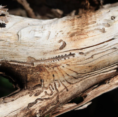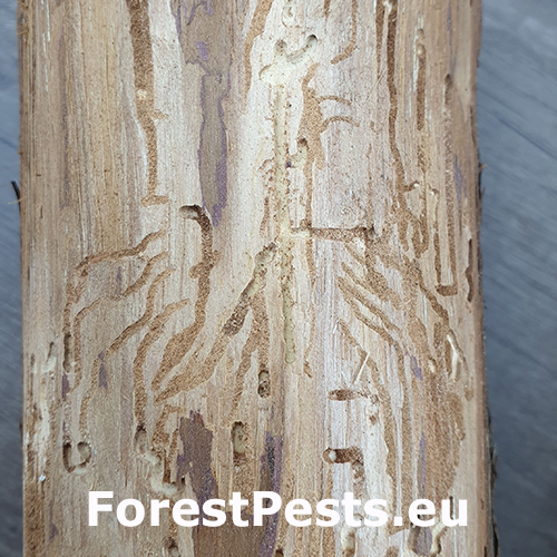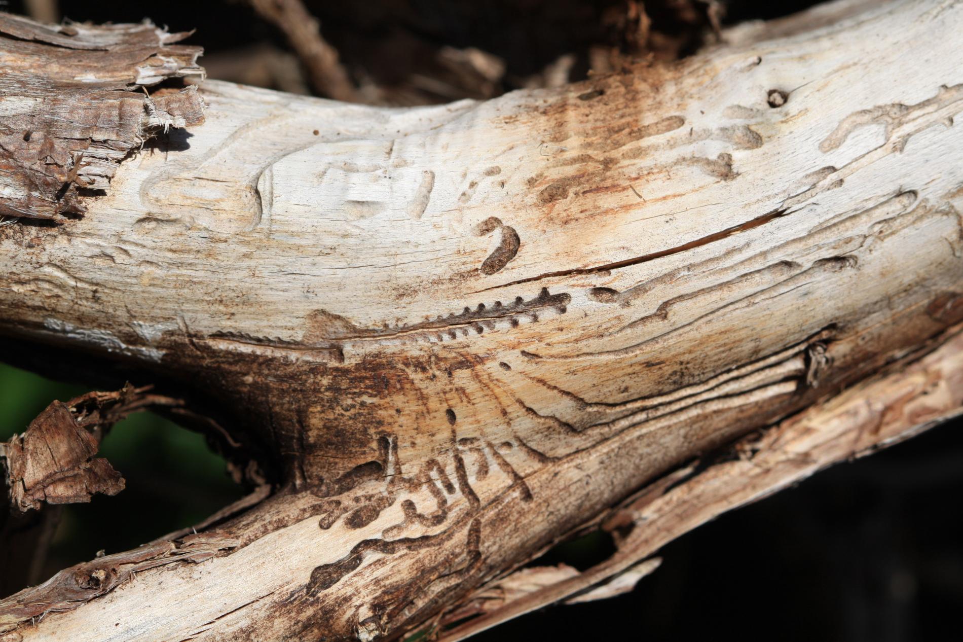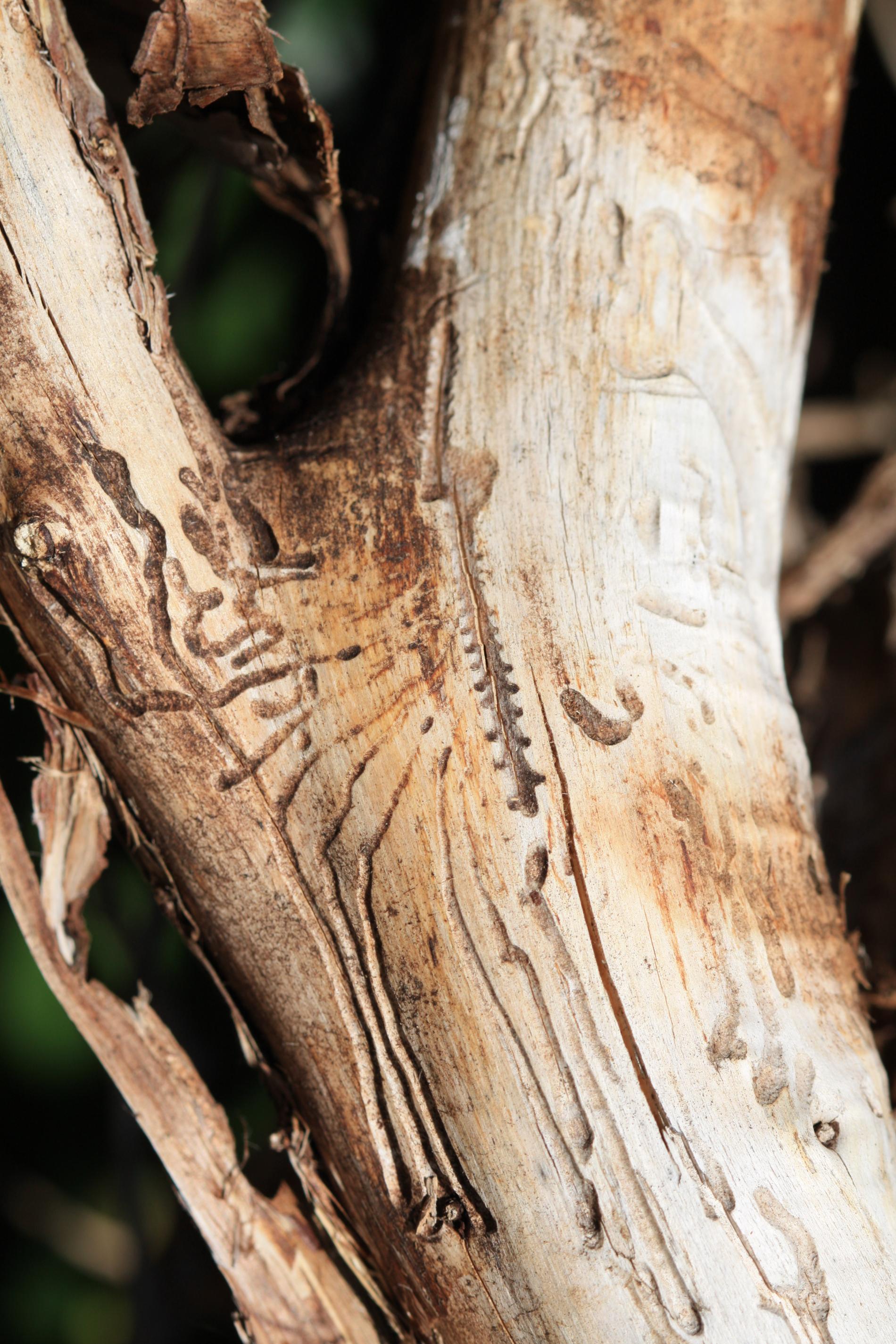 The irregularly curving larval tunnels are excavated into the sapwood.