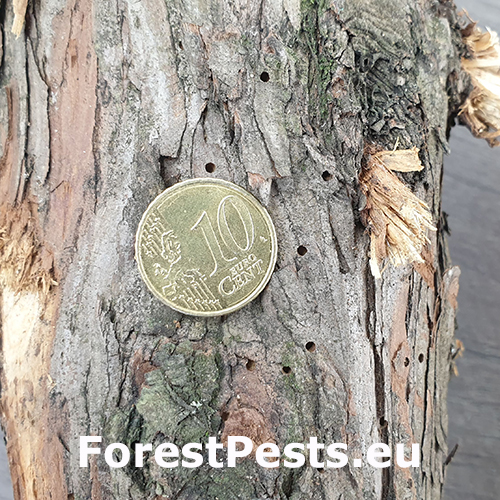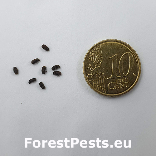 2.0–2.5 mm. Bivoltine. The vertical egg gallery is 4–8 cm long, occasionally forking. The irregularly curving larval tunnels are excavated into the sapwood. The adults feed in one-year-old shoots. The shoot above the attack fades, becomes dry and red, and later falls from the tree. Can cause severe damage (including tree death), particularly when trees are weakened by several consecutive years of drought. Parks, gardens. The related species Phloeosinus thujae is found in southern parts of Europe commonly on juniper and cedar trees.