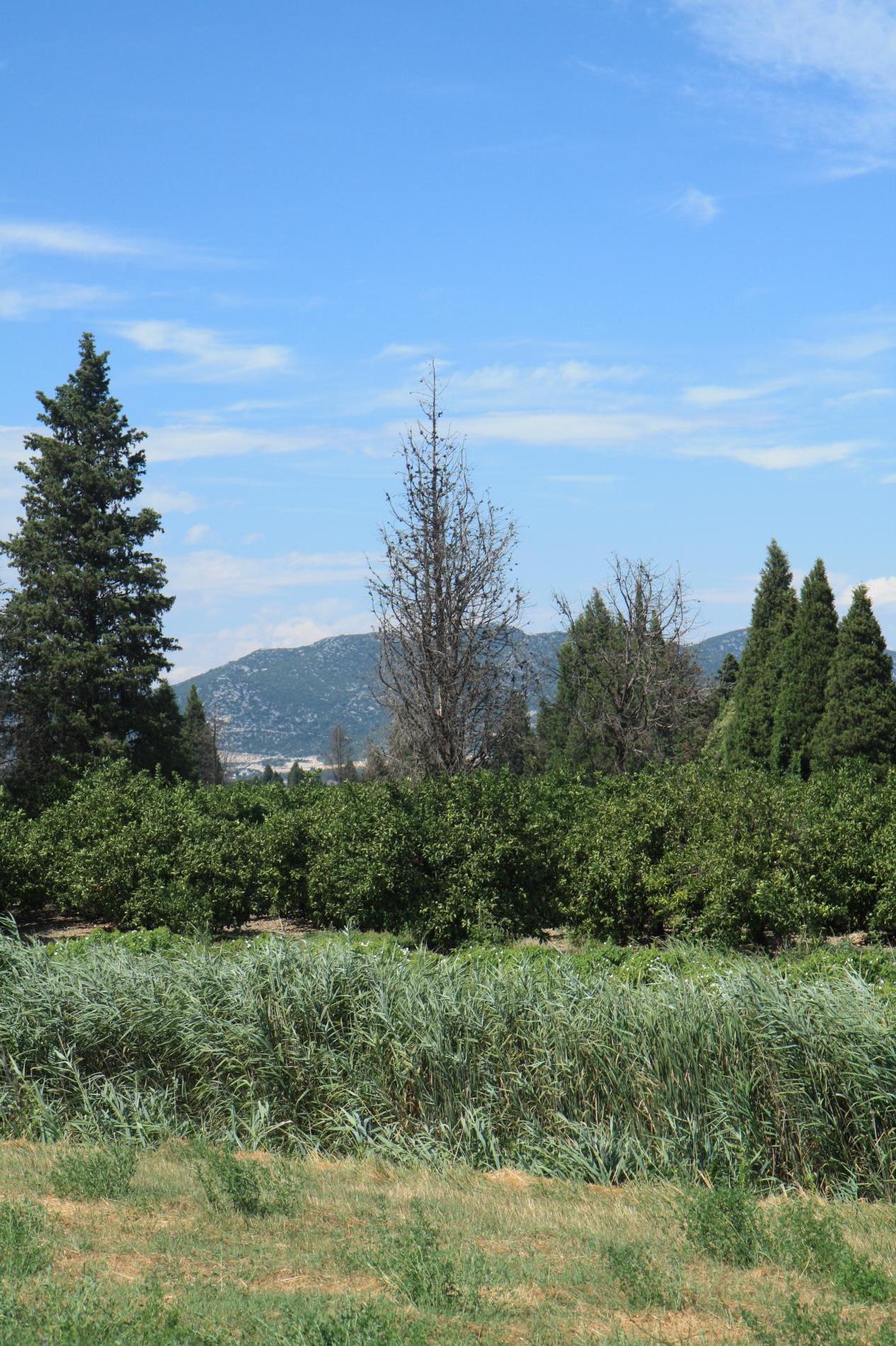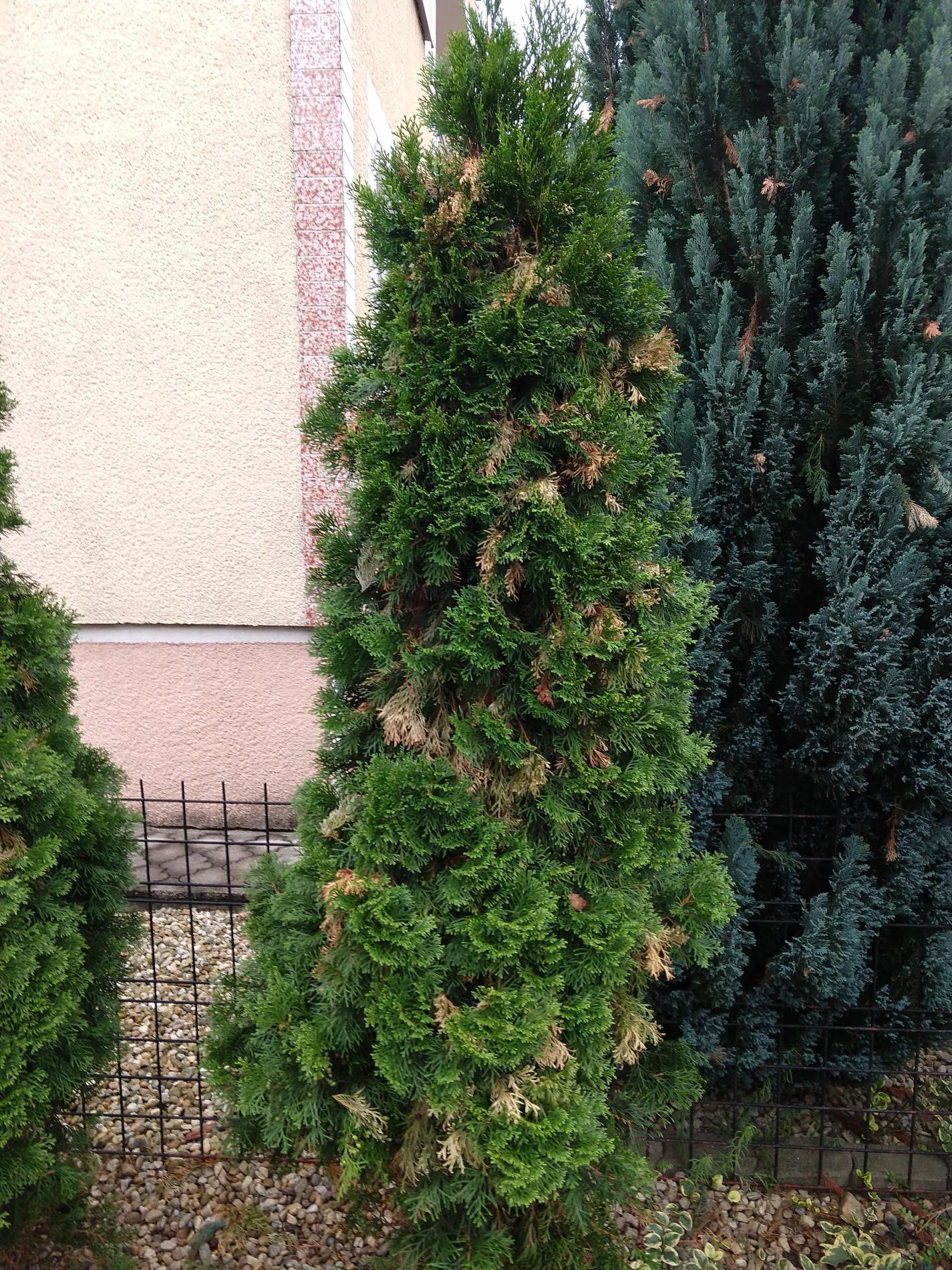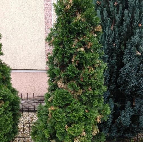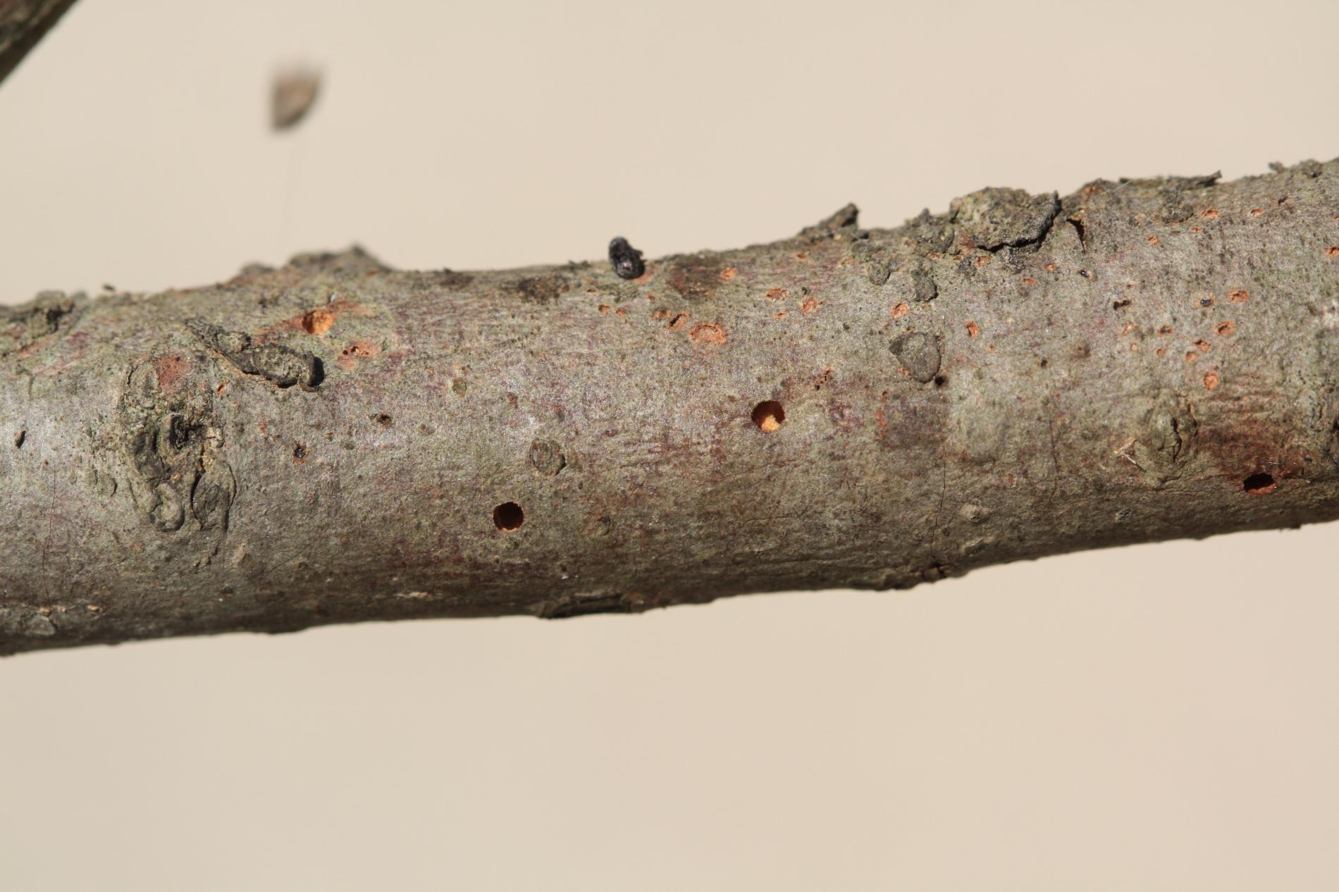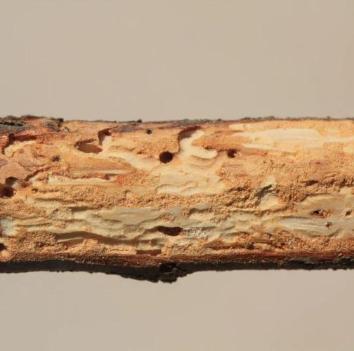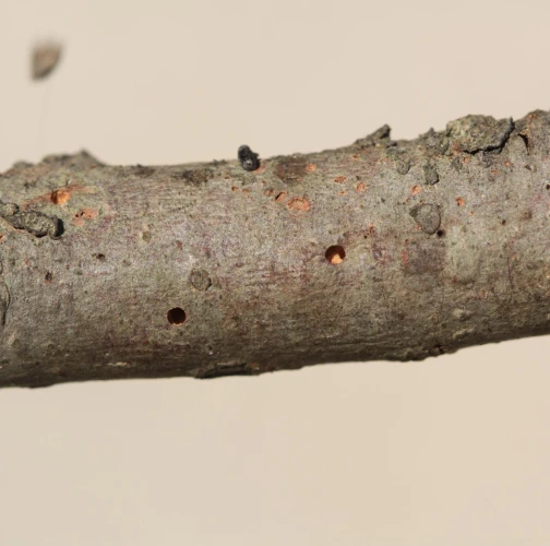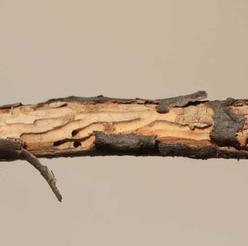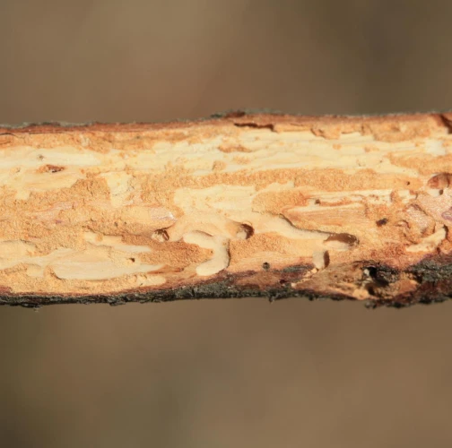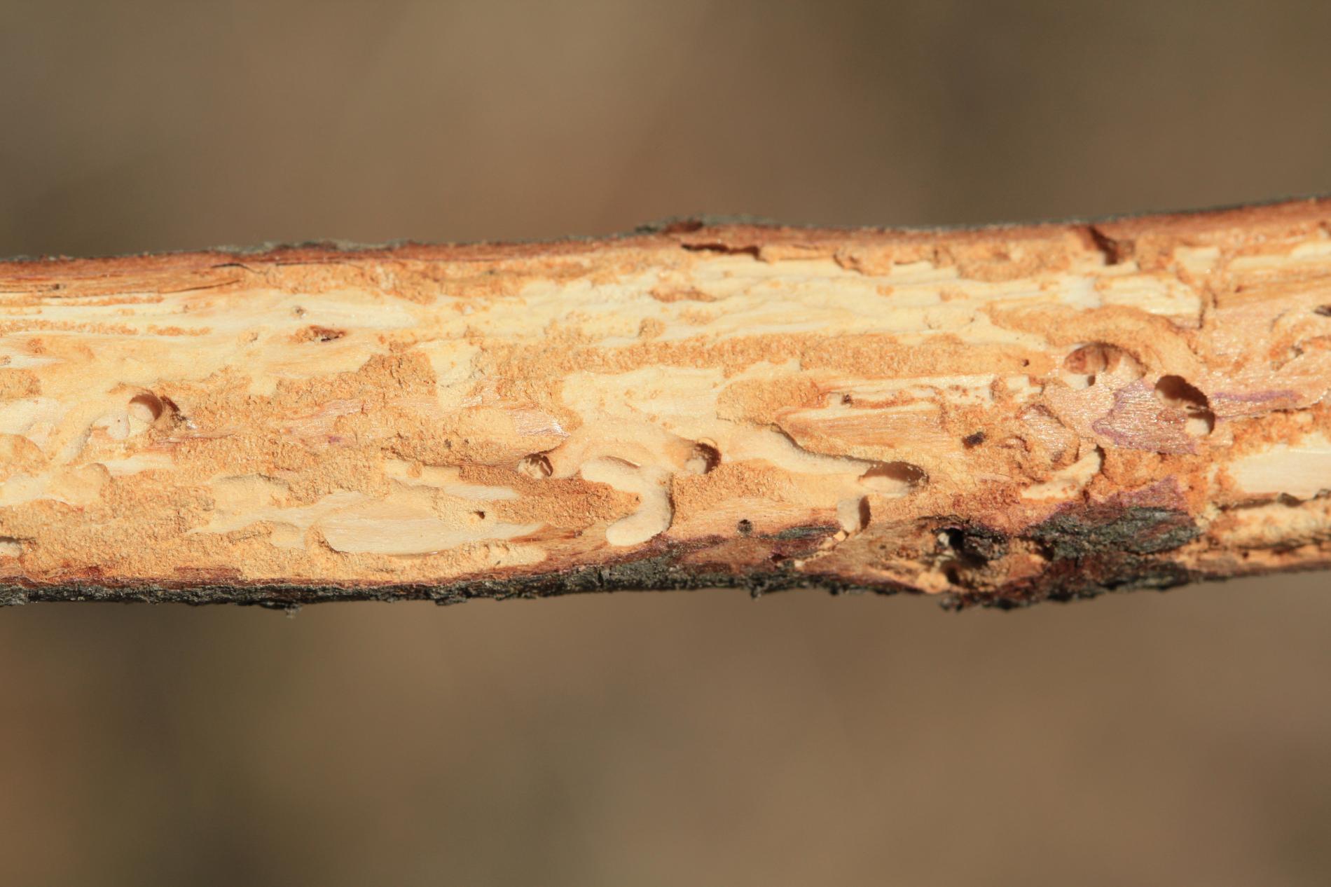 Circular exit holes, gallery under bark, sawdust, drops of resin.