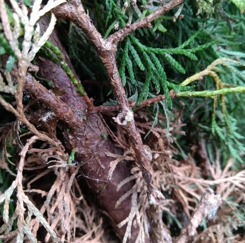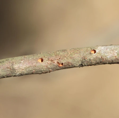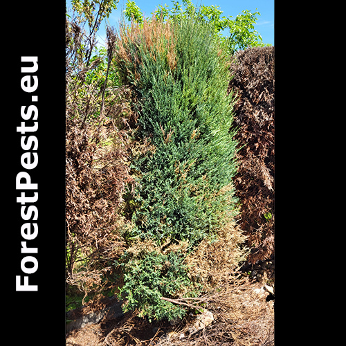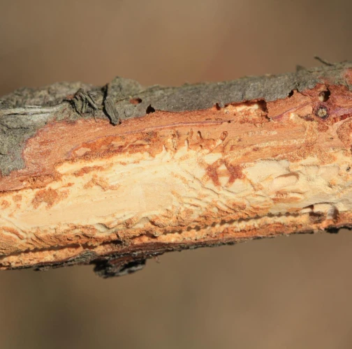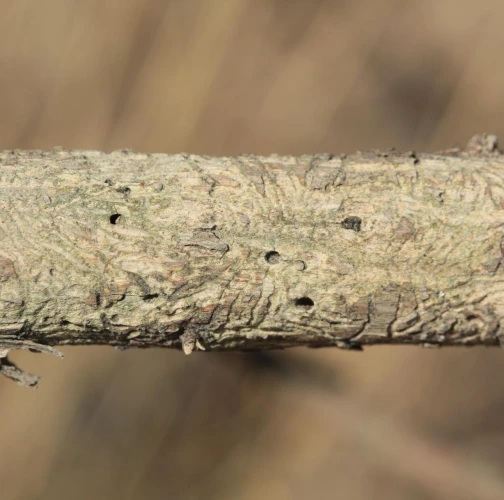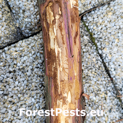 This species is smaller than the Phloeosinus aubei and measures only 1.5 to 2 mm in size. It has a dark brown or black body, and males have relatively prominent serrated teeth on their elytra. Mating occurs from May to June. After mating, females usually create a uniramous gallery where they lay eggs on the sides. The larvae then hatch and create tunnels filled with sawdust. The emergence hole is circular with a diameter of approximately slightly over 1mm. Subsequently, the imagoes undergo a maturation feeding, which is also dangerous. A characteristic of the maturation feeding and gallery formation is the presence of fine sawdust found at the site of the gall. Around entrance holes, the tree may also exude resin. It has one generation per year