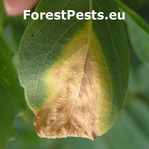 Phloeospora robiniae is a fungal pathogen responsible for leaf spot disease on black locust (Robinia pseudoacacia) and its cultivars. The fungus thrives in humid conditions, particularly after prolonged wet springs. It primarily infects leaves, but can also spread to petioles and young shoots, leading to growth disturbances and premature defoliation. The infection causes local tissue necrosis, which may result in leaf tearing, resembling gall mite damage. Severe infections can affect overall tree vitality by weakening the crown, especially in susceptible cultivars such as Robinia pseudoacacia ‘Umbraculifera’ and ‘Tortuosa’.