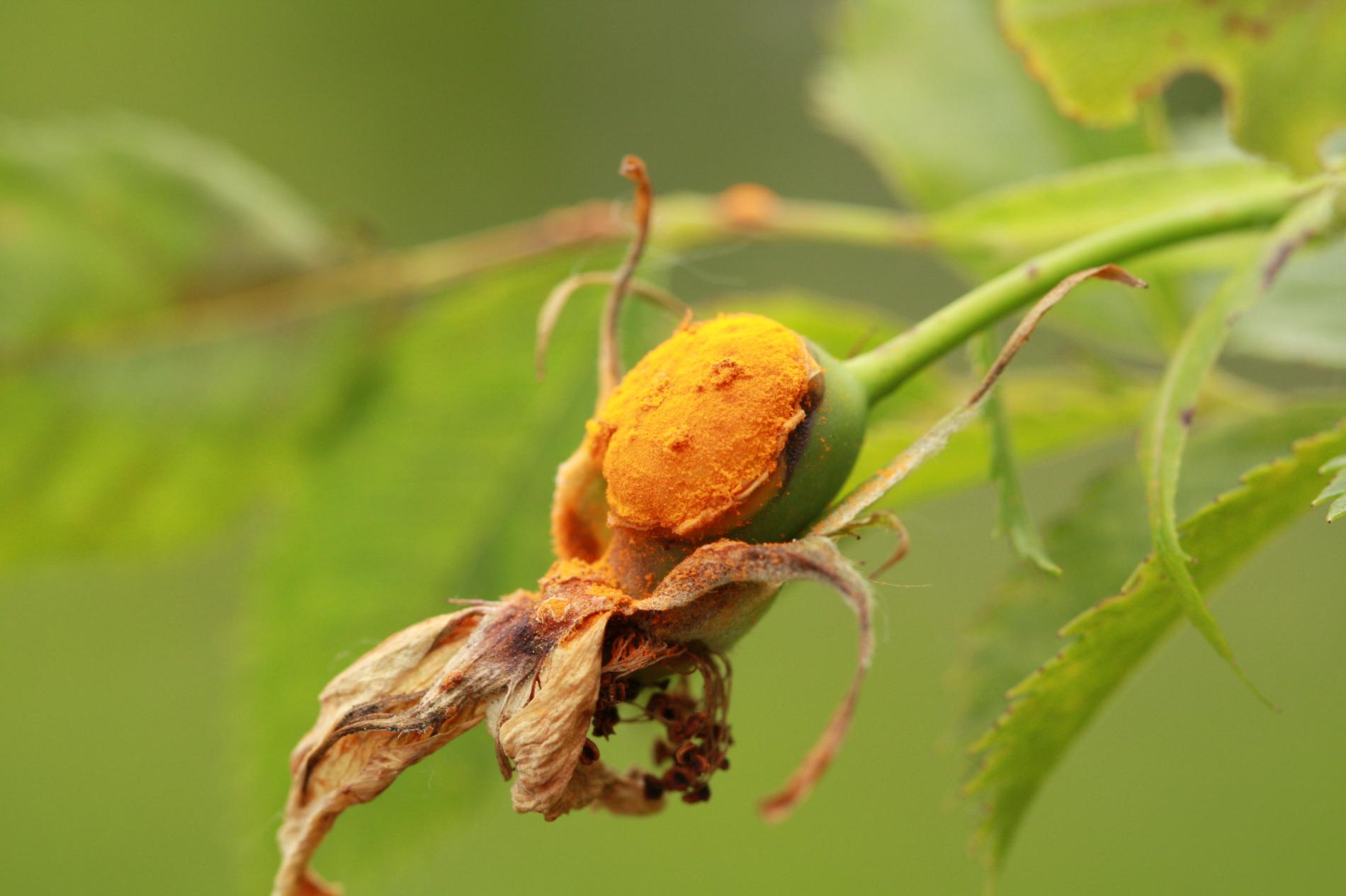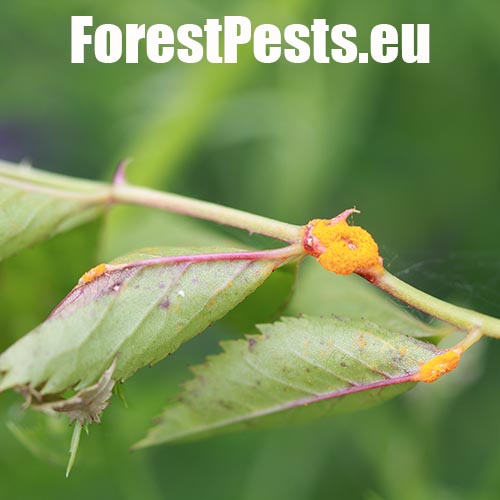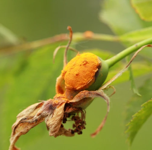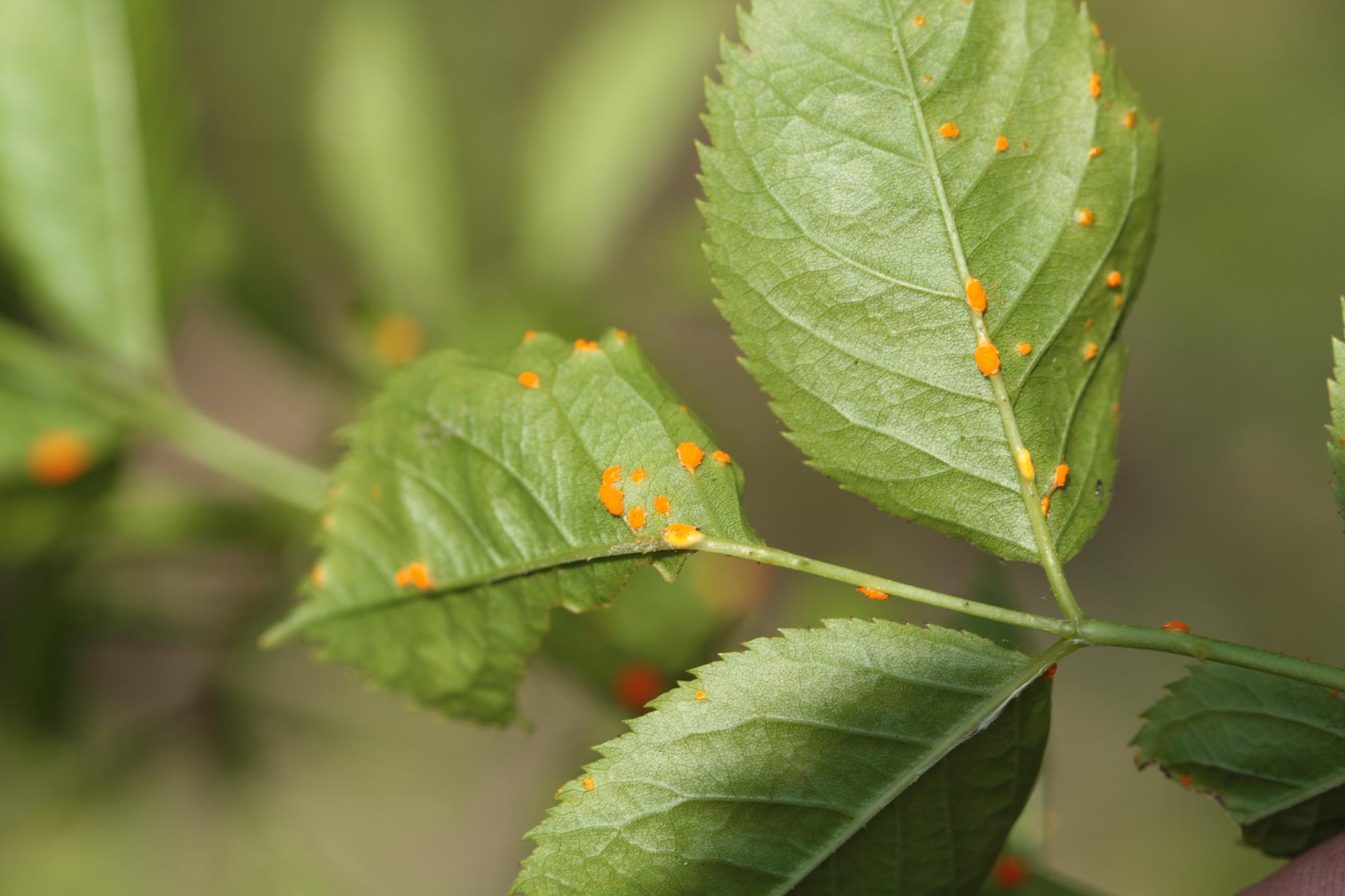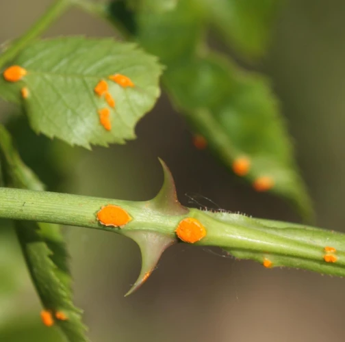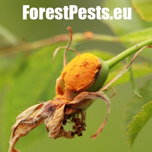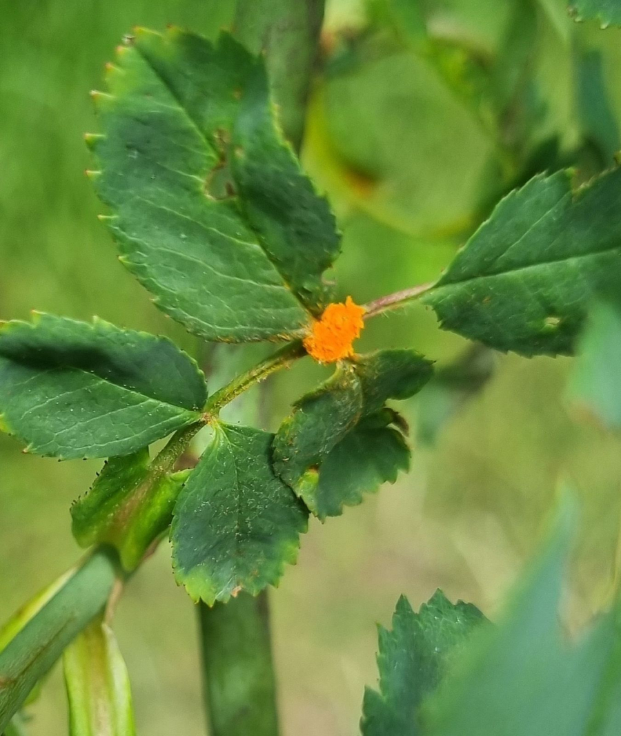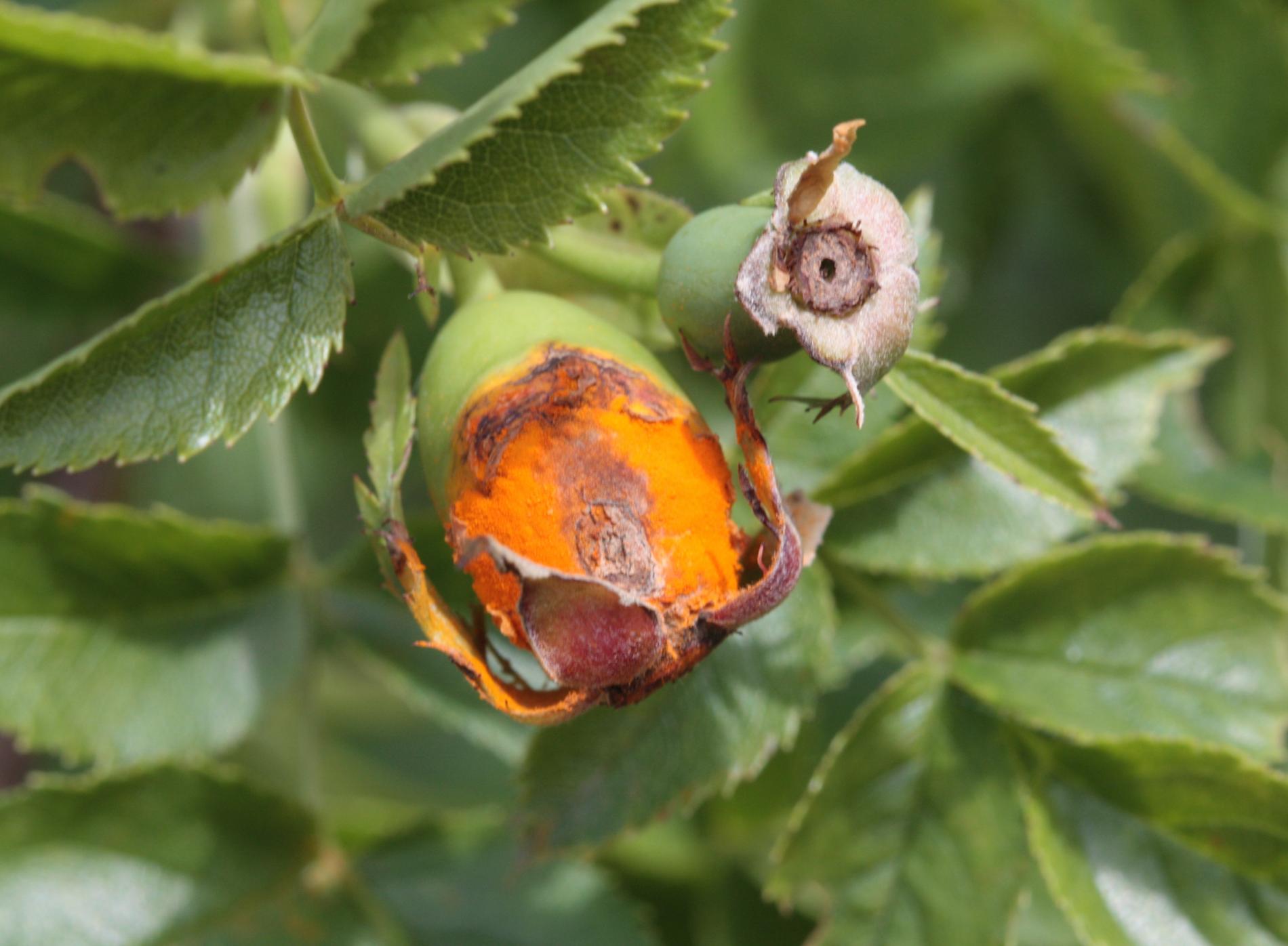 In spring and summer bright orange pustules appear on the leafstalks, branches, leaf underside and any remaining hips.
