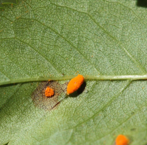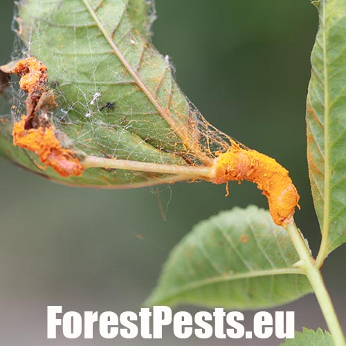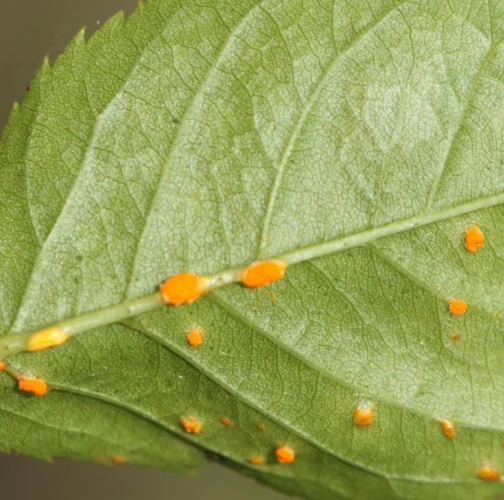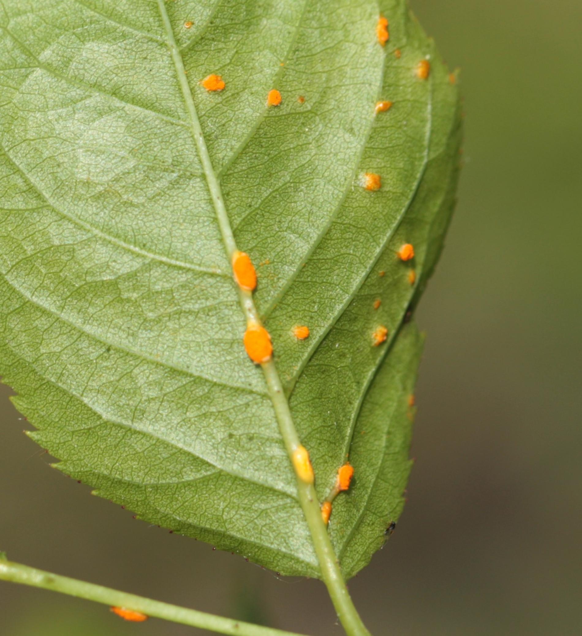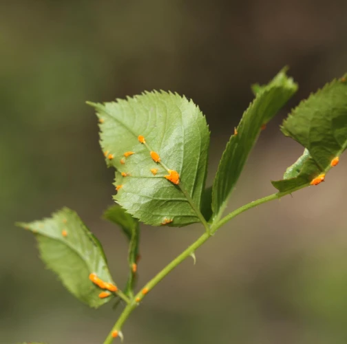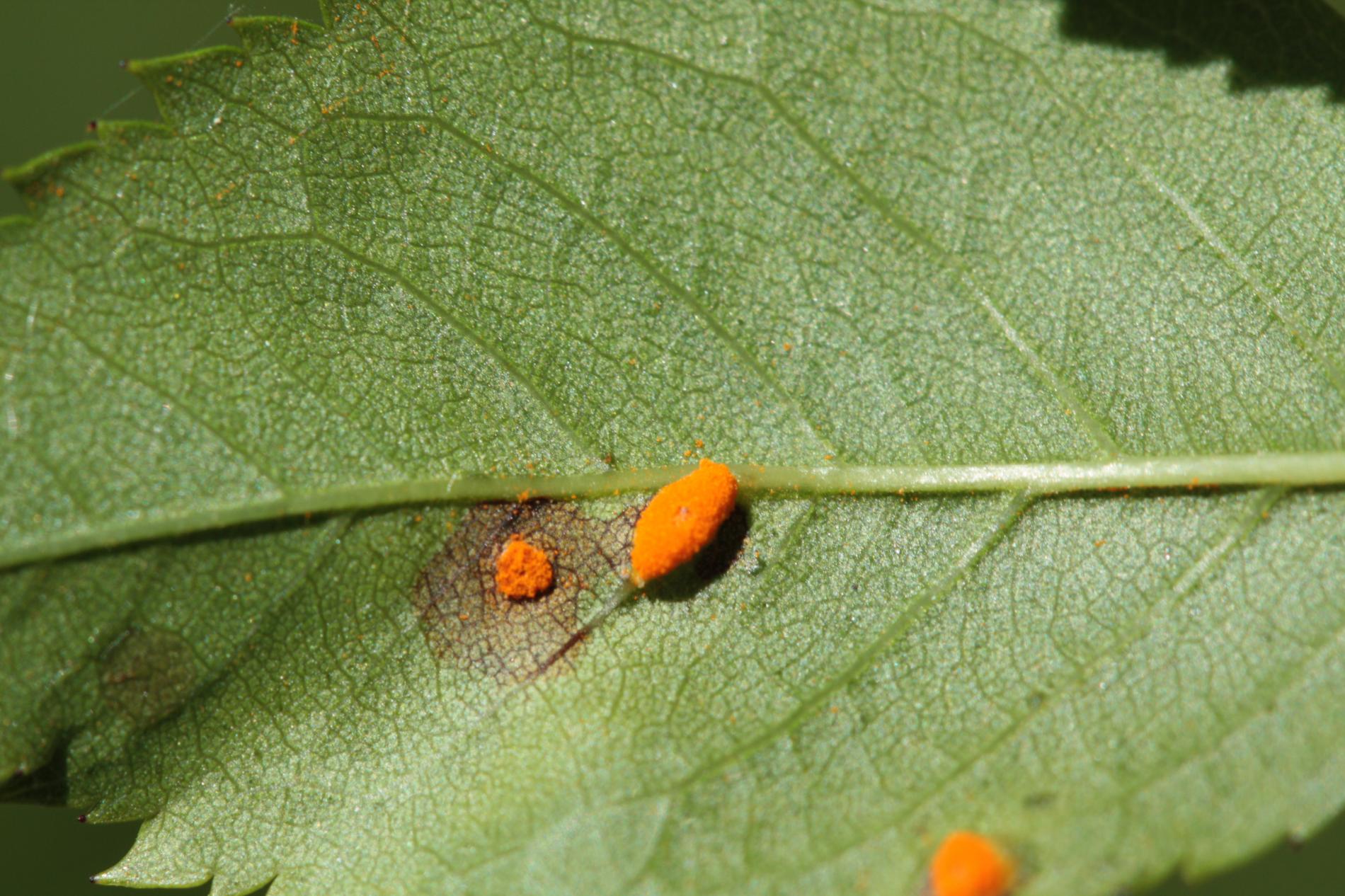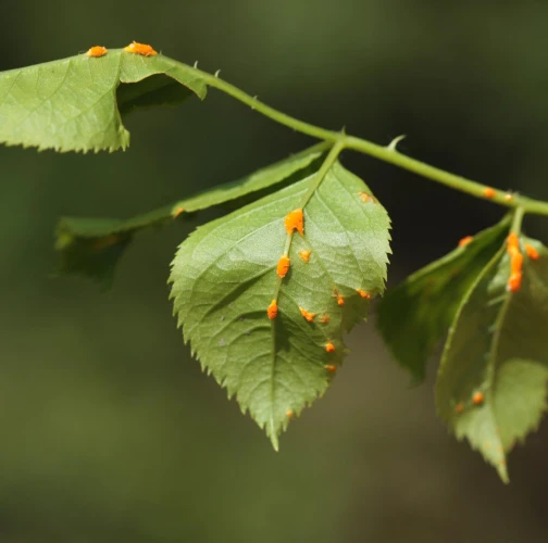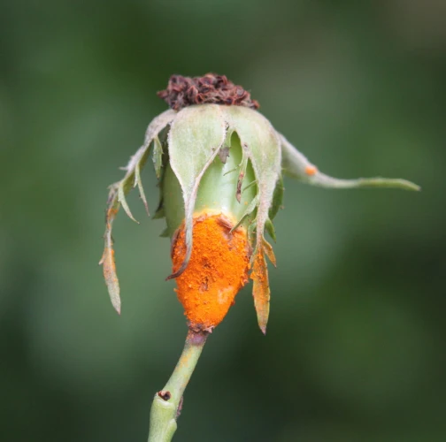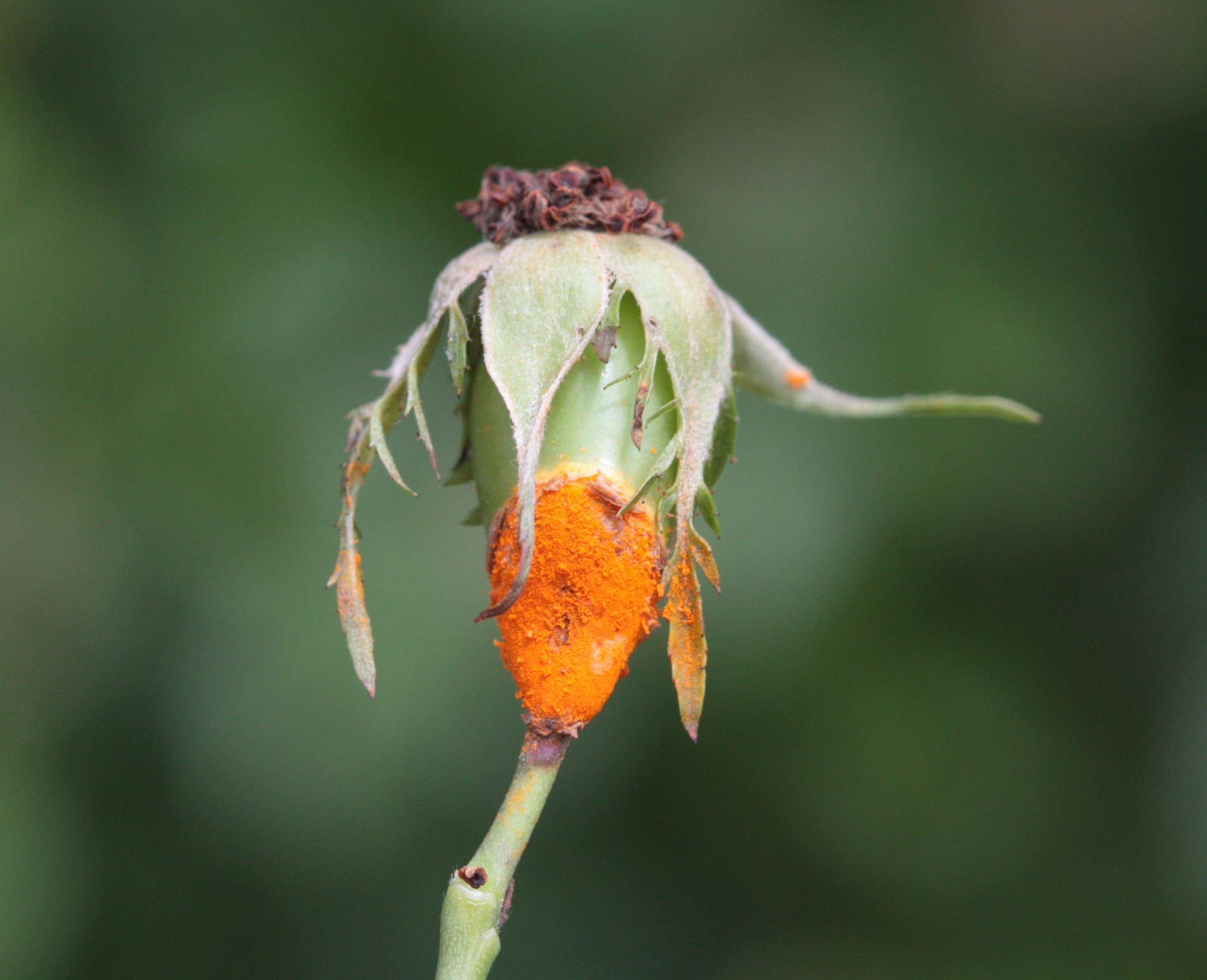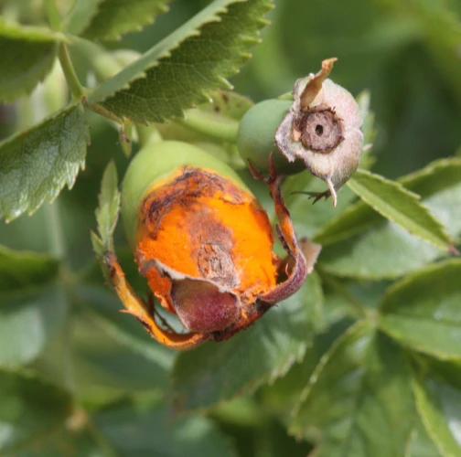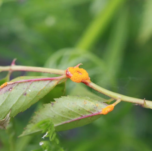 In spring and summer bright orange pustules appear on the leafstalks, branches, leaf underside and any remaining hips.