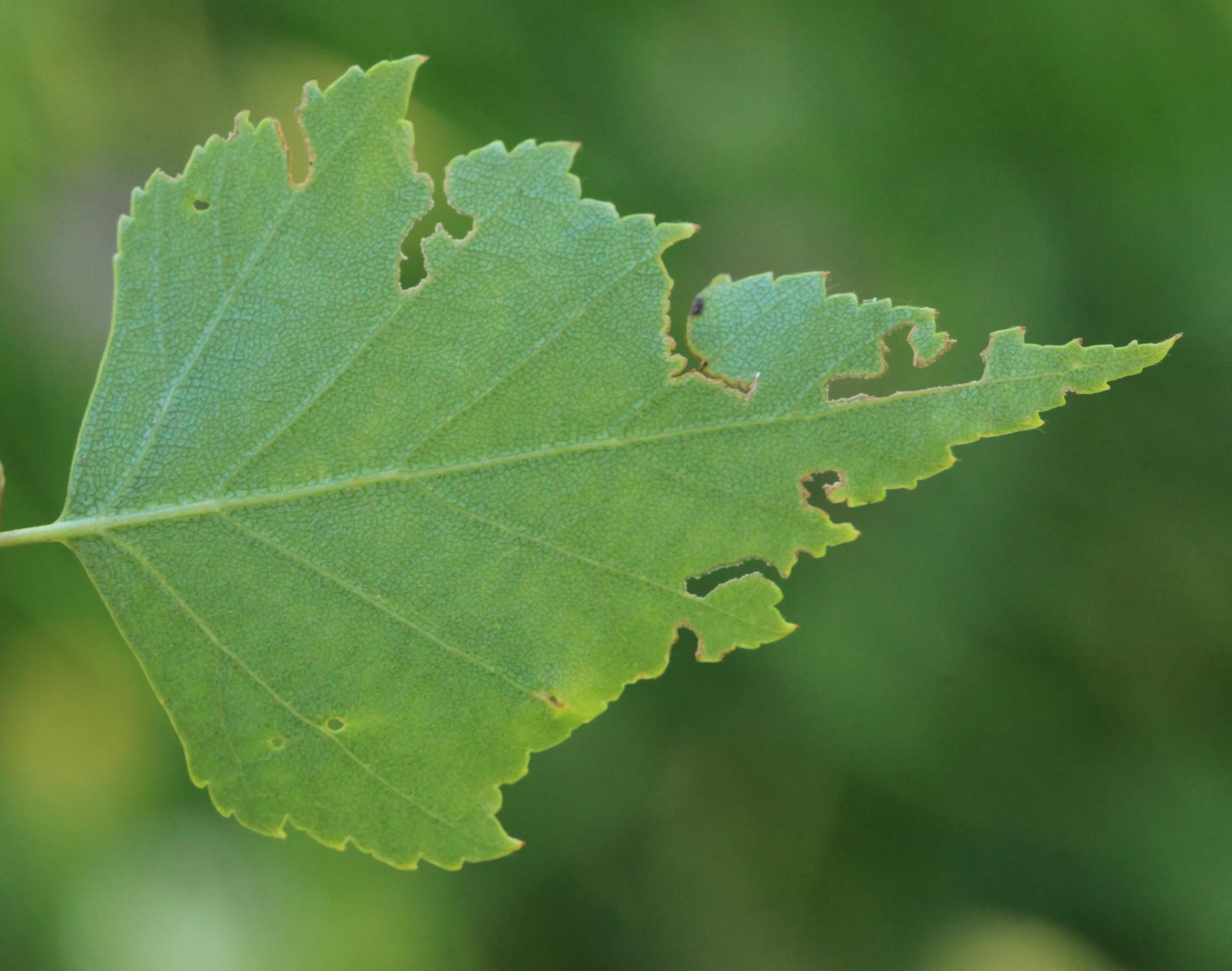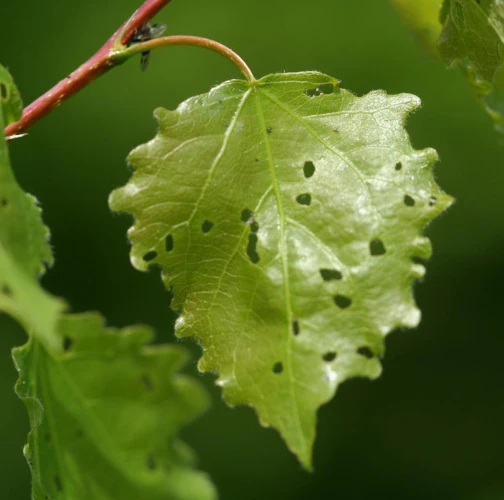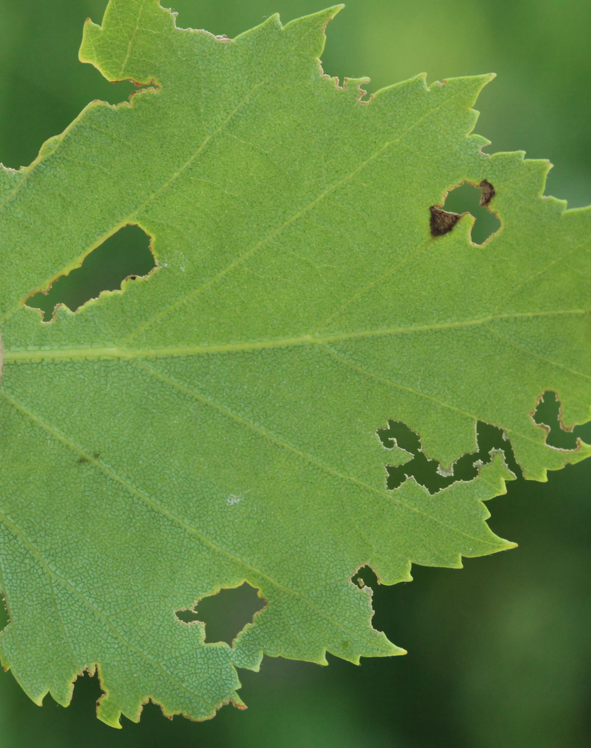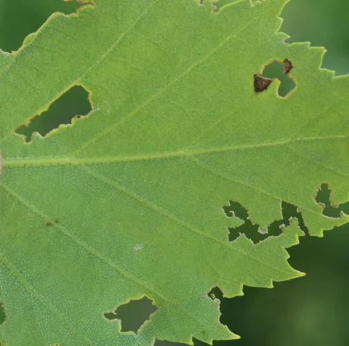 Tiny, often shiny beetles present on the leaves. Traces of feeding, mostly at the edges of the leaves. Irregularly shaped holes, notches, or skeletonization of the leaves.
