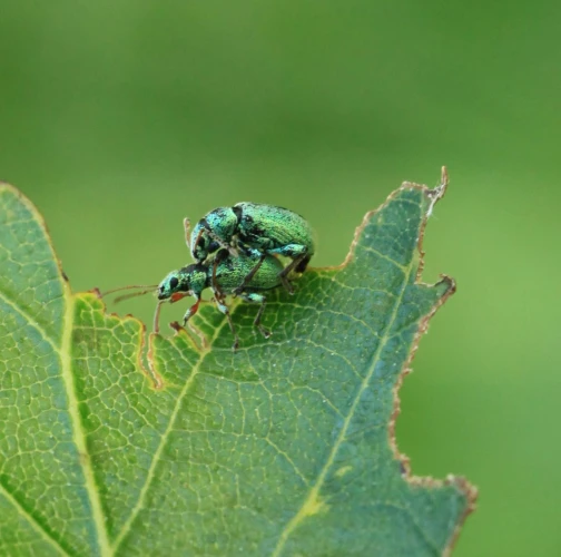 The beetle of the genus Phyllobius and Polydrusus is a type of weevil commonly found in various regions. Tehre are many very similar species. They are known to cause damages to the leaves of their host trees. Phyllobius and Polydrusus beetles primarily feed on deciduous trees, including oak (Quercus spp.), birch (Betula spp.), and willow (Salix spp.) species. But they can feed also on many other host trees. These beetles consume leaf tissue, resulting in irregularly shaped holes, notches, or skeletonization of the leaves. The extent of damage caused by Phyllobius and Polydrusus beetles can vary depending on the population size and the health of the host trees. It is important to monitor and manage these beetles to protect the overall health and vitality of affected trees.
