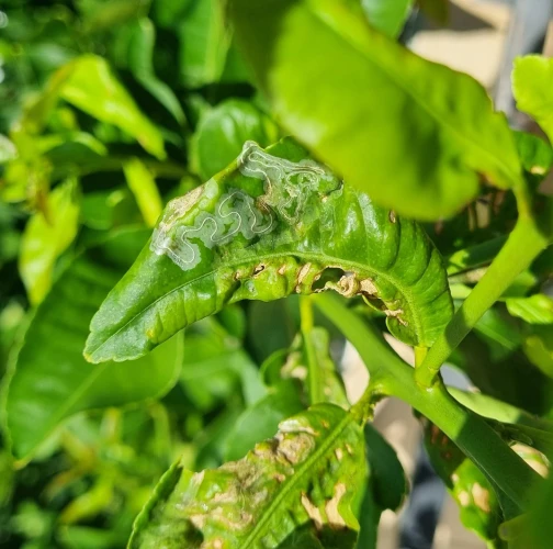 One of the most recognizable signs of CLM infestation is the presence of serpentine mines on citrus leaves. These mines are created by the larvae as they feed within the leaf tissue, leaving characteristic winding trails. Infested leaves may exhibit curling or distortion, particularly along the edges. This curling occurs when larvae pupate within the leaf, causing it to roll or fold over. In addition to mines and curling, CLM feeding can cause blistering or blister-like damage on the leaf surface. This damage may appear as raised areas or patches of silvery discoloration.