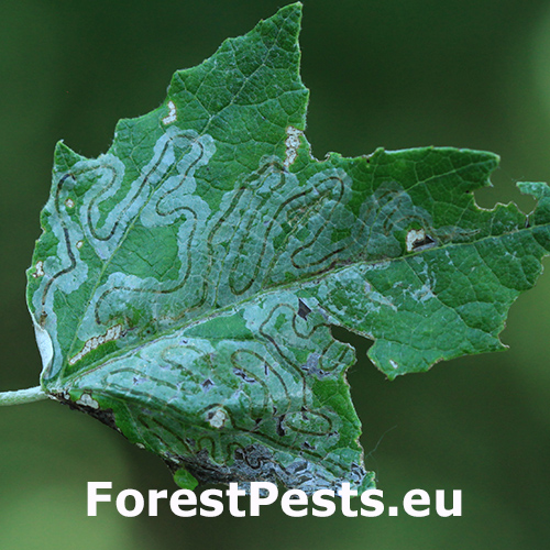 Leaves show wide, winding mines with dark central frass lines, primarily affecting Populus alba and Populus tremula leaves.