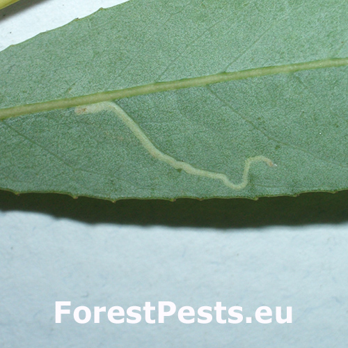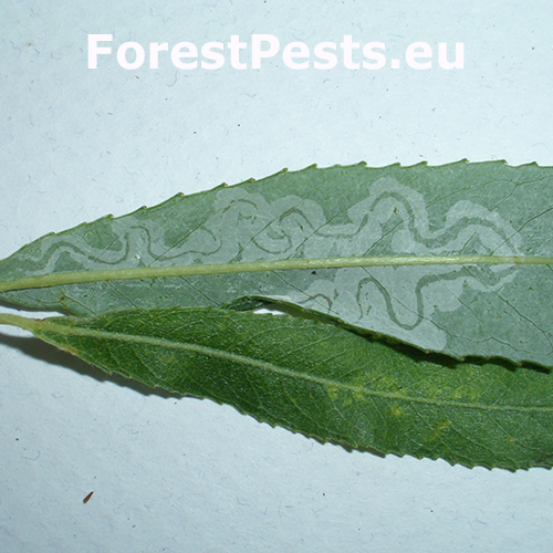 The presence of Phyllocnistis saligna is recognizable by serpentine mines on willow leaves, often following the leaf veins, which can reduce the aesthetic value and vitality of the trees as well as decrease photosynthesis. Mines are often also present on shoots.