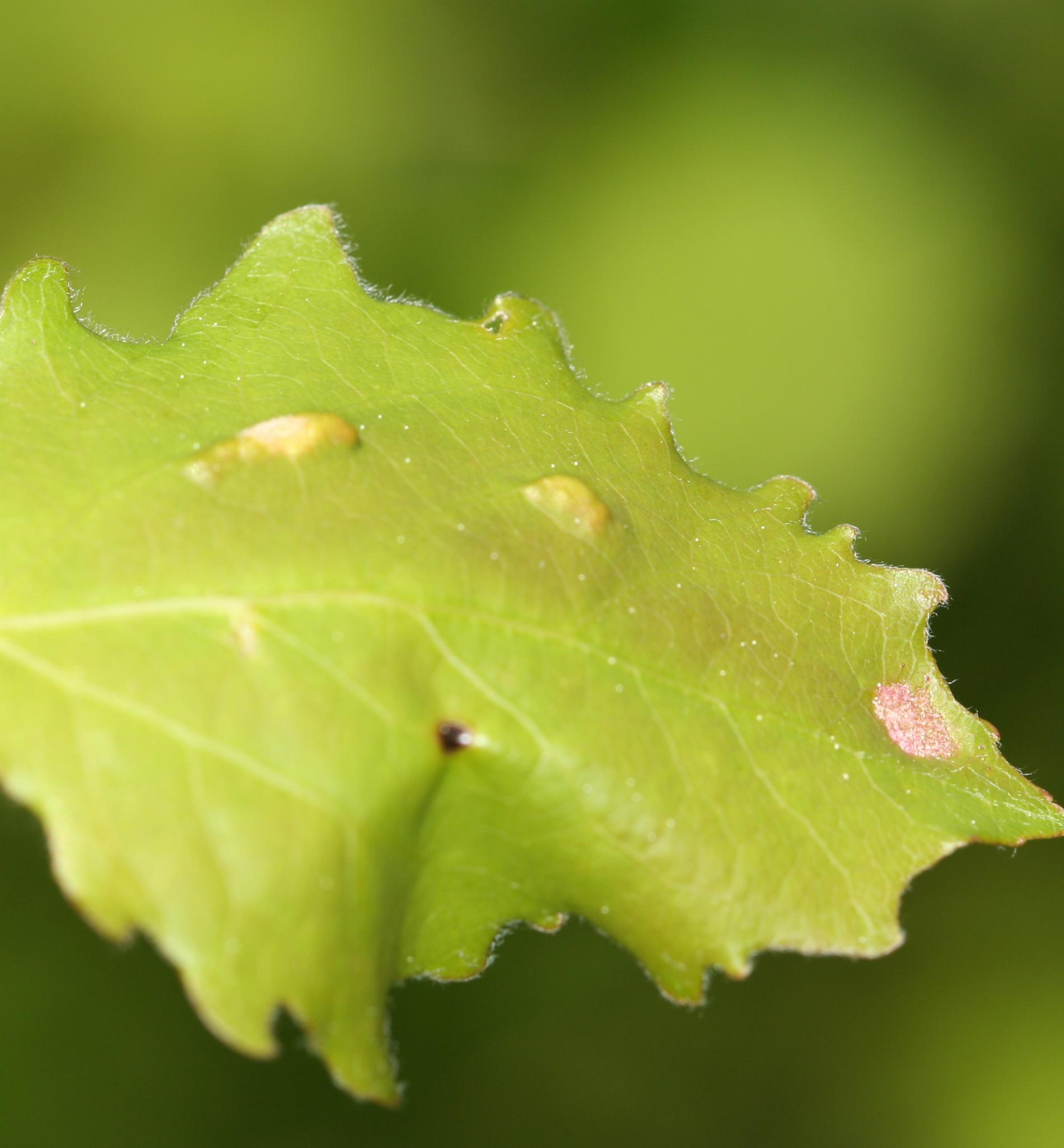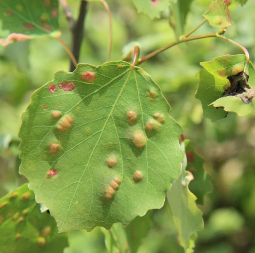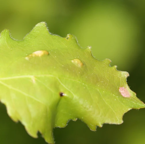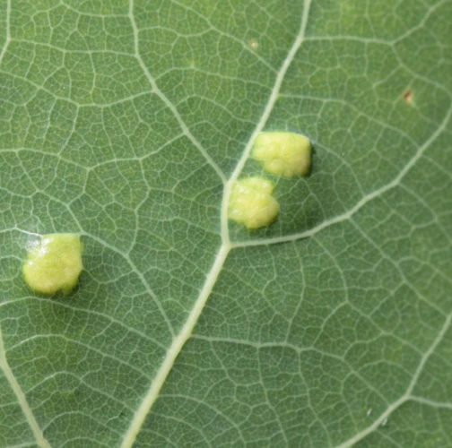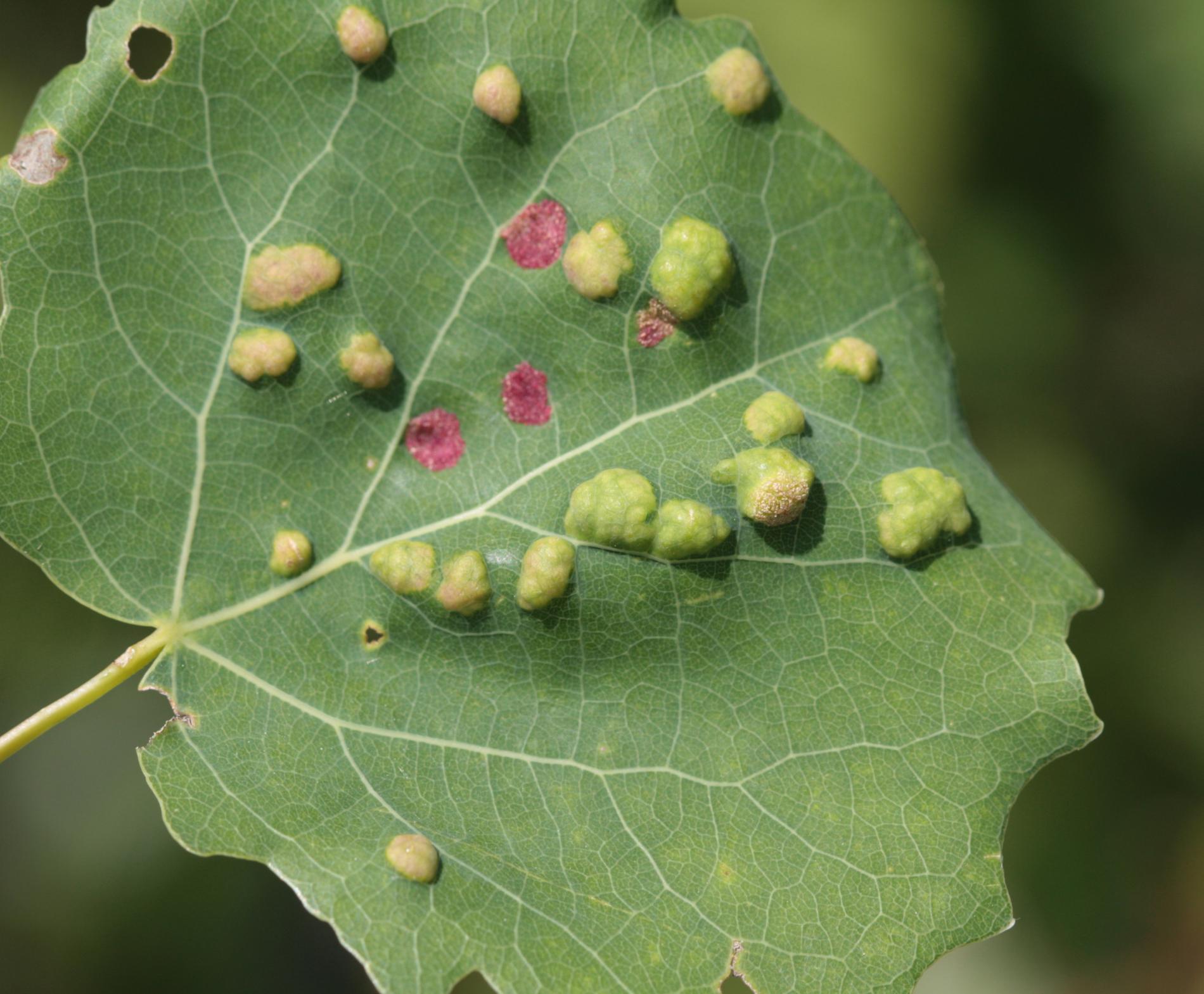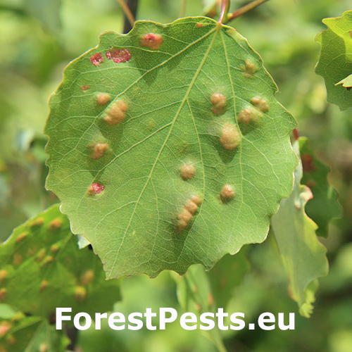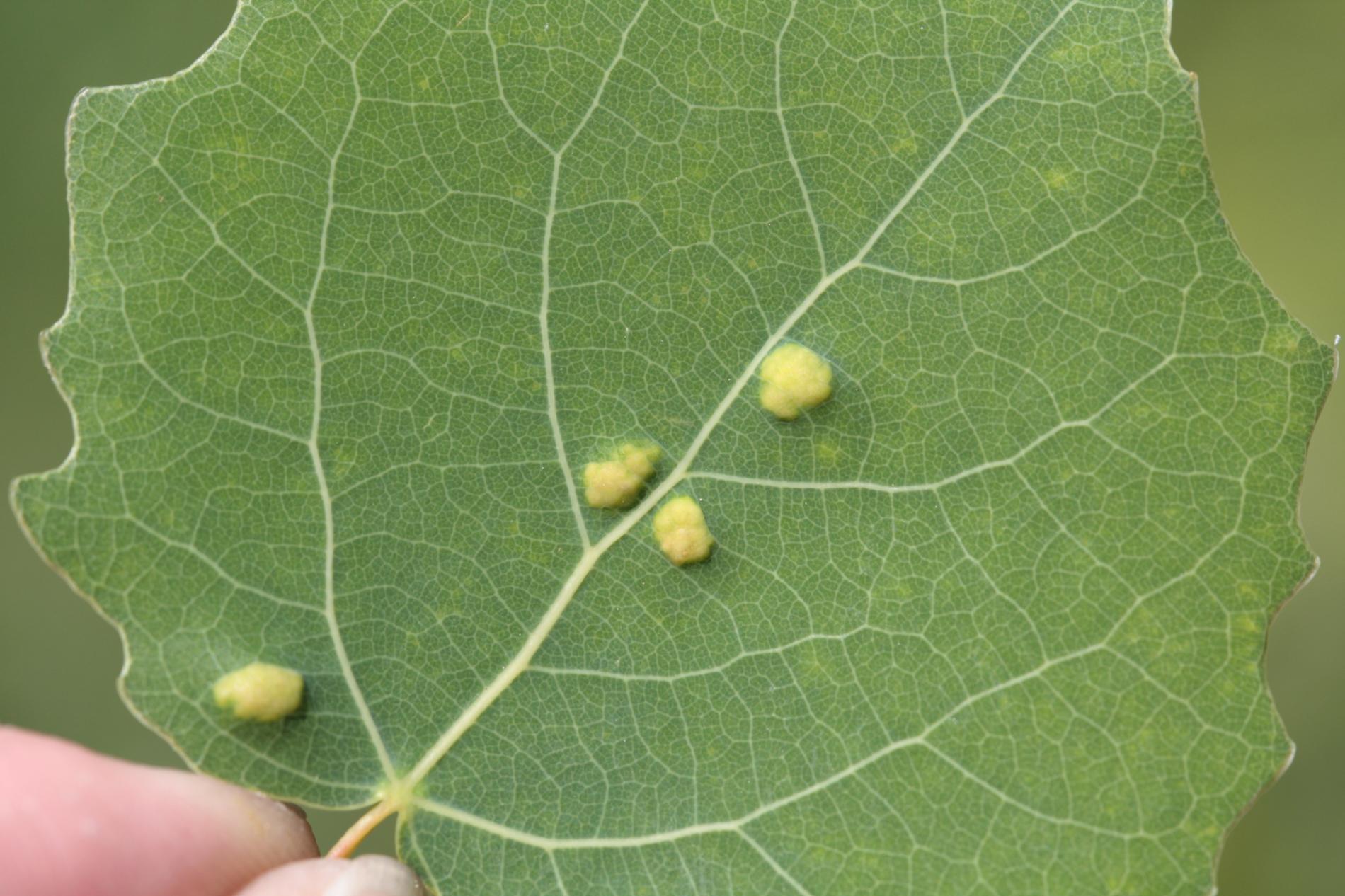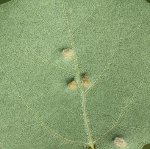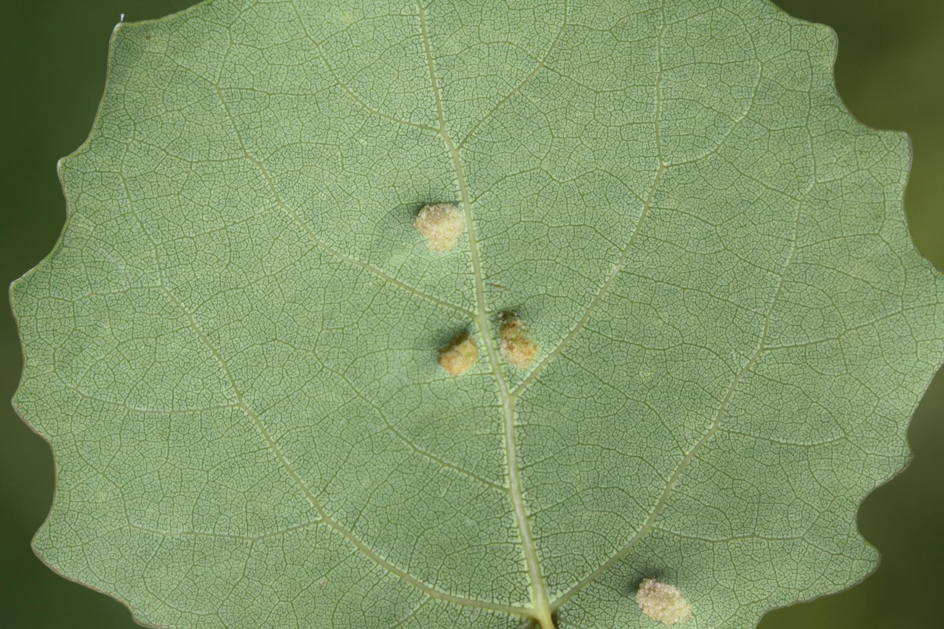 Phyllocoptes populi is a species of mite (acari), that is known to cause damages to the leaves of poplar trees. These mites are microscopic in size and typically infest the underside of the leaves. They feed on the leaf tissue, resulting in a variety of symptoms and damages. Infested poplar leaves may display symptoms such as leaf curling, distortion, and discoloration. Galls induced by this species are small pale swellings on the upper surface of the leaf. The same swellings are seen as red hairy areas on the bottom of the leaf. Sometimes hairy areas can be found on top side of the leaves too. The damages caused by Phyllocoptes populi mites can weaken the affected poplar trees, affecting their overall health and vigor.