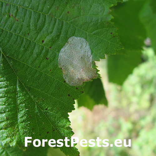 Phyllonorycter coryli, commonly known as the nut leaf blister moth, is a small moth in the Gracillariidae family with a wingspan of 7–9 mm. It is distributed across most of Europe, excluding part of the Balkan Peninsula. The larvae primarily feed on species within the Corylus genus, including Corylus avellana (common hazel), Corylus colurna, and Corylus maxima, as well as Ostrya carpinifolia. The larvae mine the upper surface of leaves, forming silvery, blotch mines. The pupae overwinter in cocoons inside the mines, with frass accumulated in the opposite corner. P. coryli has two generations per year, with larvae active in July and again from September to October.