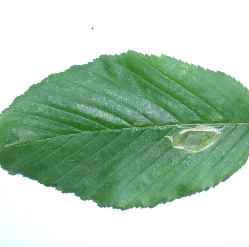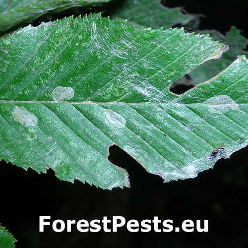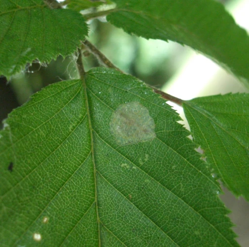 Leaves have silvery, upper-surface blotch mines that cause significant leaf folding and contraction. Multiple mines can lead to reduced photosynthesis and premature leaf drop.