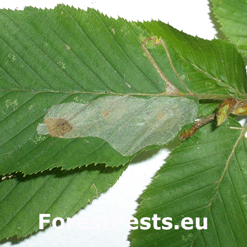 Phyllonorycter esperella, commonly known as the dark hornbeam midget, is a small moth in the Gracillariidae family with a wingspan of 7–9 mm. This species is distributed across Europe, from Sweden to the Pyrenees, Italy, Greece, and from Great Britain to Ukraine. P. esperella primarily targets Carpinus betulus (hornbeam) and Ostrya carpinifolia as host plants. The larvae mine the upper surface of leaves, creating roundish, silvery blotch mines that are centered over side veins. In early stages, the mine appears flat, but as it matures, it contracts significantly, often causing the leaf to fold strongly. P. esperella has two generations per year, with adults emerging in May and again in August, while larvae are active in July and from September to October.
