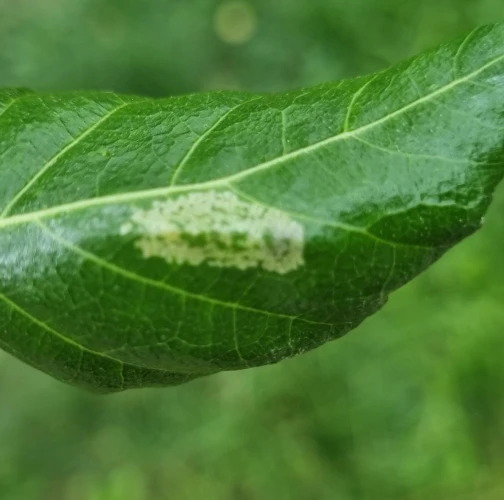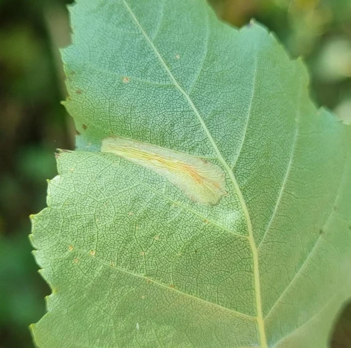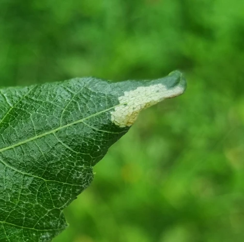 On the underside of birch leaves, there are small, tentiform mines with greenish-yellow lower epidermis, which becomes weakly folded. Frass accumulates in one corner of the mine.