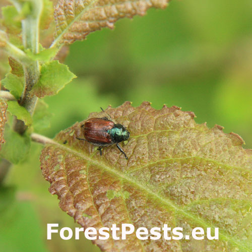 A tiny chafer, about 10-12 mm long. It swarms towards the end of May and in June, at higher altitudes even later. The grubs live in the soil, where they feed on plant roots. Adult beetles damage leaves of some broadleaved species by their maturation feeding. On the leaves occur perforations, the veinlets mostly remain intact. It is harmful especially in forest nurseries and at higher altitudes. The generation is annual. It is one of  the commonest chafers in Europe.