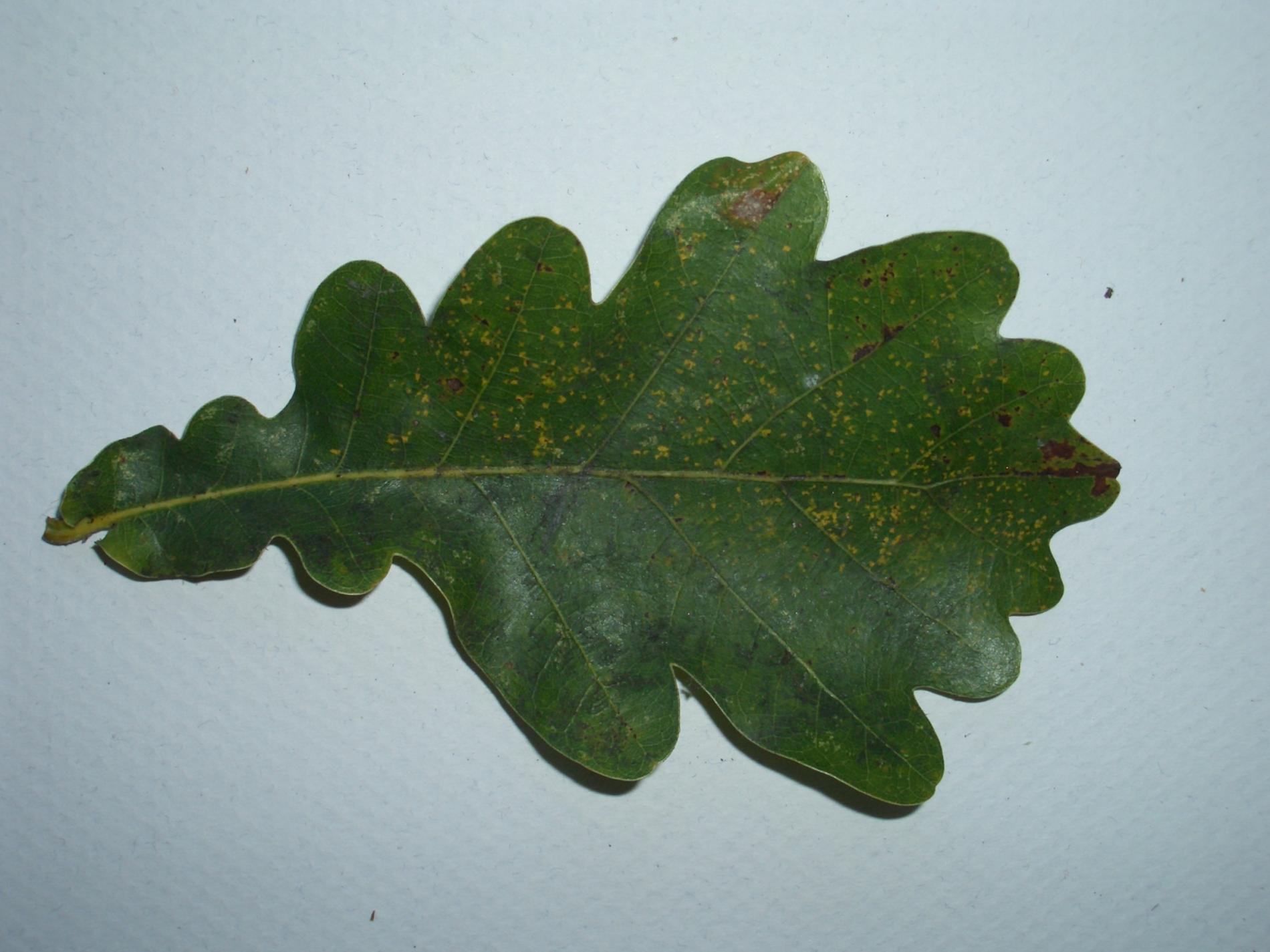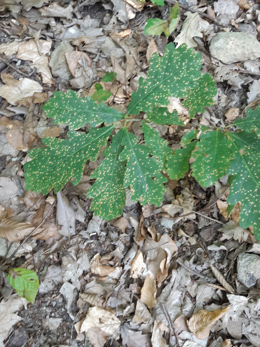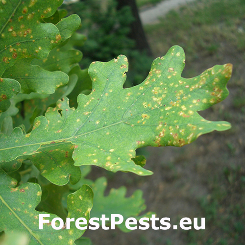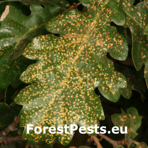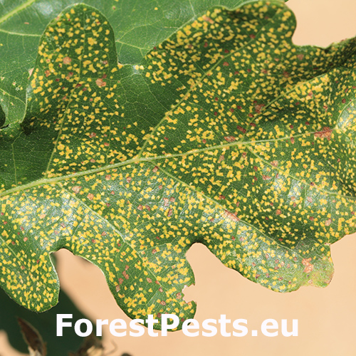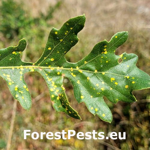 On infested oaks, small orange-yellow or necrotic spots appear on the underside and topside of leaves. In severe cases, leaves may show discoloration, curling, or deformation. Infested leaves may also drop prematurely. On the underside, very small Phylloxera individuals in creamy yellow or yellow color can be observed. These individuals are very tiny and not easily visible to the naked eye.
