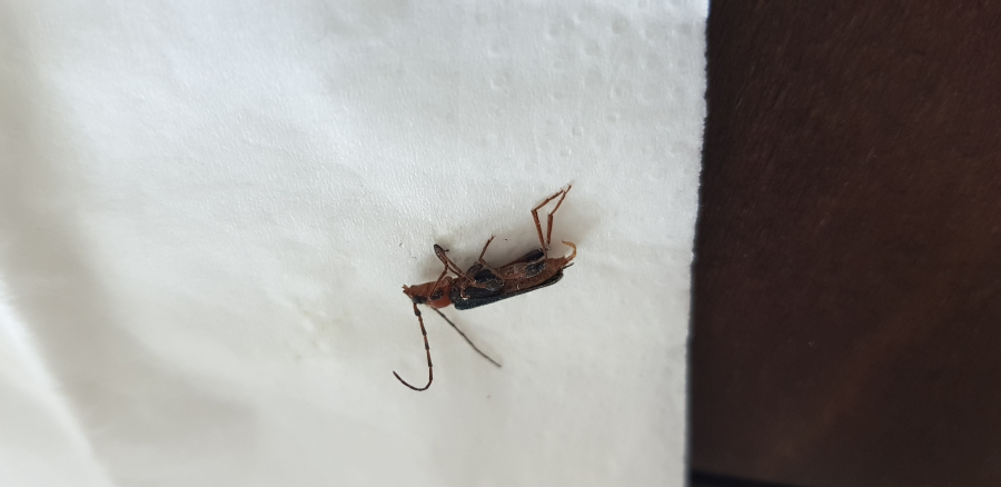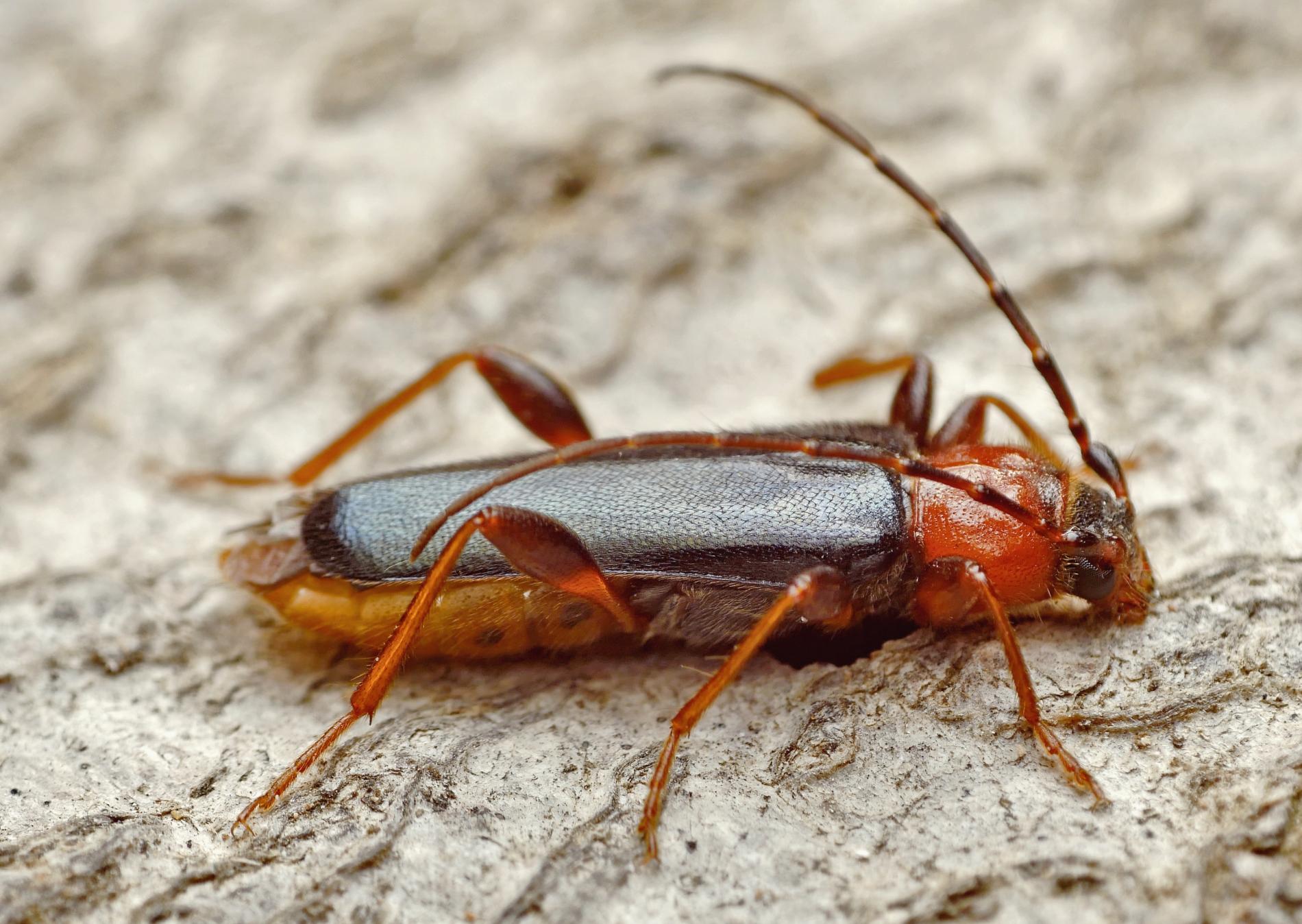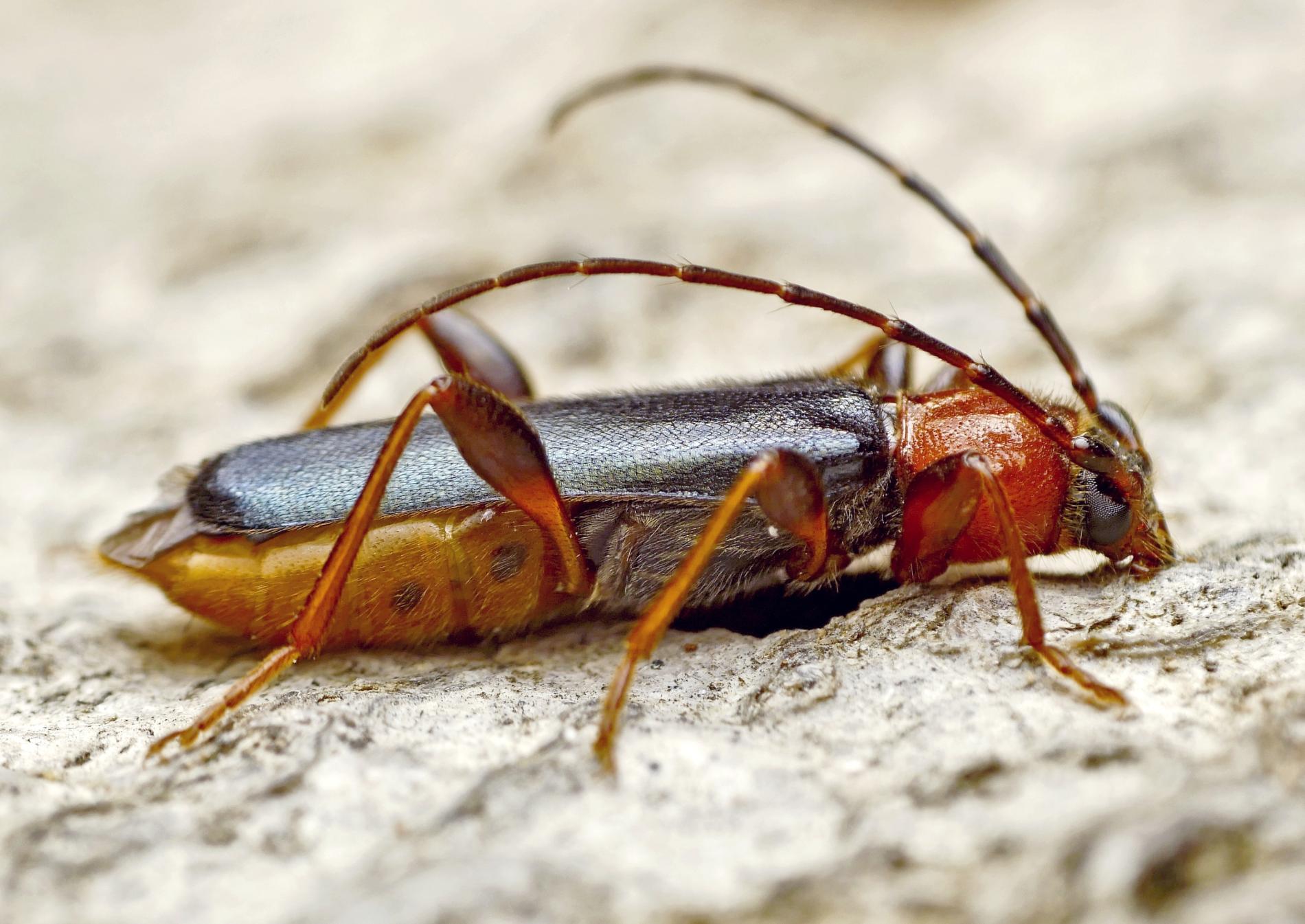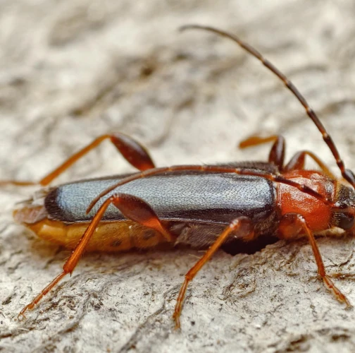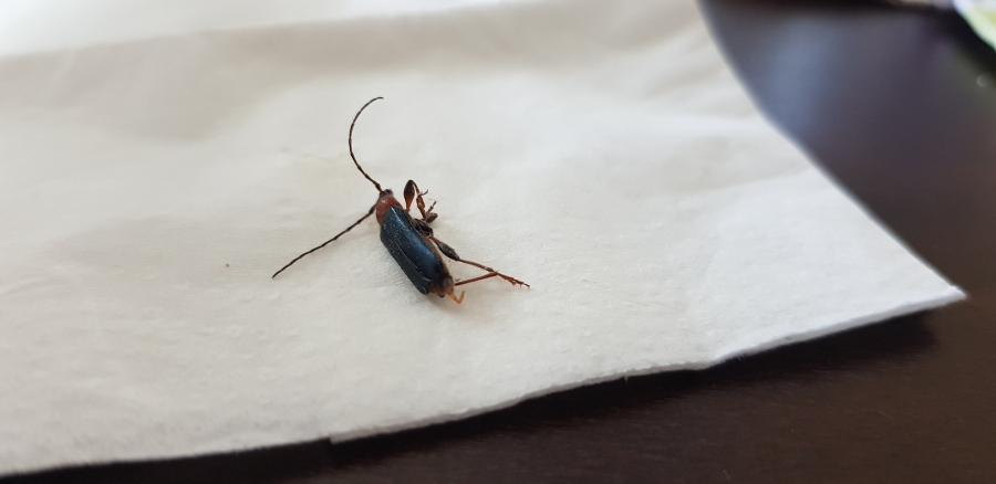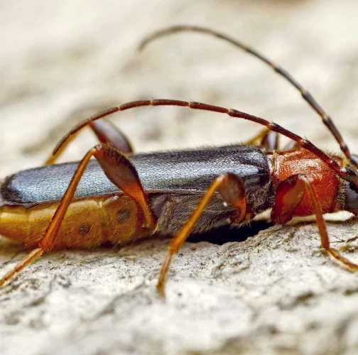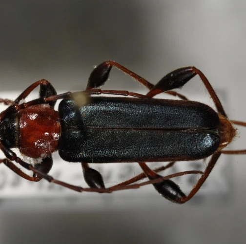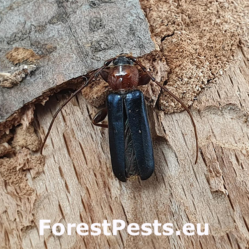 It is a relatively narrow beetle, 6 to 17 mm long. It can be very numerous and extremely variable in color. Often brown, brownish to almost black with a metallic blue sheen. The characteristic features are the thick thighs. Adults fly from June to July. Adults are very active and they are good flyers. Females lay eggs in the crevices of the bark. The larvae gnaw their corridors first under the bark, later they go 3 to 7 cm into the wood, where they pupate. Galleries can be found up to 4 cm in the wood. Excavation holes are elongate. There is one generation per year, in warm areas two generation per year.