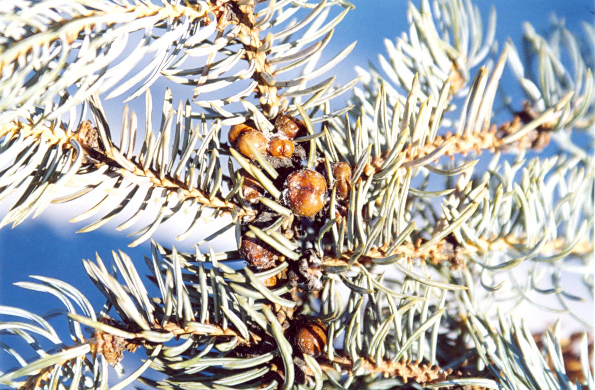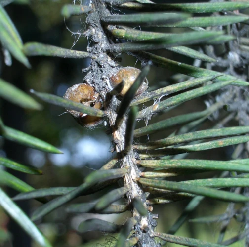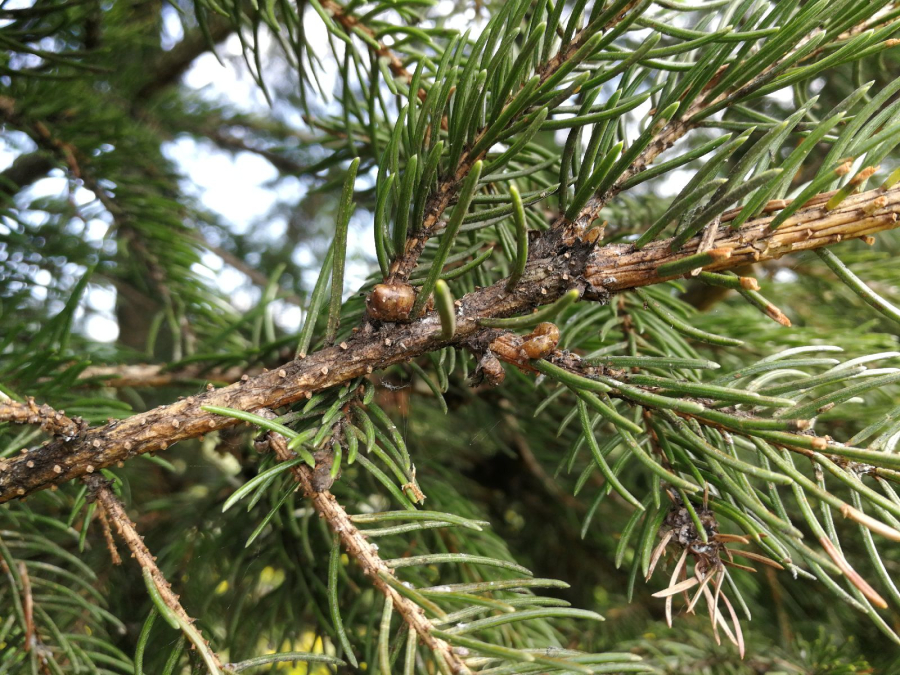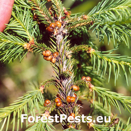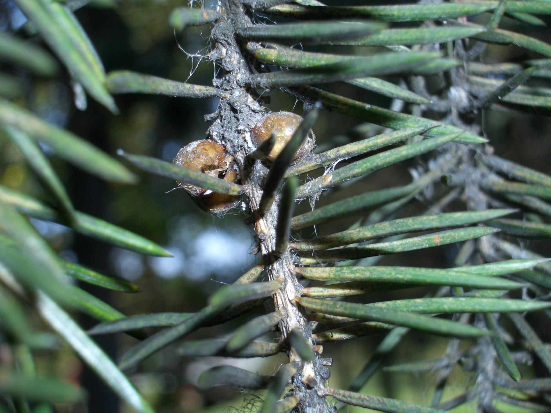 Twigs of spruce species may show distinctive “brown galls”. These are, in fact, adult females of the pest.