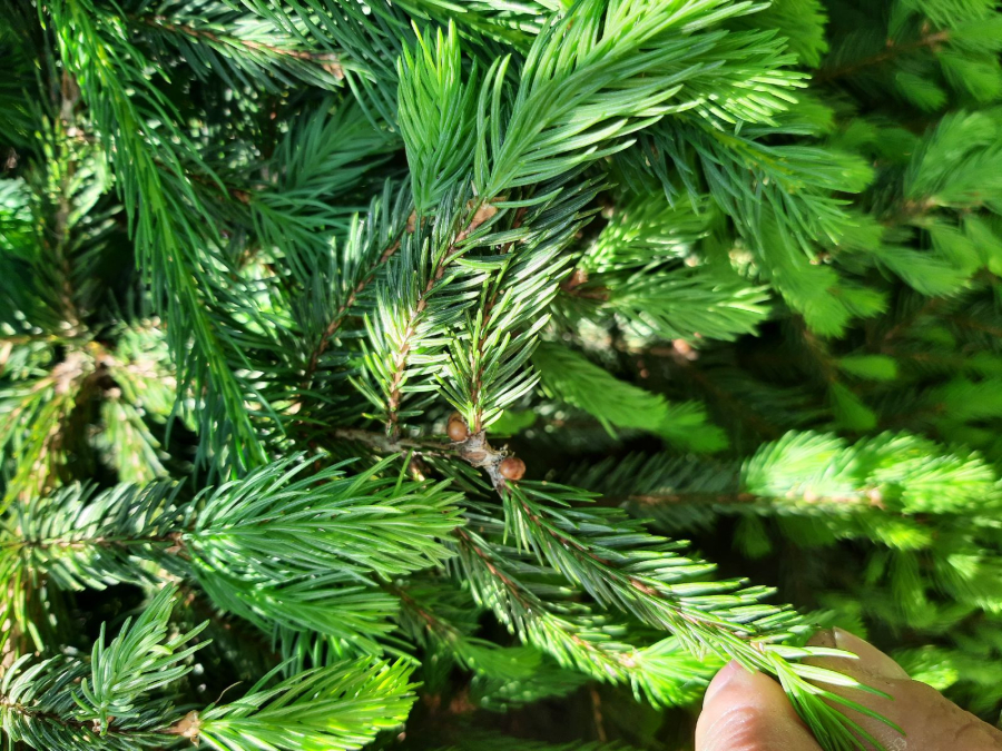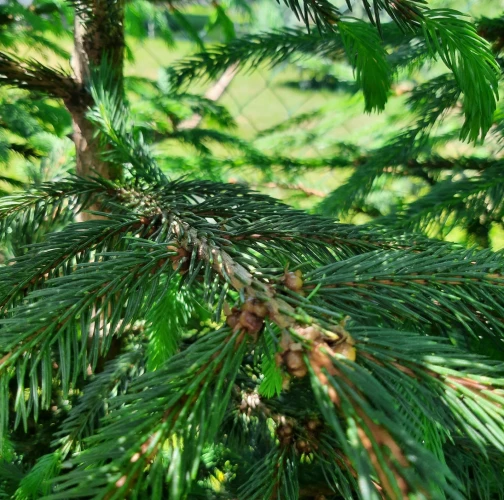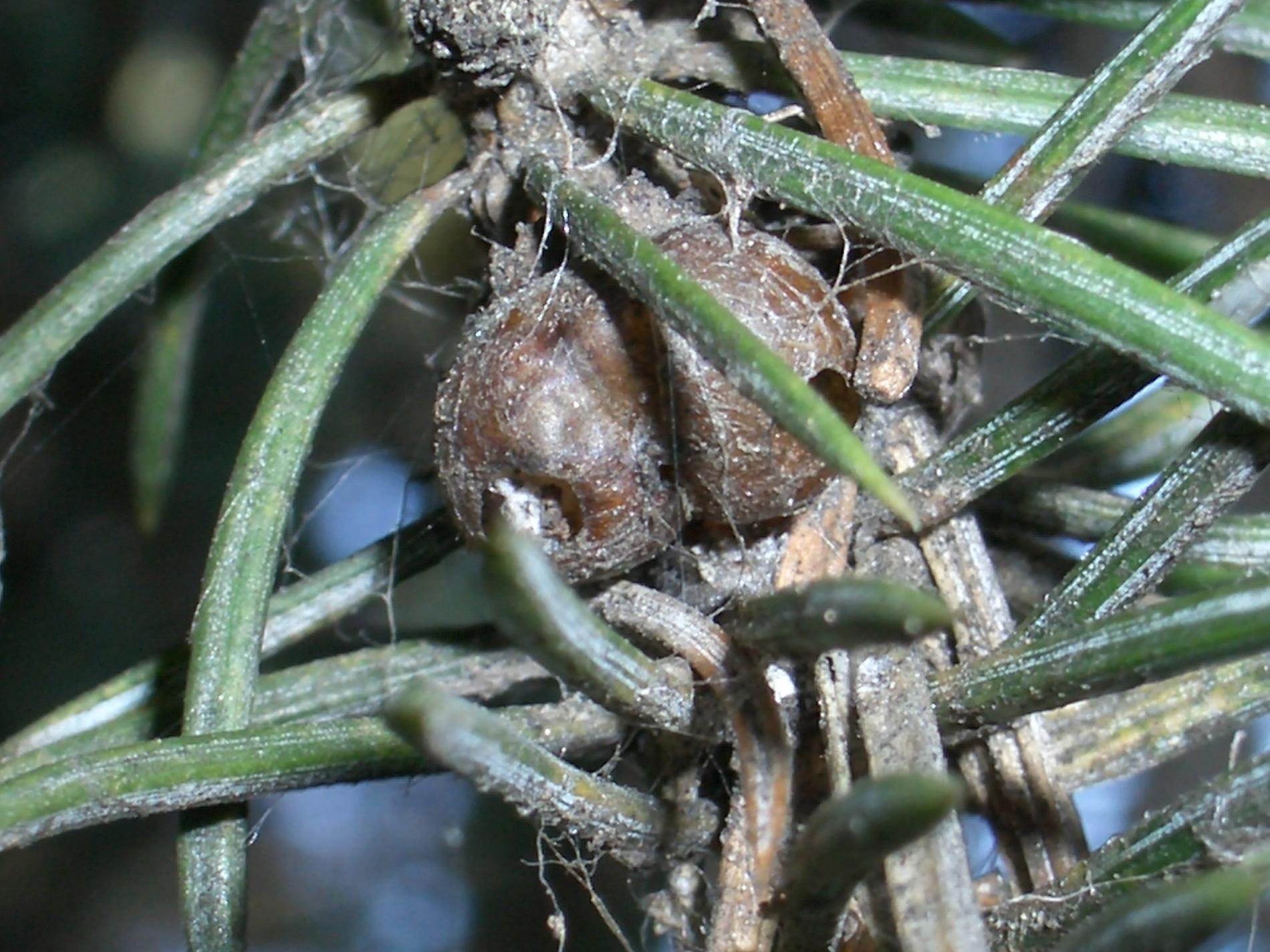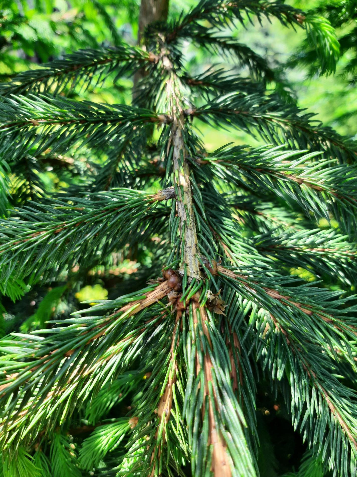 Twigs of spruce species may show distinctive “brown galls”. These are, in fact, adult females of the pest.