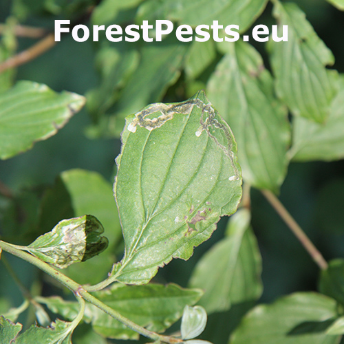 Phytomyza agromyzina is a leaf-mining fly that affects Cornus spp. (dogwoods). The larvae create serpentine mines on the upper surface of the leaves. As they feed, the frass partly liquifies, forming a broad dark-brown central band within the mine. Pupation typically occurs outside the mine, though the puparium is sometimes found within it. Mines are observed from June to October. Although the mining causes cosmetic damage to the foliage, it generally does not significantly impact the health of established plants. Control measures, such as removing affected leaves or applying insecticides, are typically only needed in severe infestations. Regular monitoring is advised to prevent potential outbreaks.