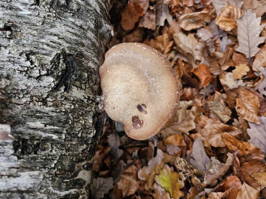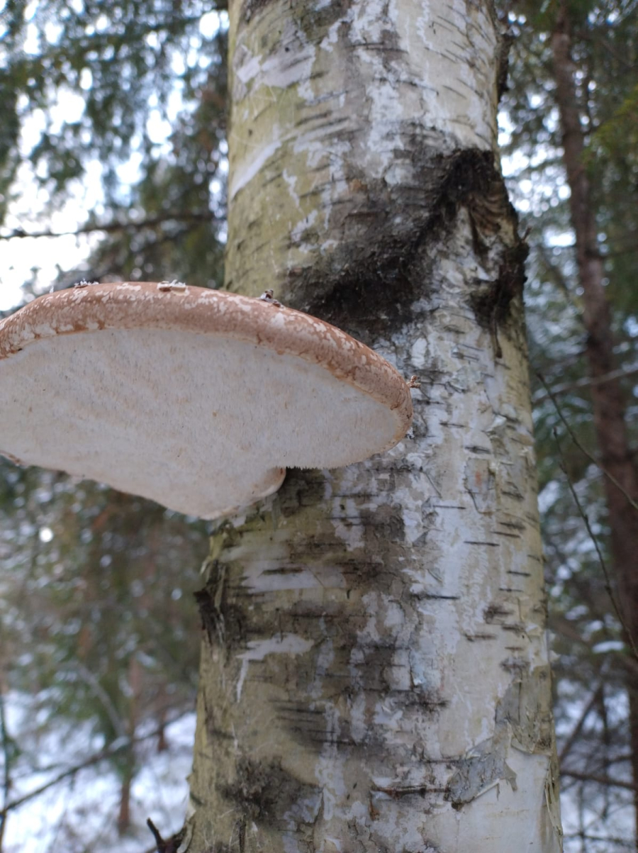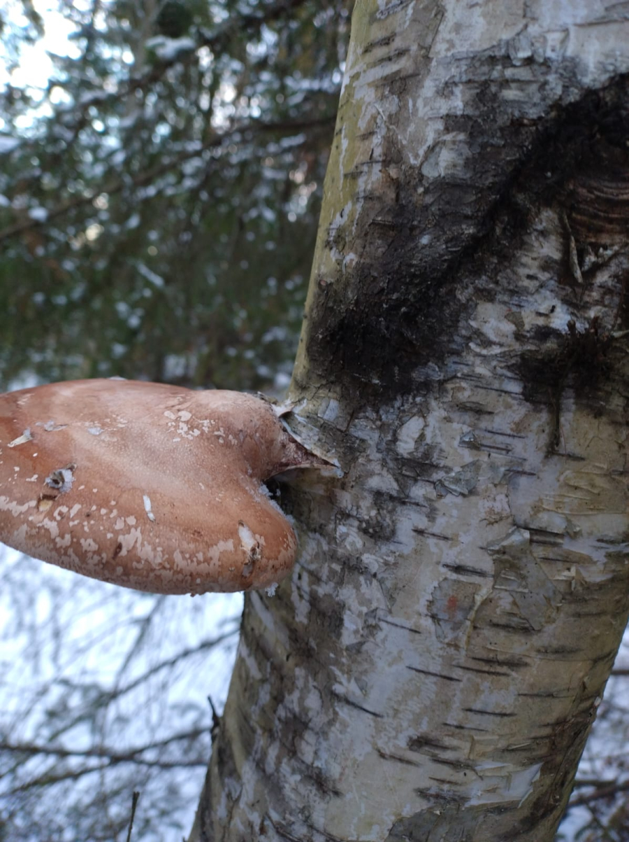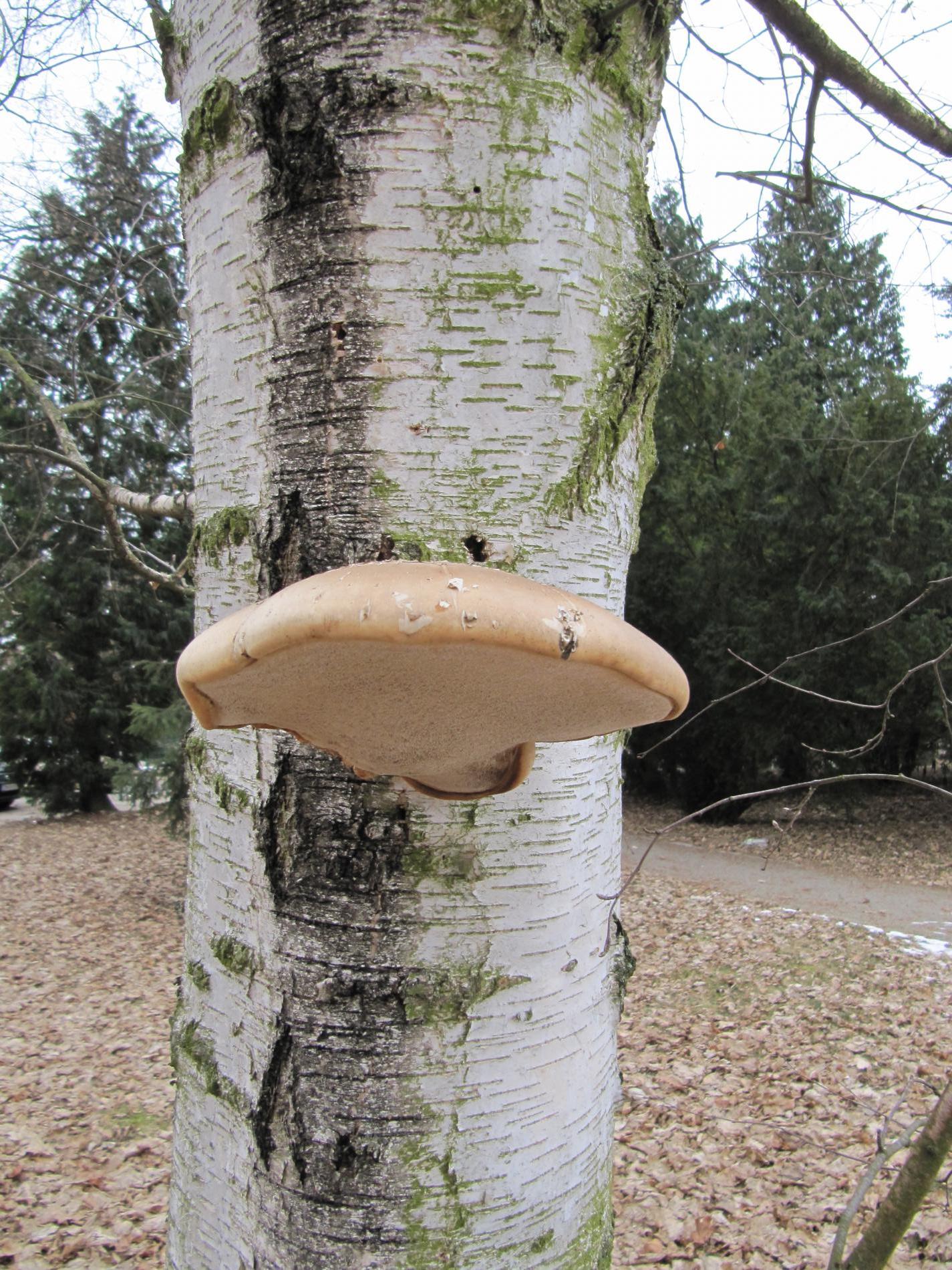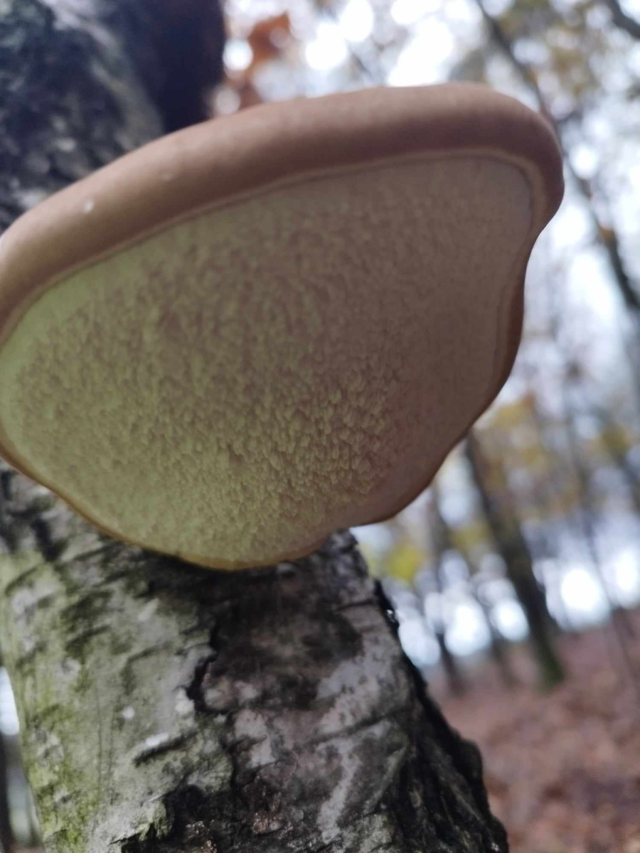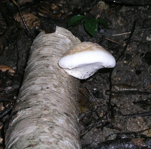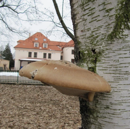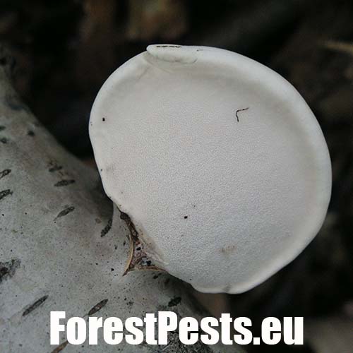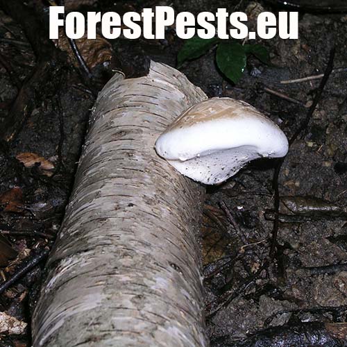 Infection of buttress, trunks and branches arises through wounds in bark and broken branches. After 2-3 years of parasiting, at the place of infection on the trunk surface grow annual fruiting bodies of the fungus. When young, the fruiting body is soft, with age it becomes cork-like hard. The upper side is covered with an ochre white paper-like membrane that later cracks irregularly. Pores are white to ochre. Especially weakened trees, e.g. by drought, shading and so on, are predisposed to infection. The mycelium causes reddish brown rot of attacked wood. Rotting wood is very frail, it breaks down in a cube-like way. The cracks are filled up with soft scraps of the creamy white mycelium.